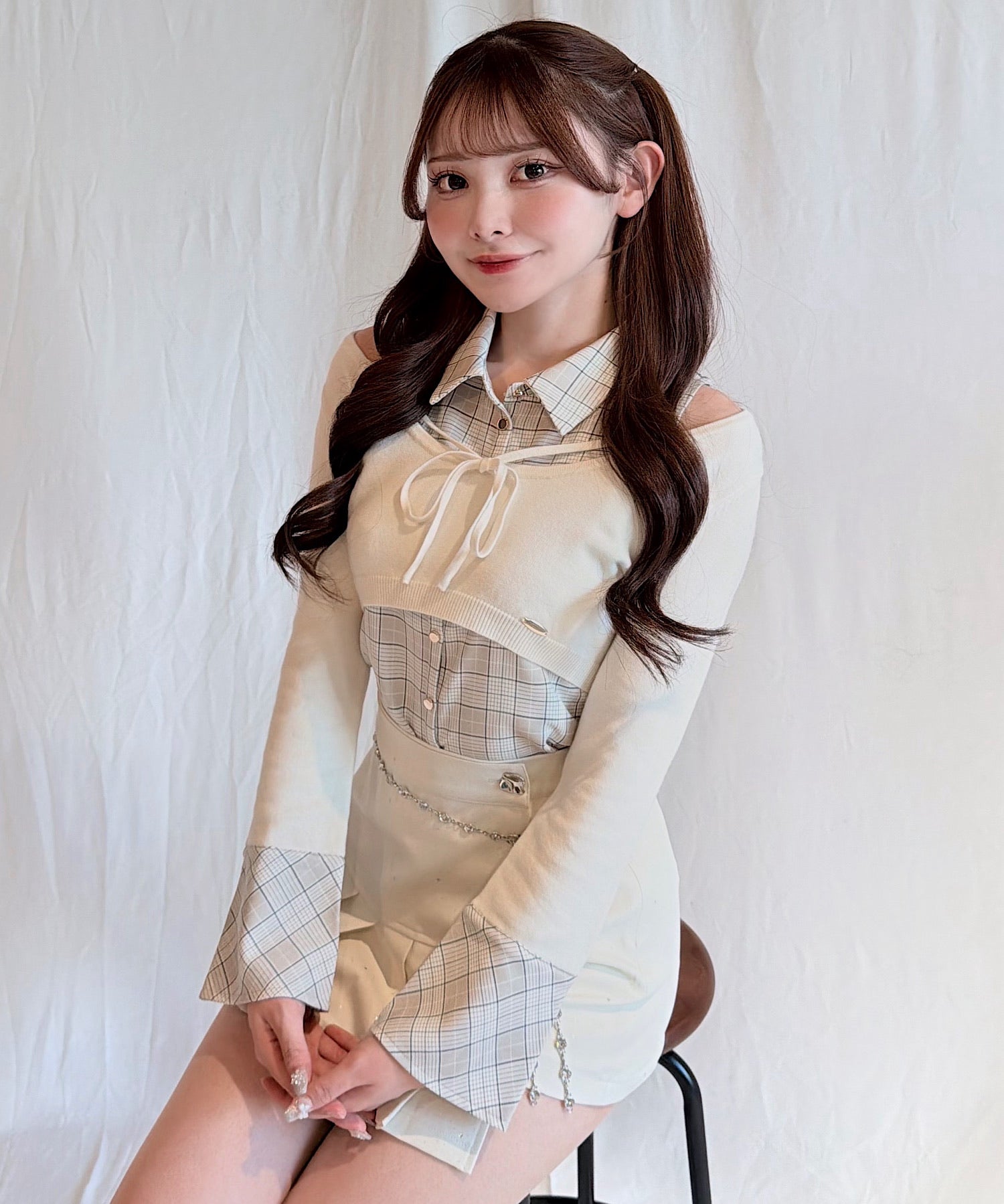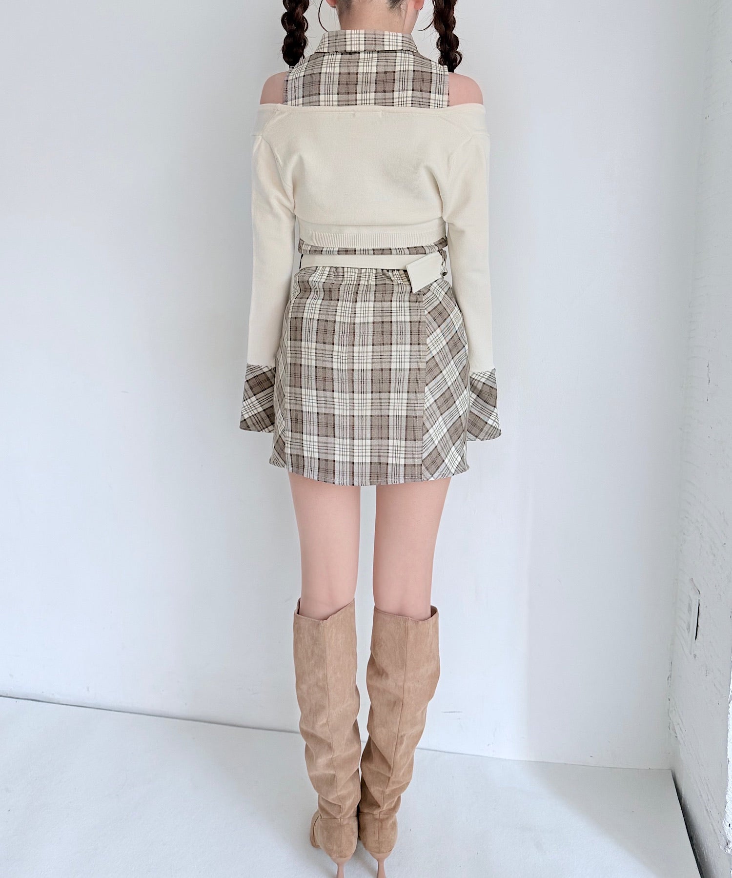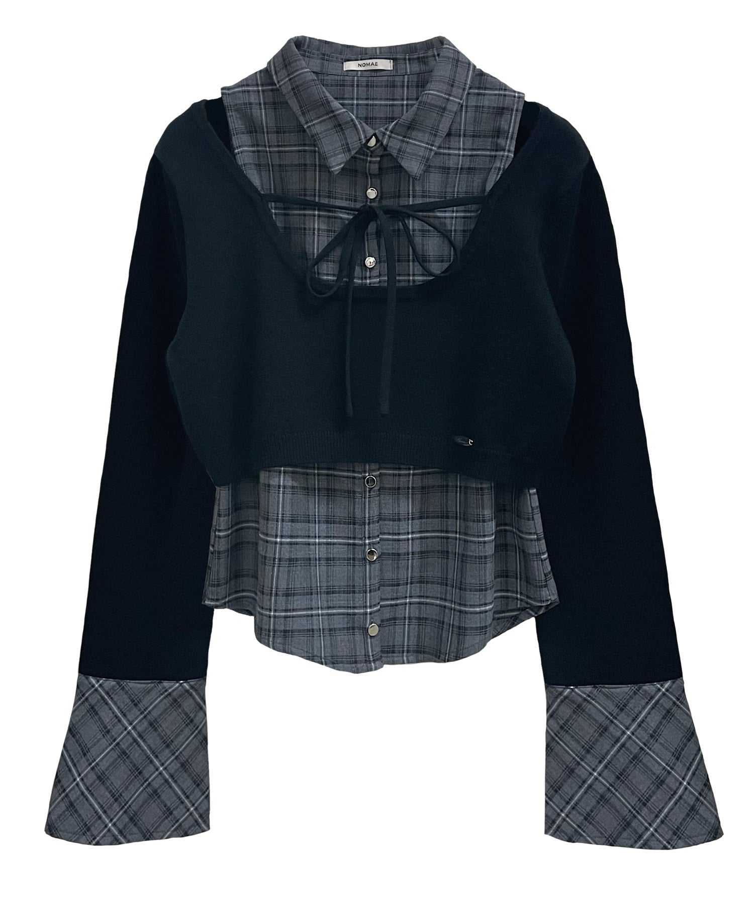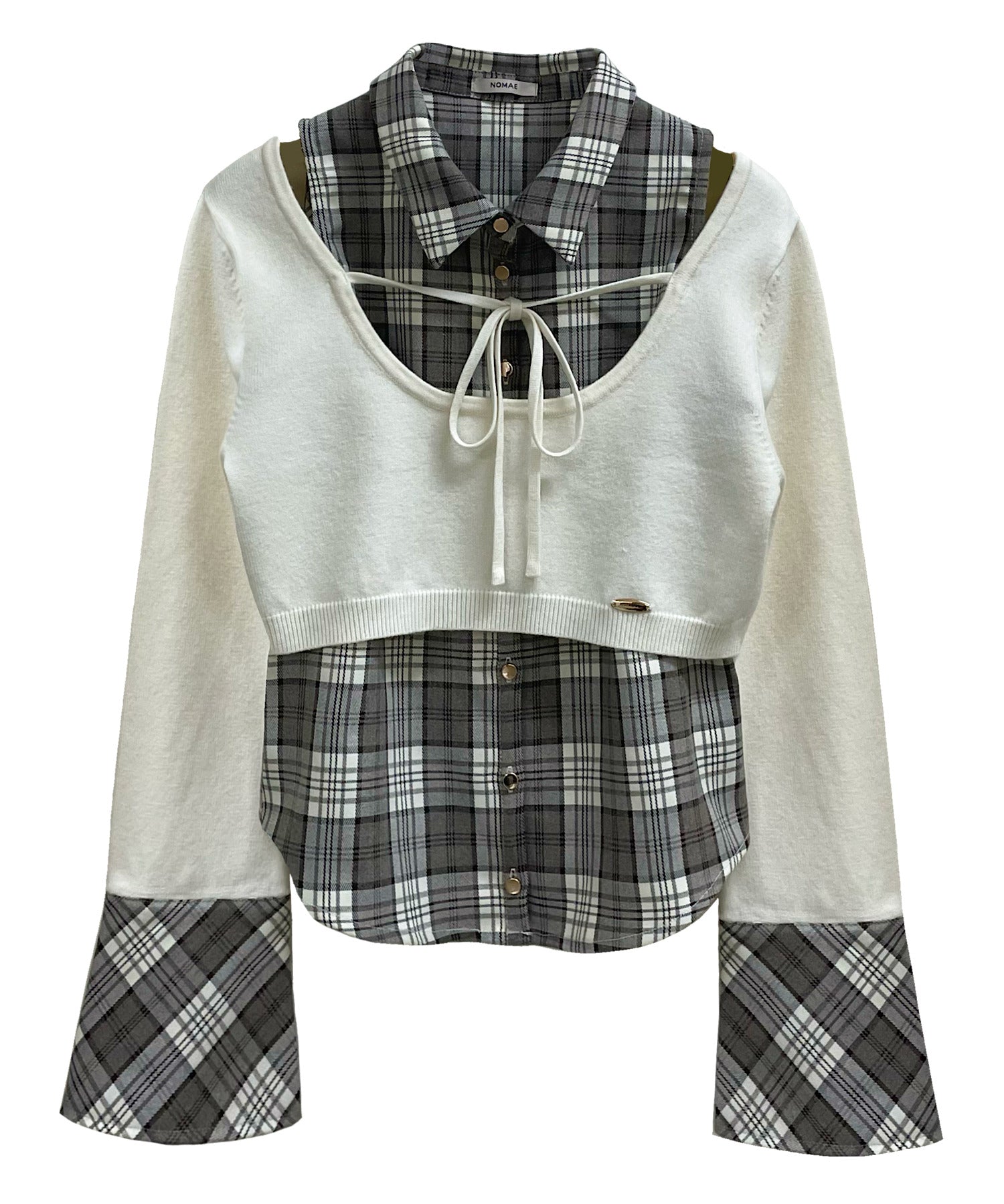 ・チェックのノースリーブシャツと袖がドッキングされたニットのセットトップス♬