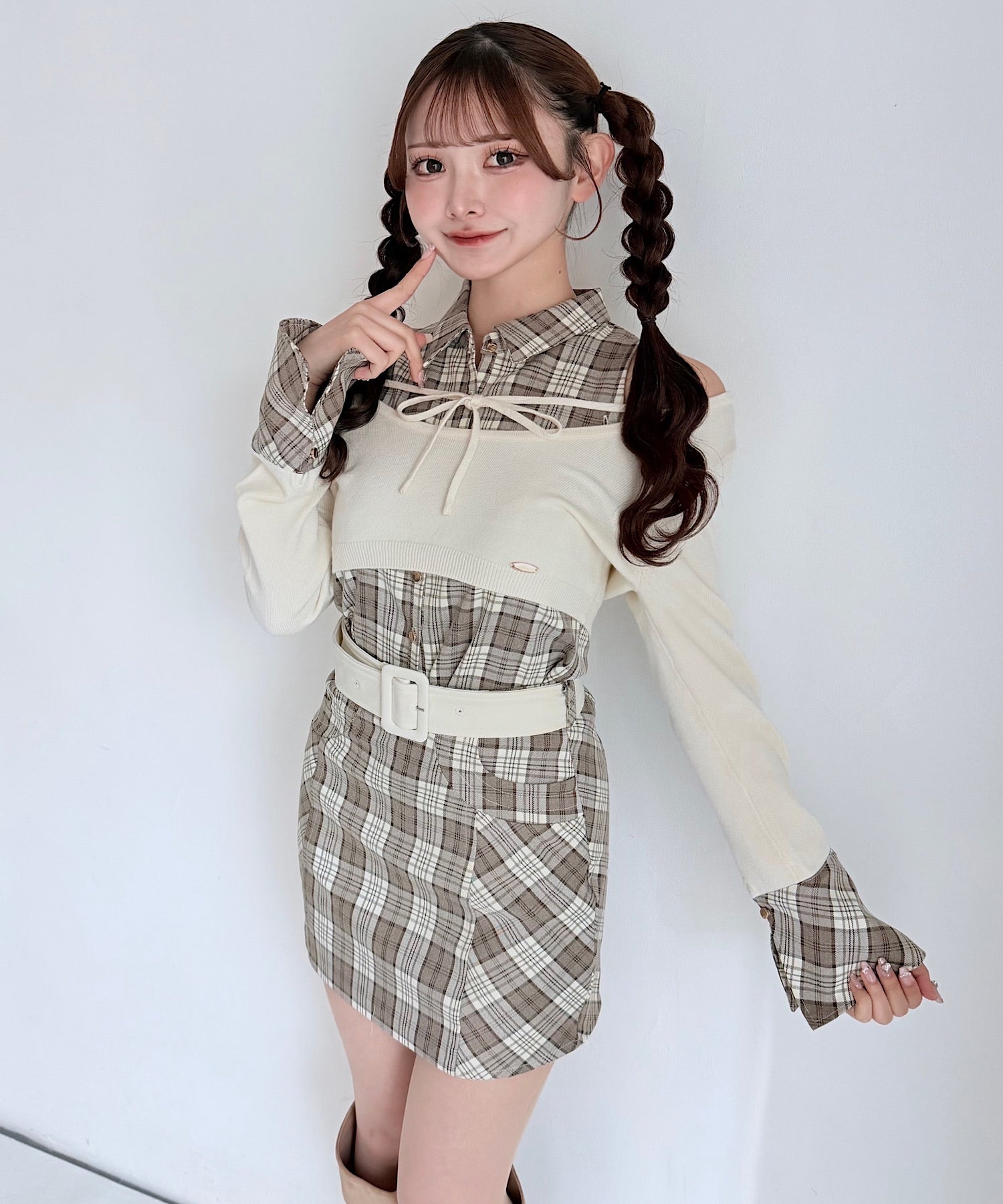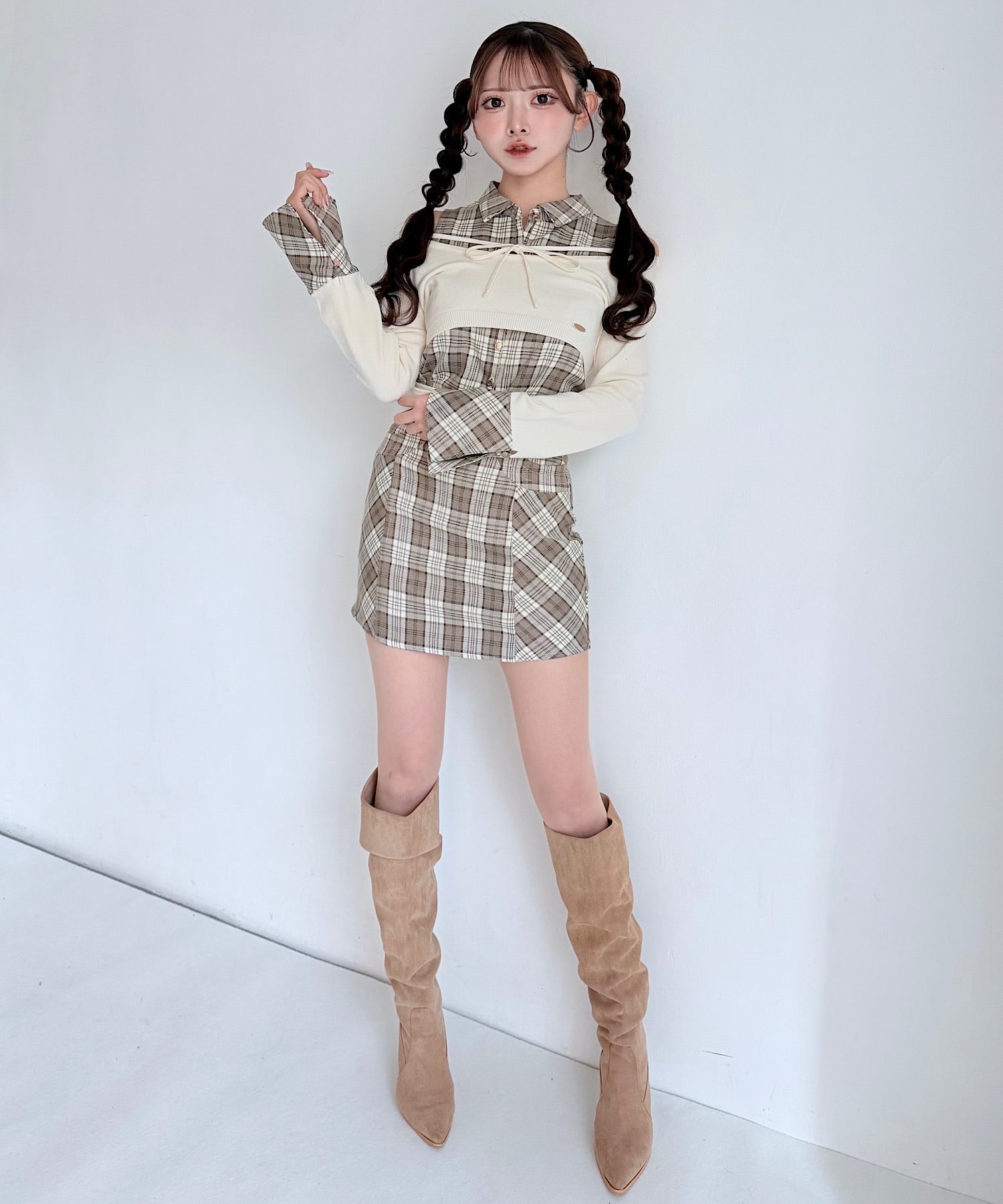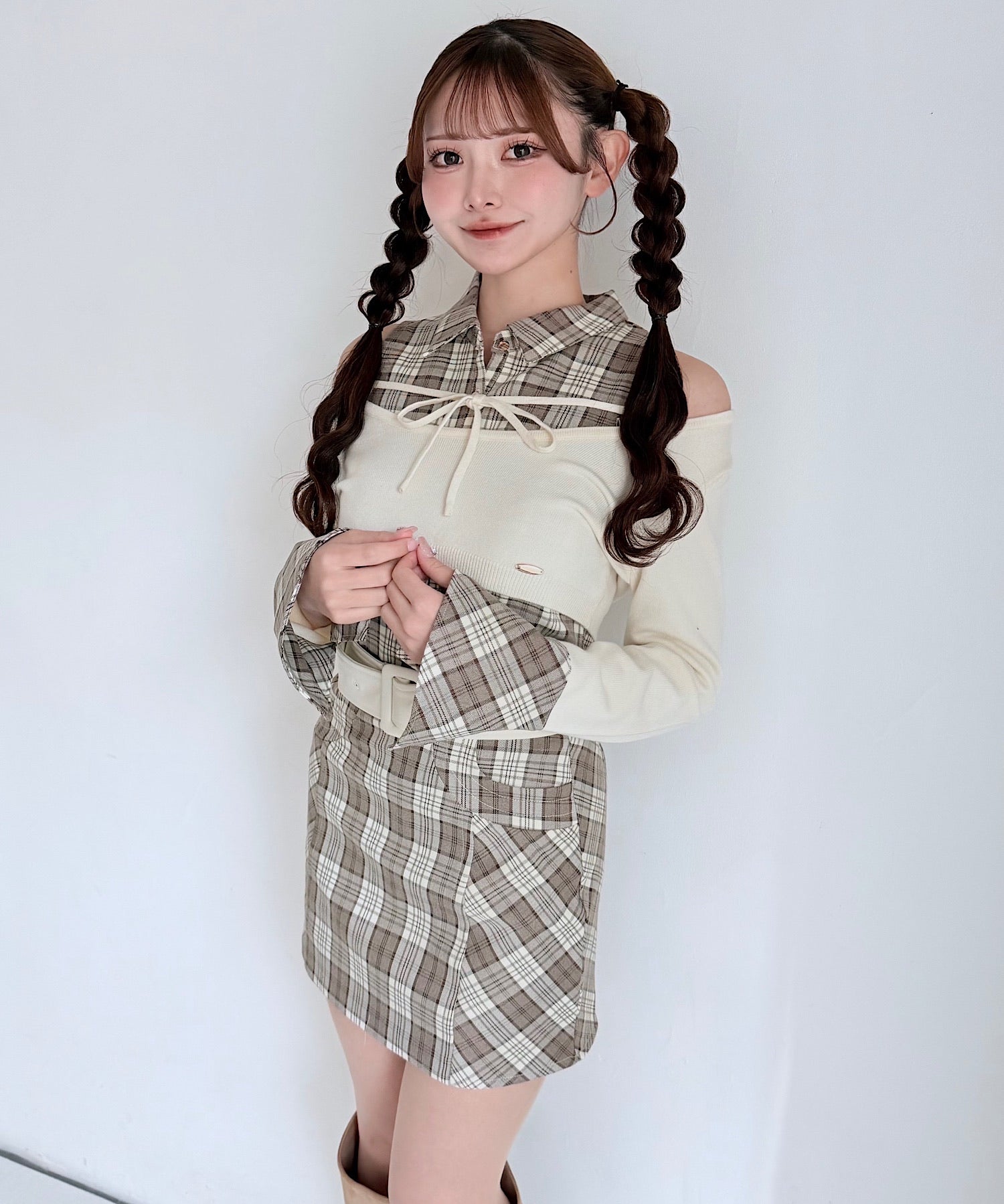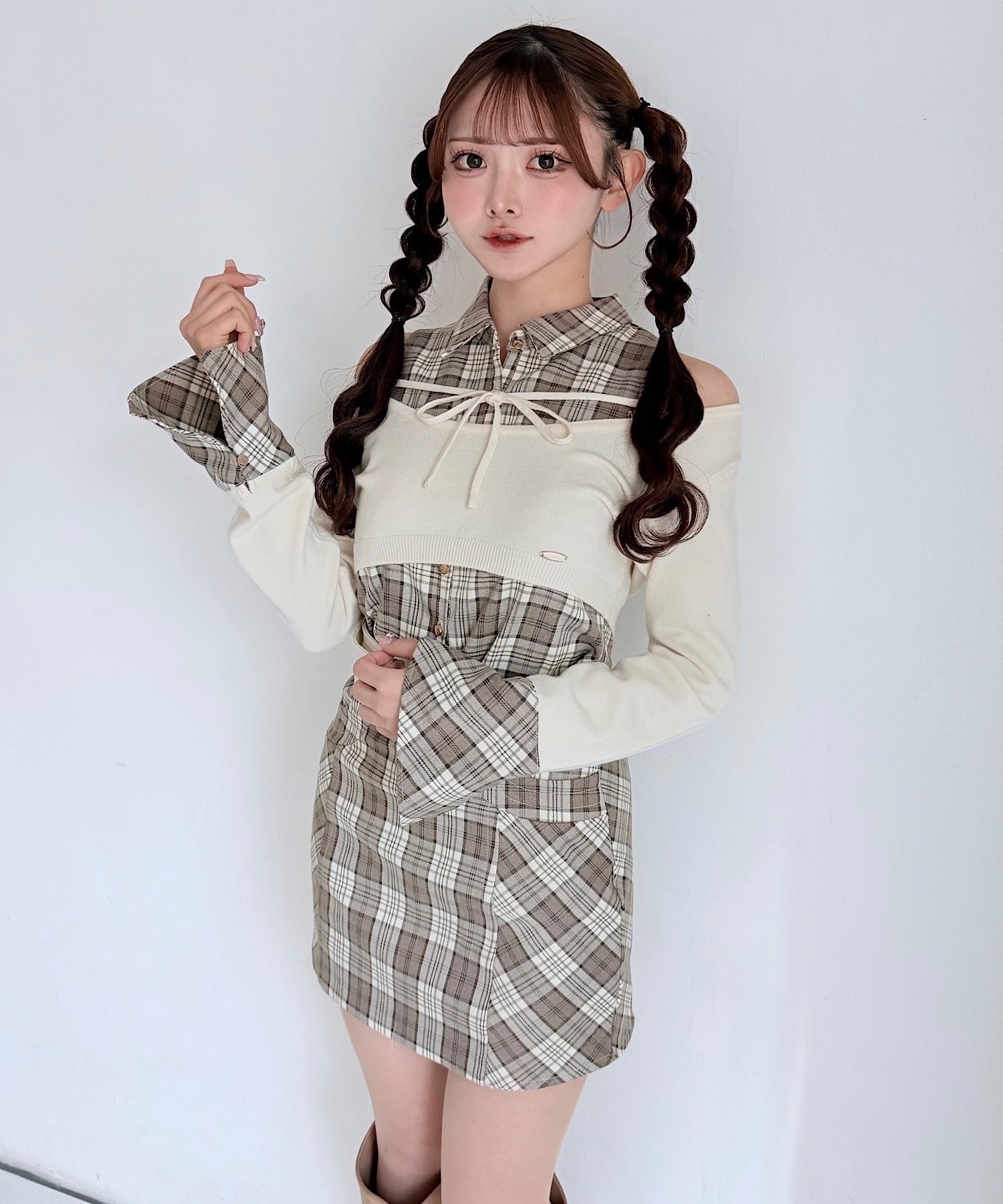 ・チェックのノースリーブシャツと袖がドッキングされたニットのセットトップス♬