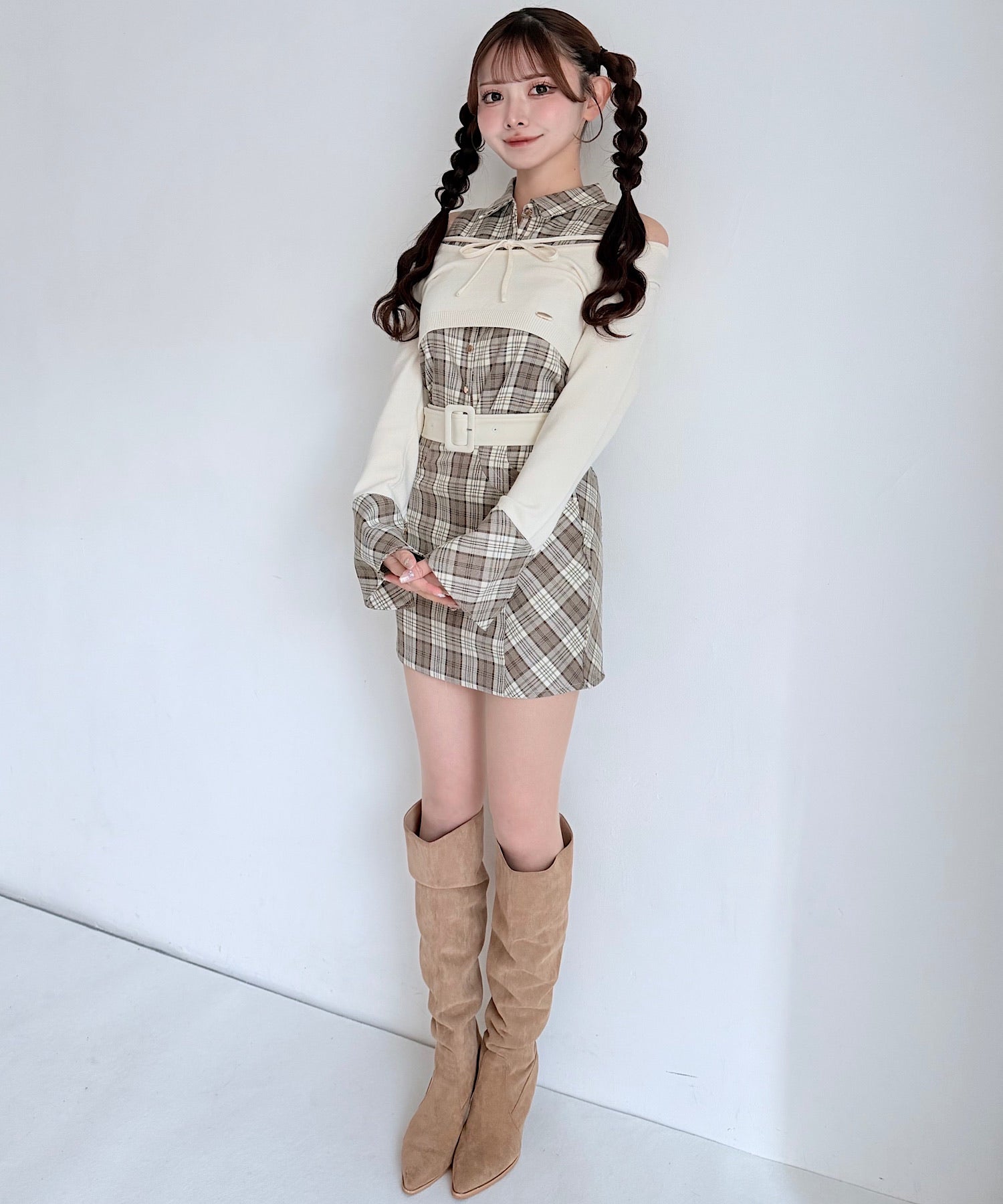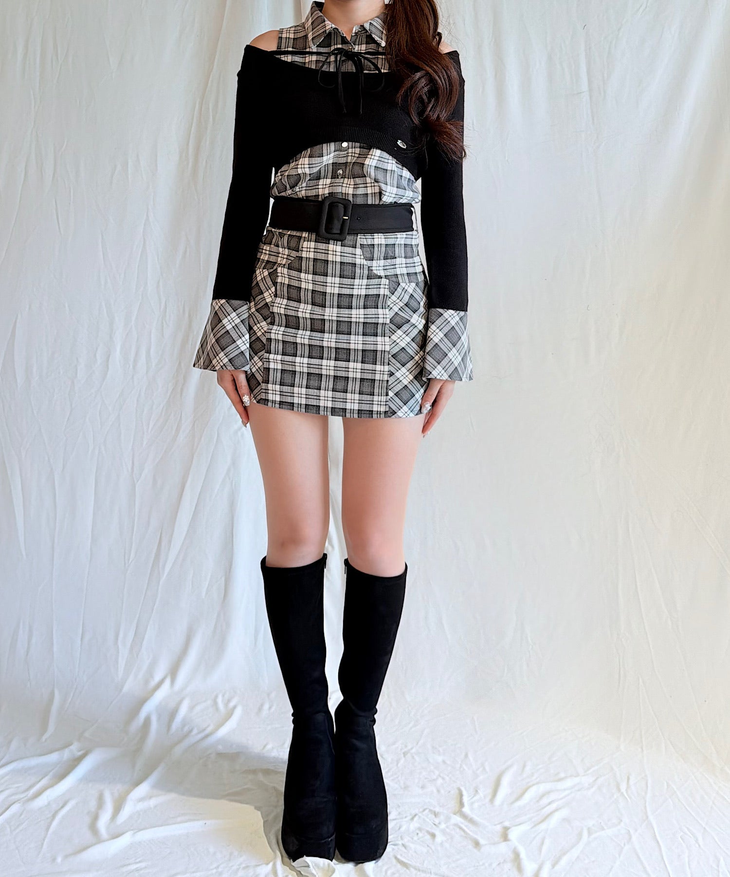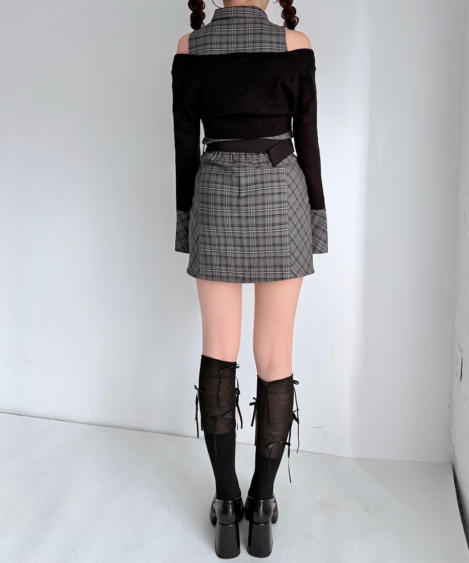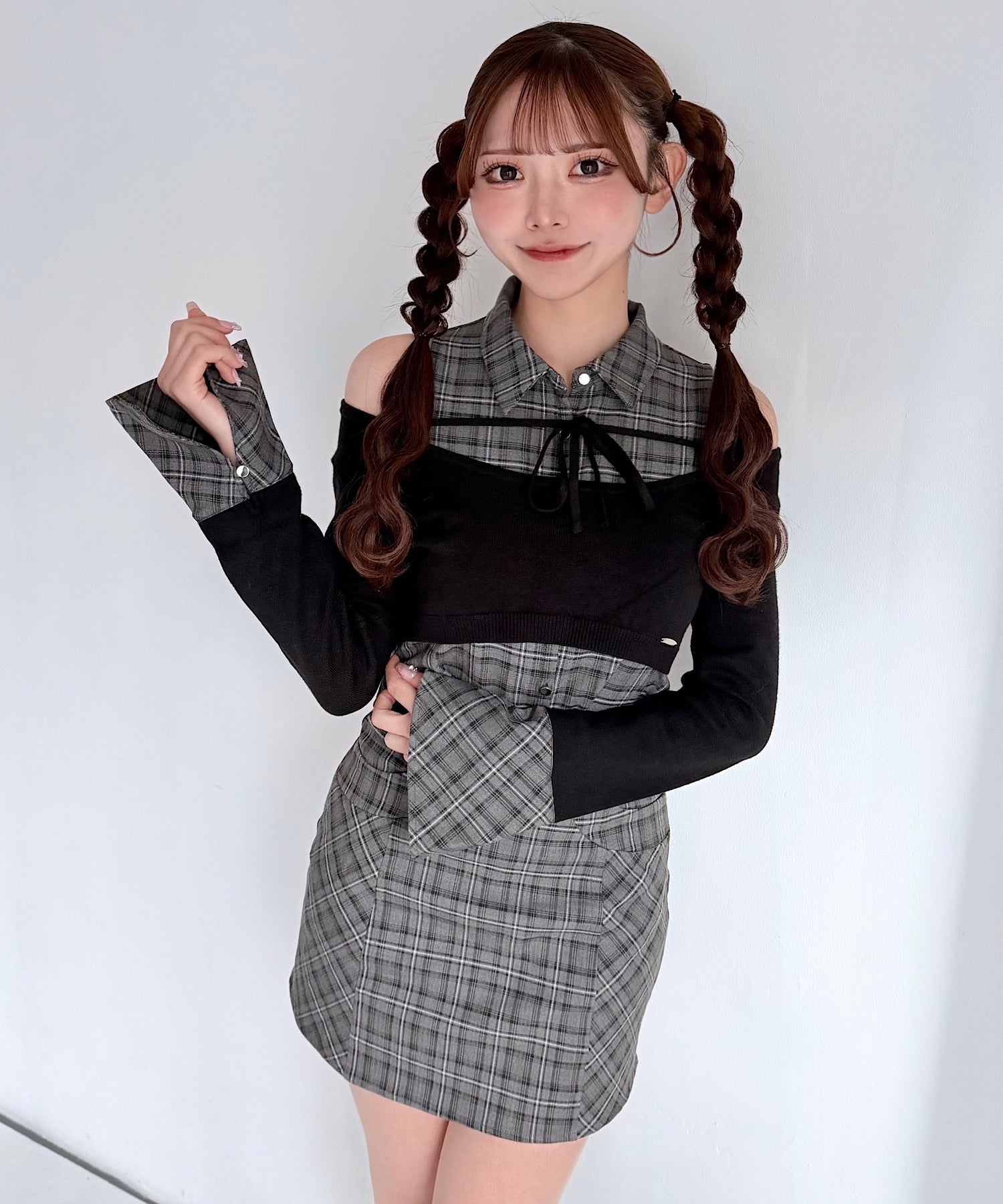 ・チェックのノースリーブシャツと袖がドッキングされたニットのセットトップス♬