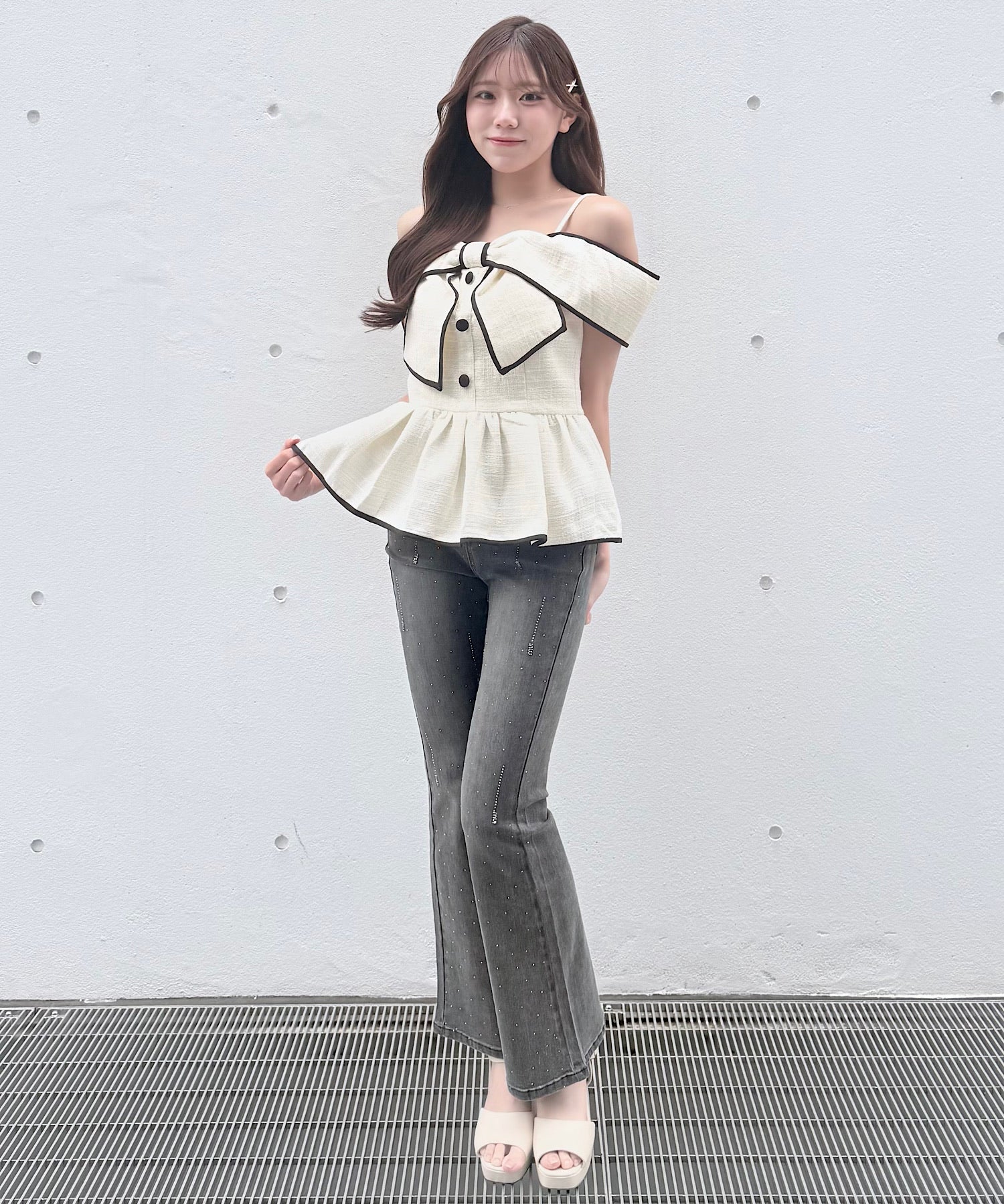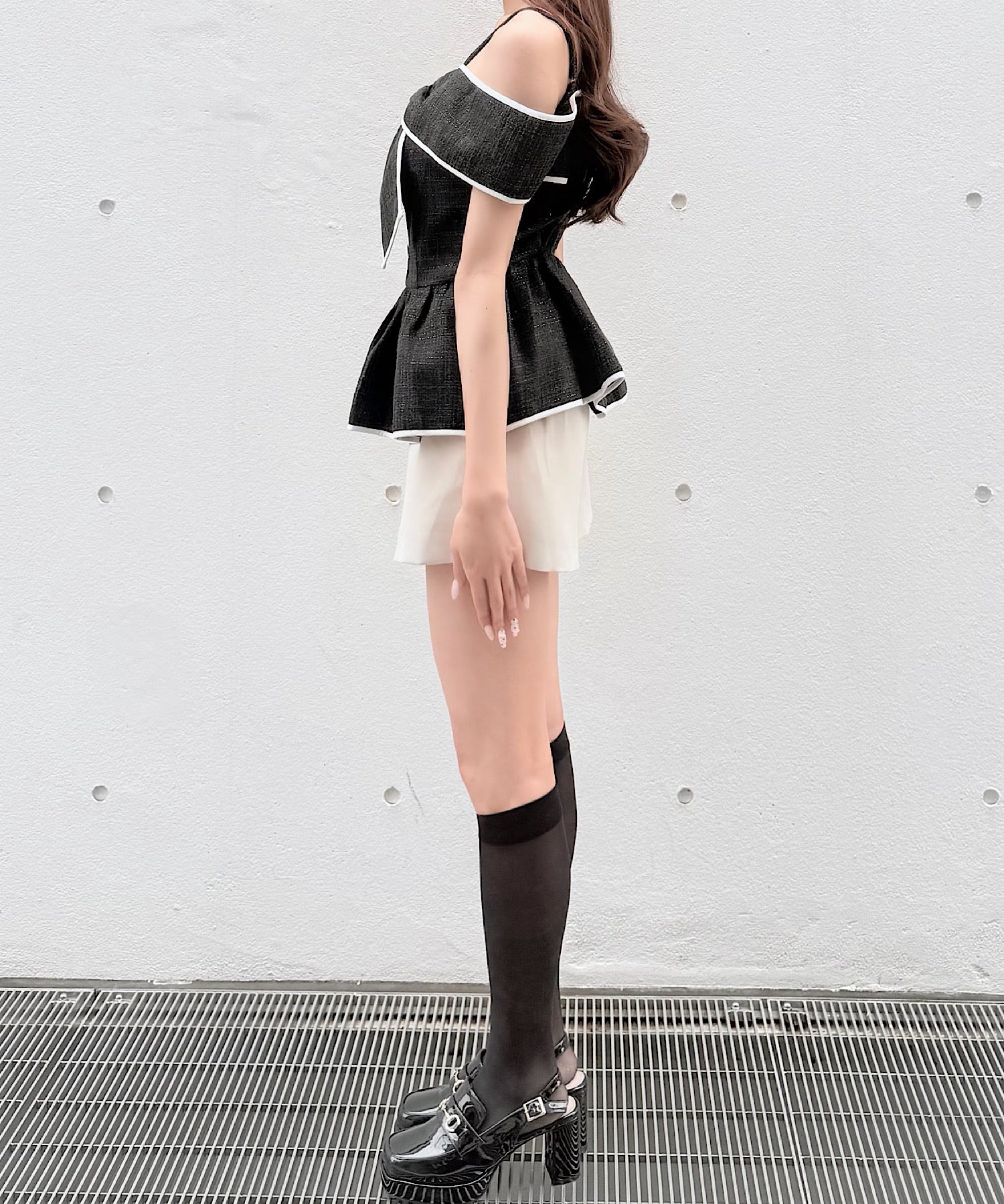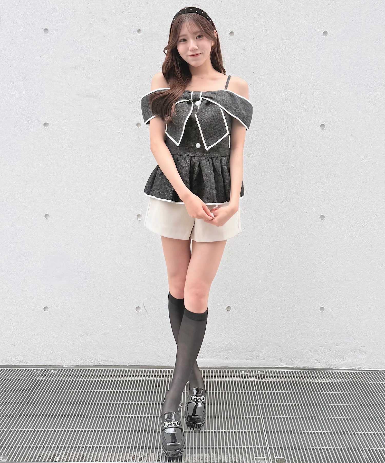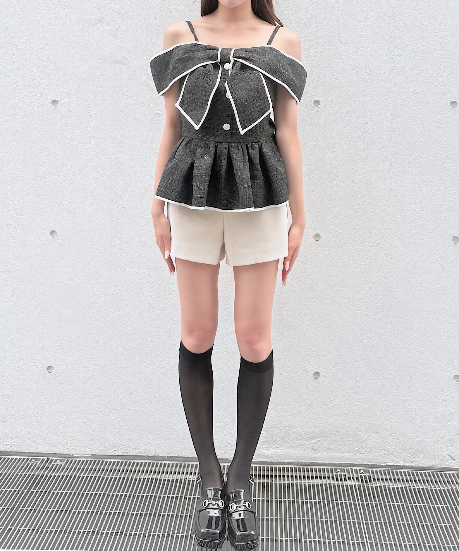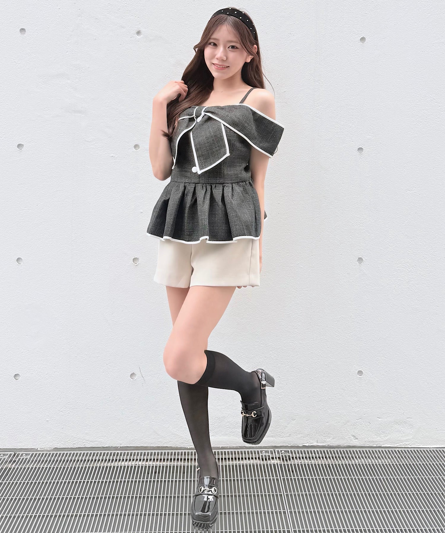 ・ミニスカートと合わせて、甘めでガーリーなスタイリングに。