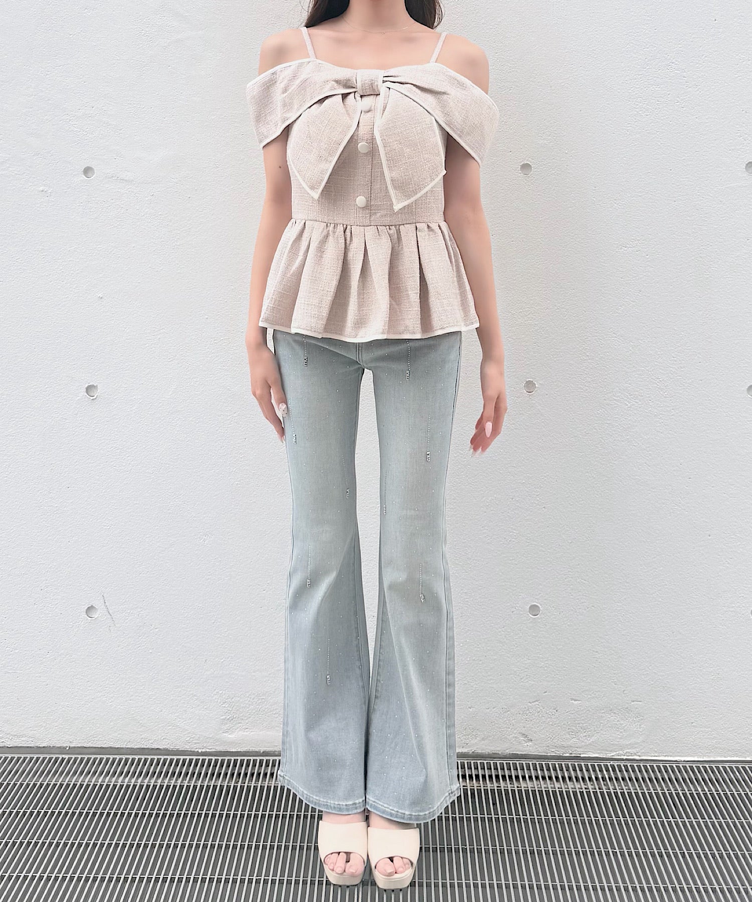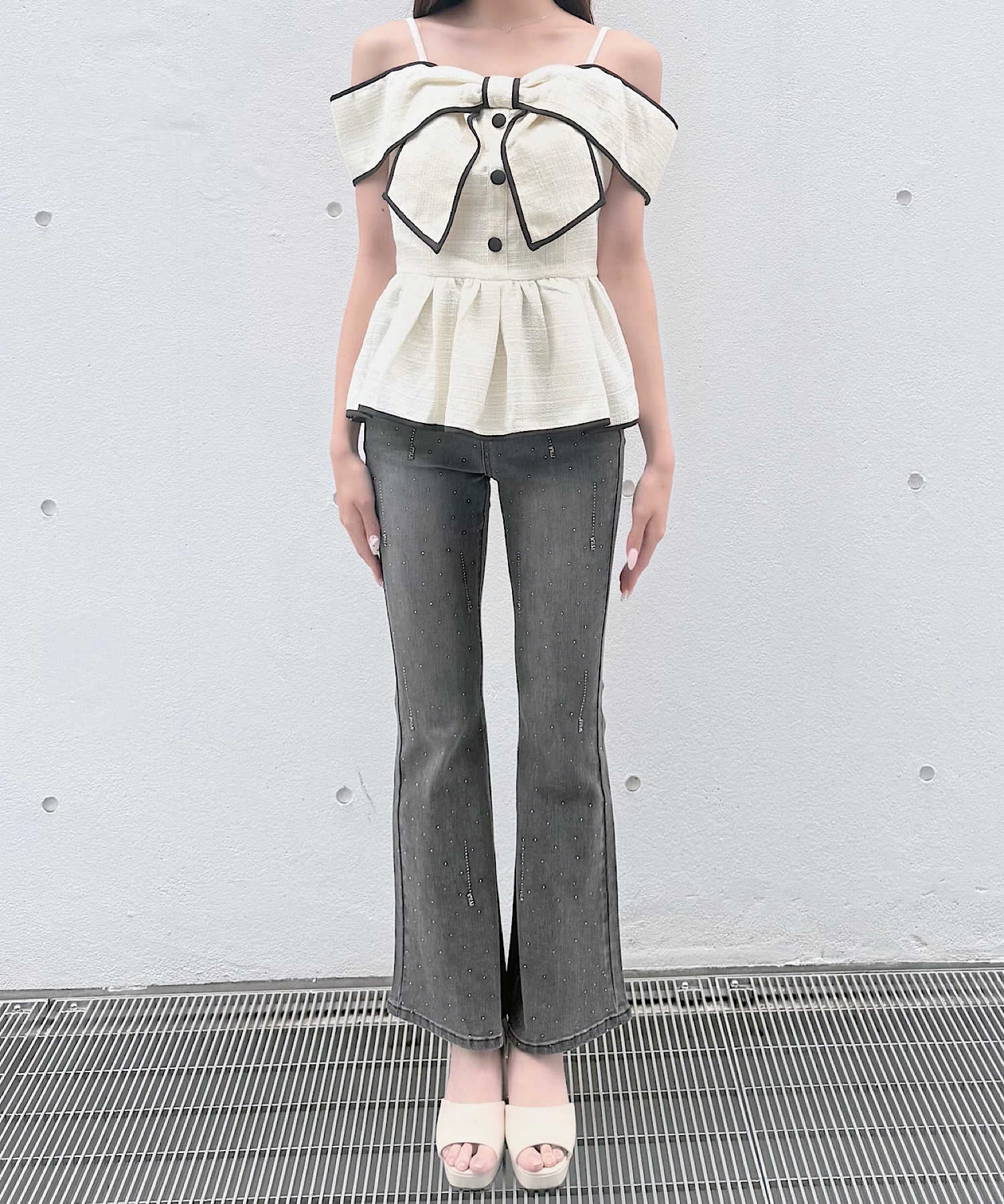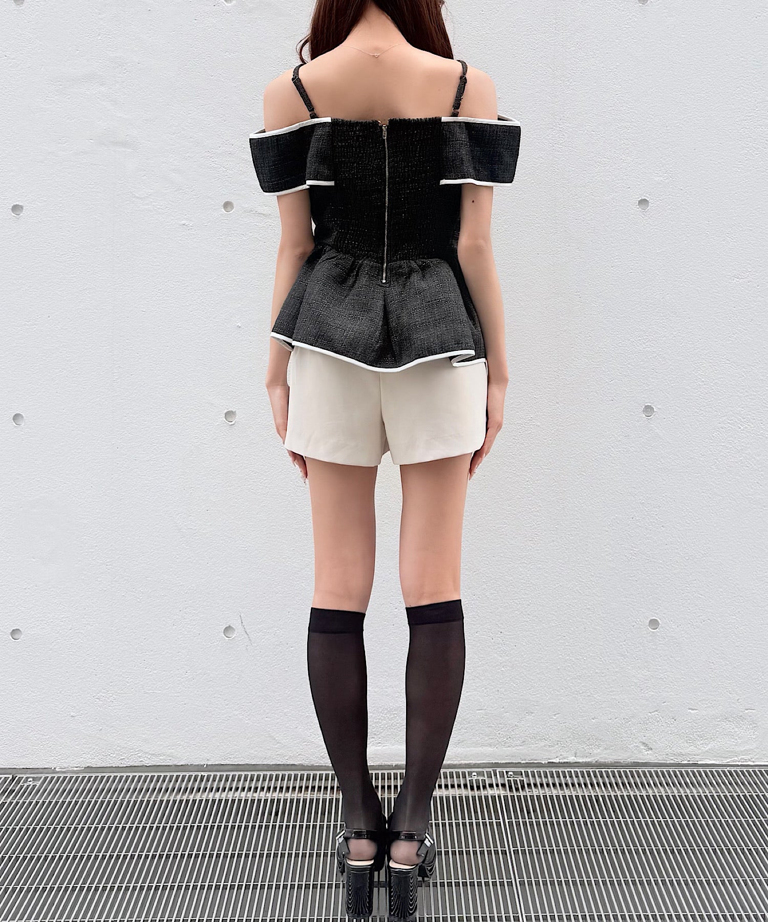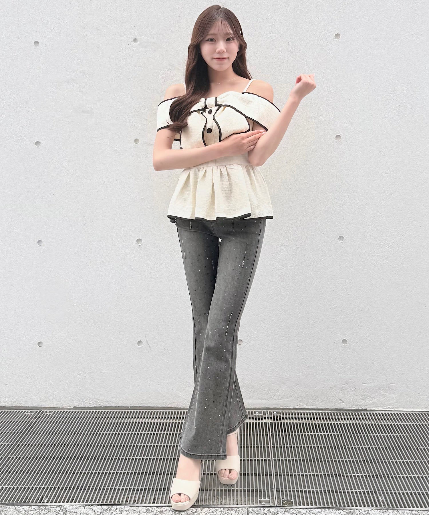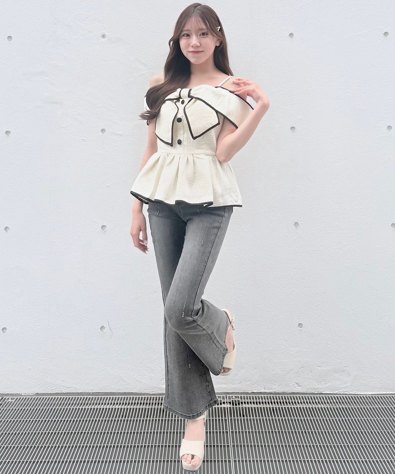 ・ミニスカートと合わせて、甘めでガーリーなスタイリングに。