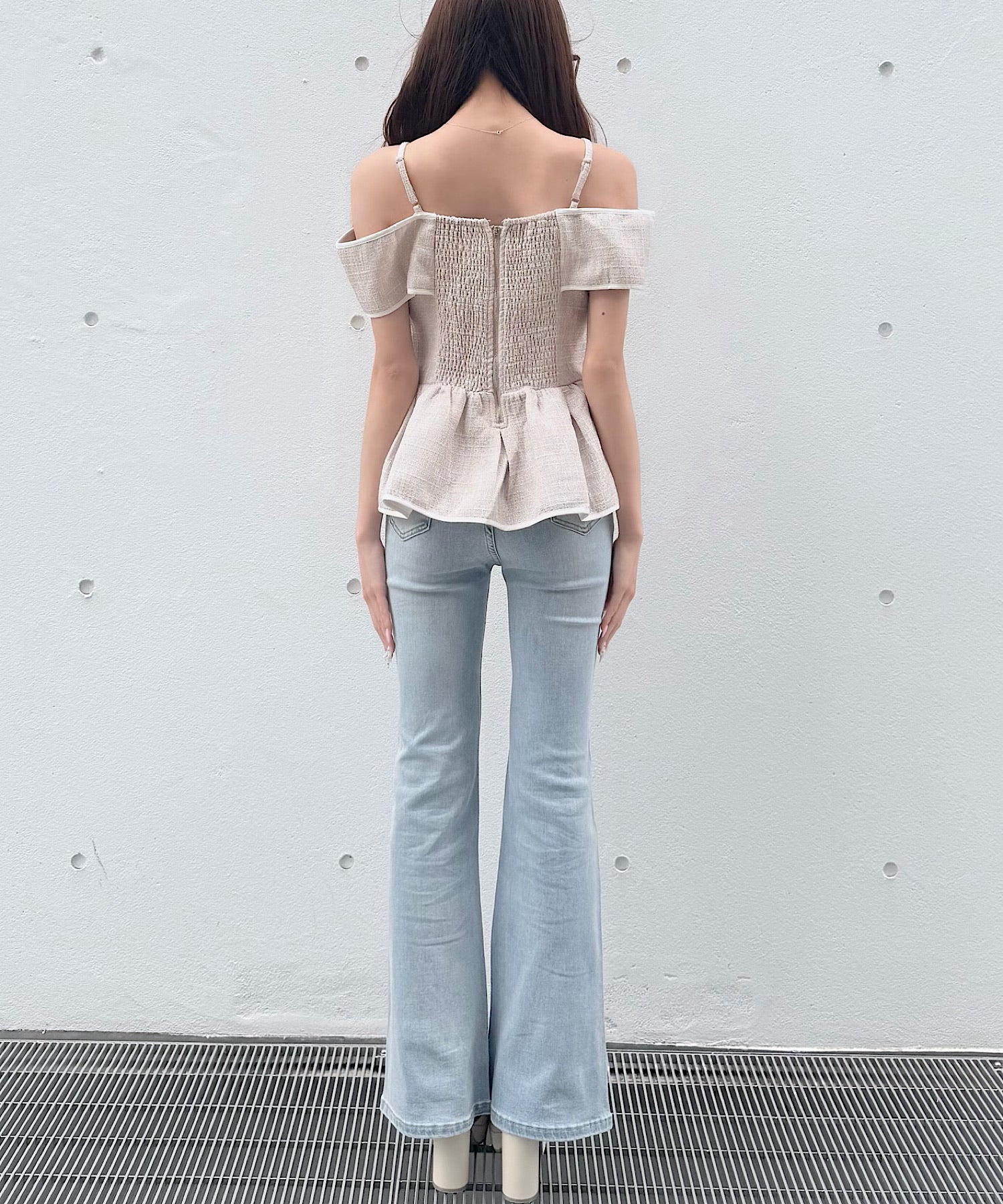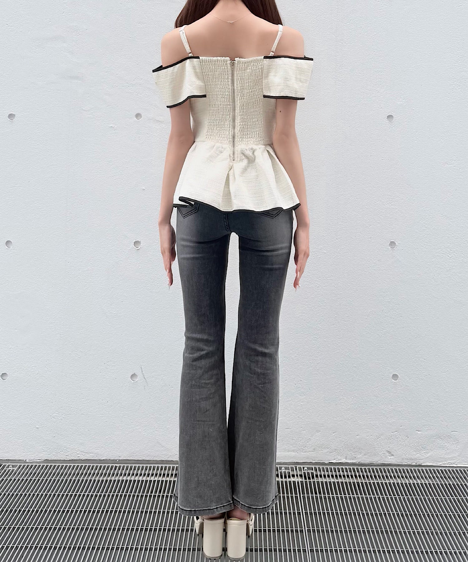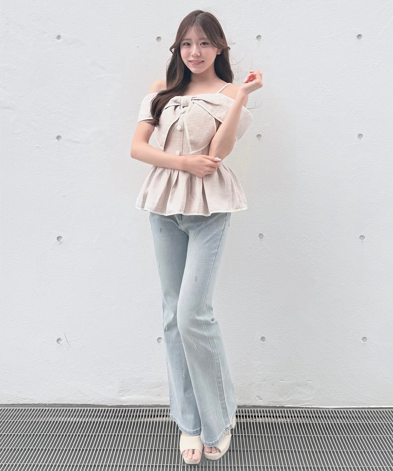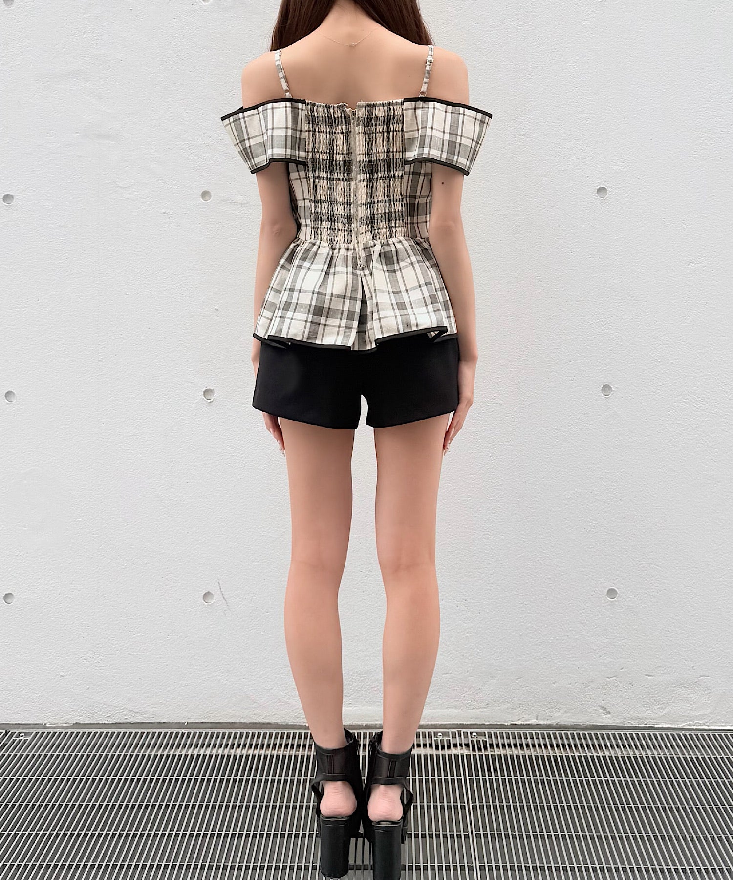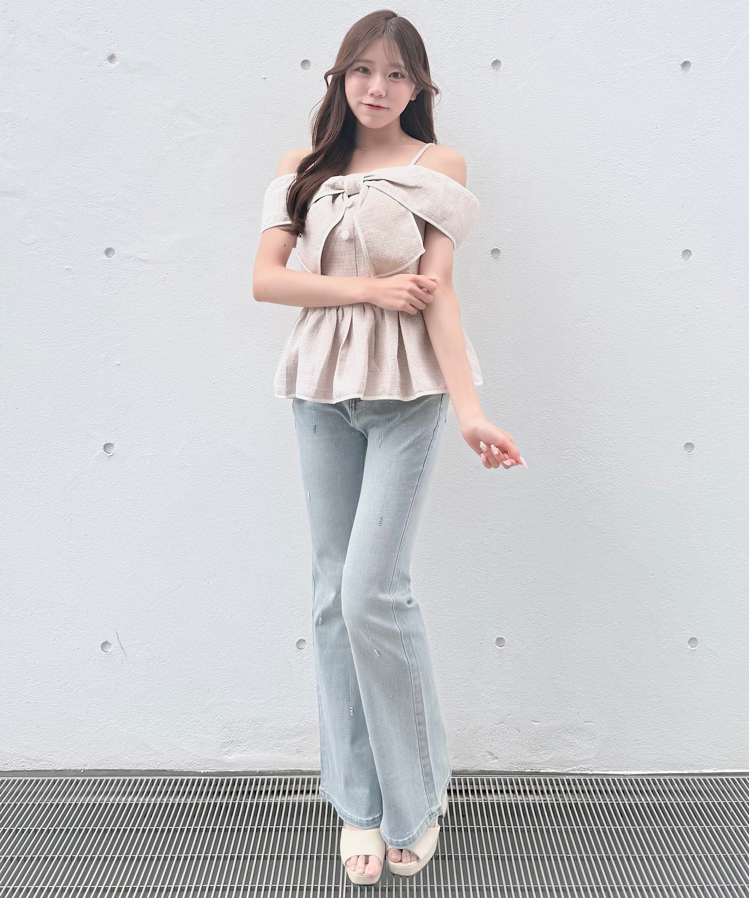 ・ミニスカートと合わせて、甘めでガーリーなスタイリングに。