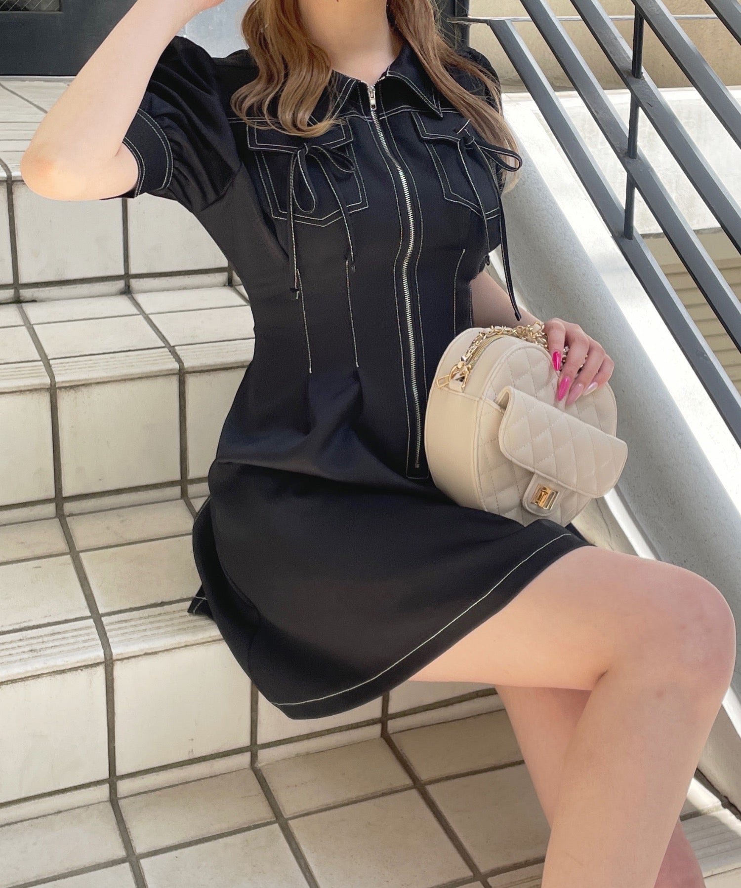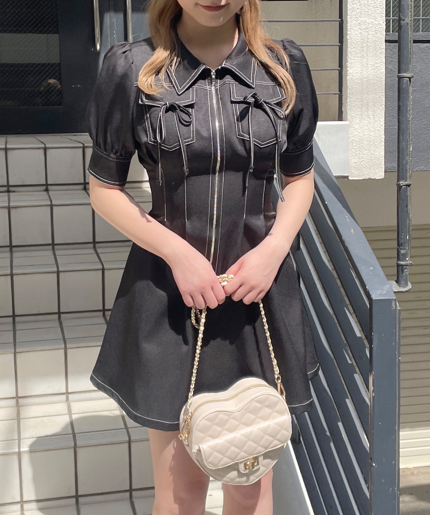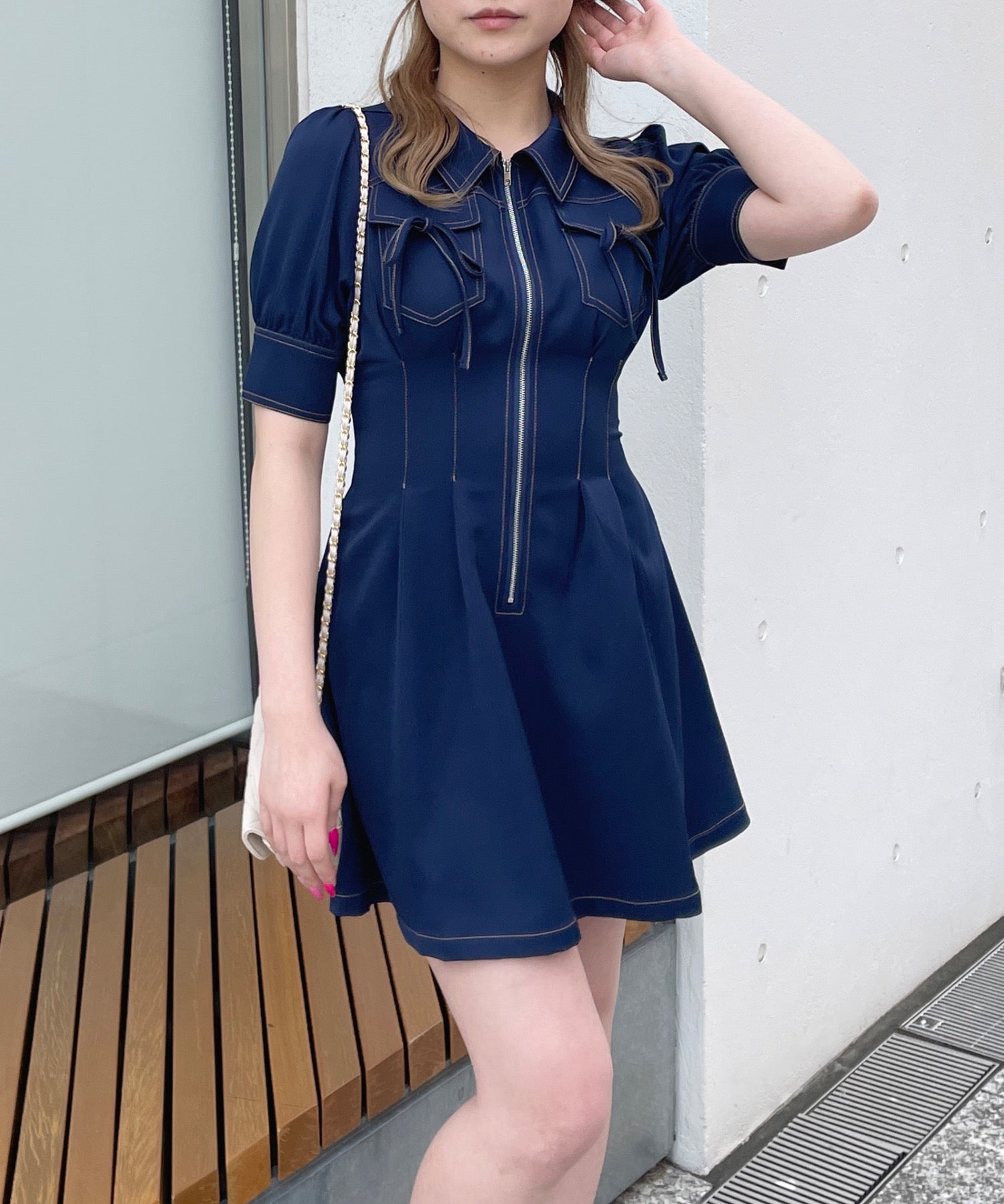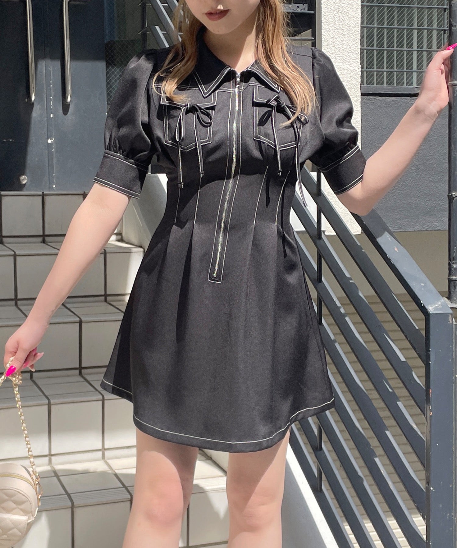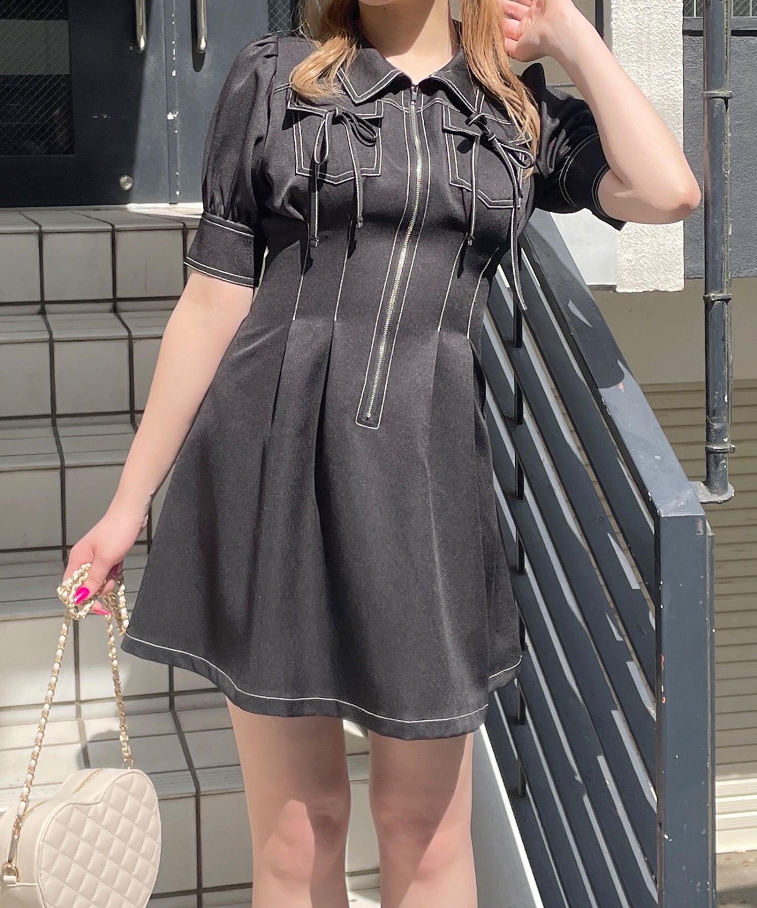 ・フロントのメタルジップが甘くなりすぎないリボンデザインのワンピースが登場♪