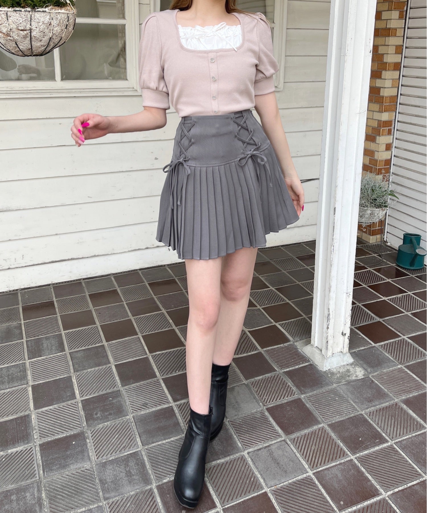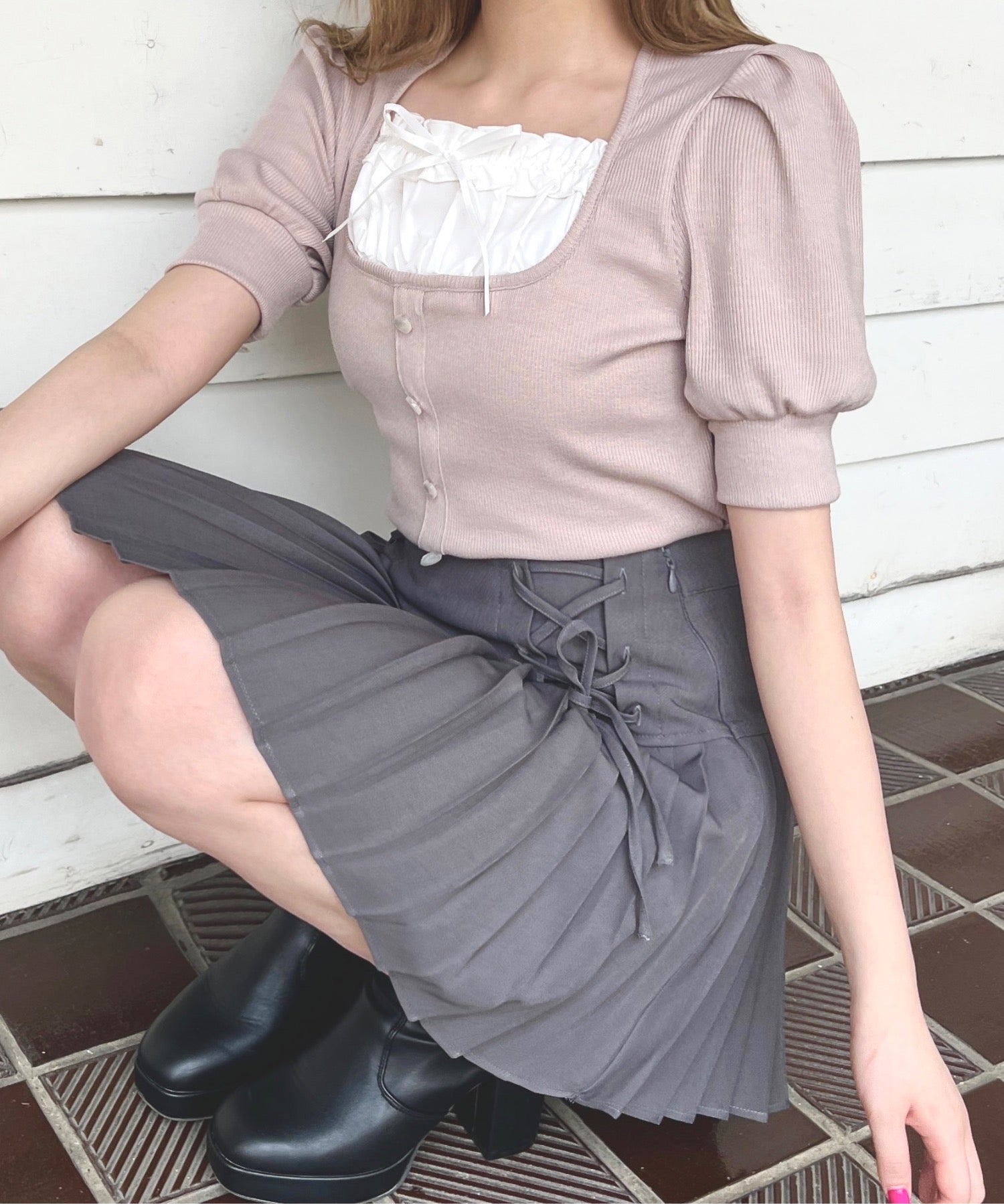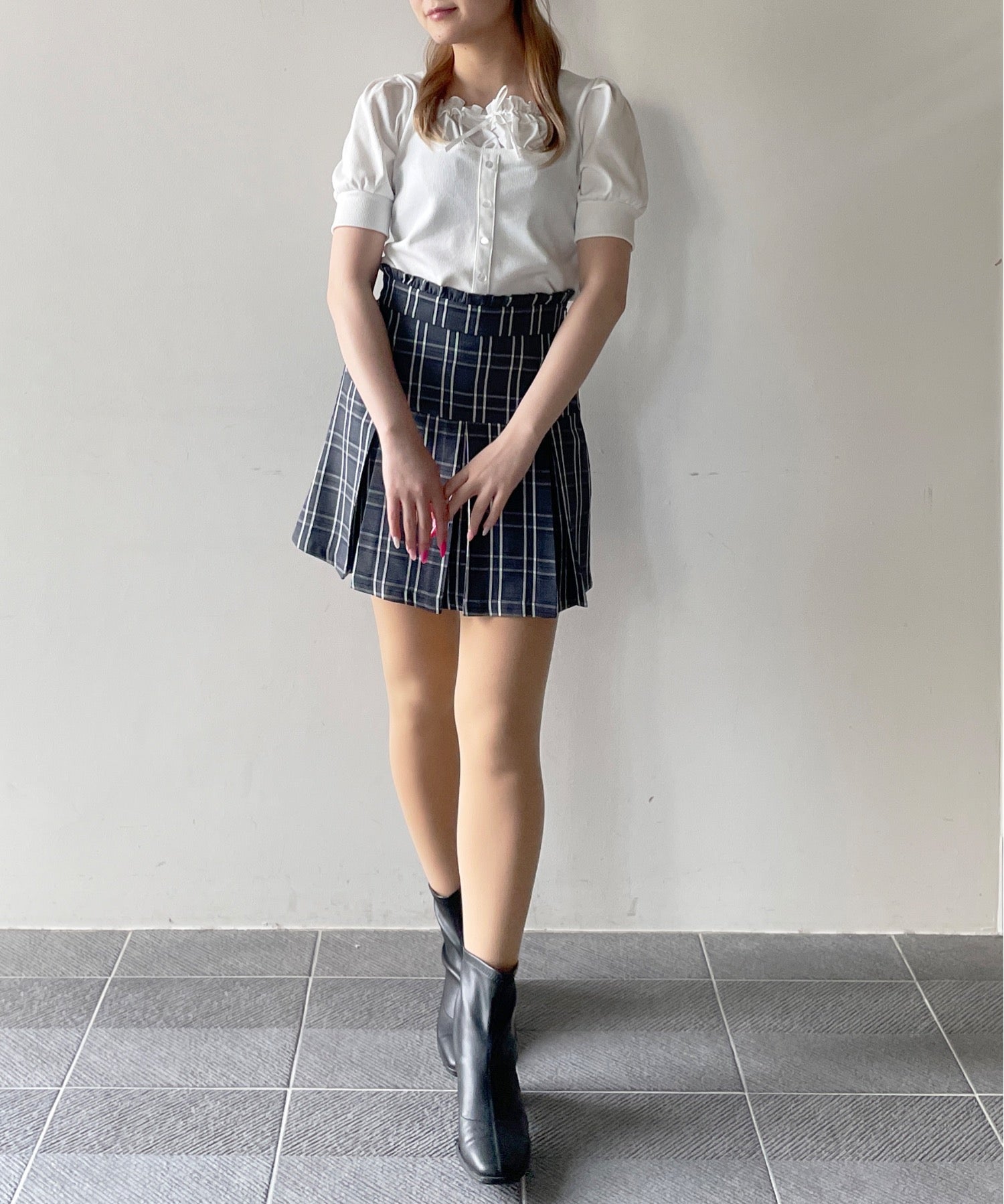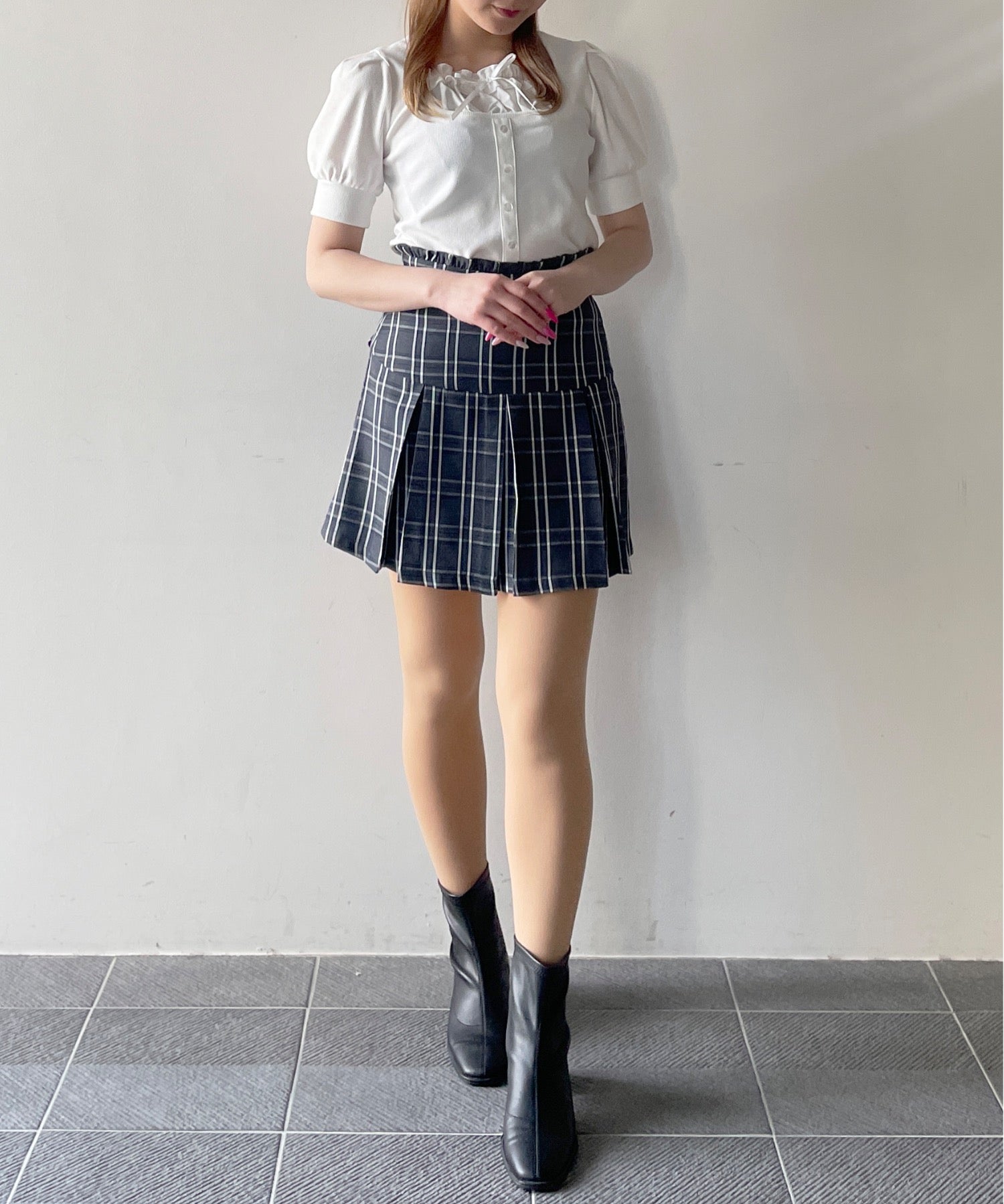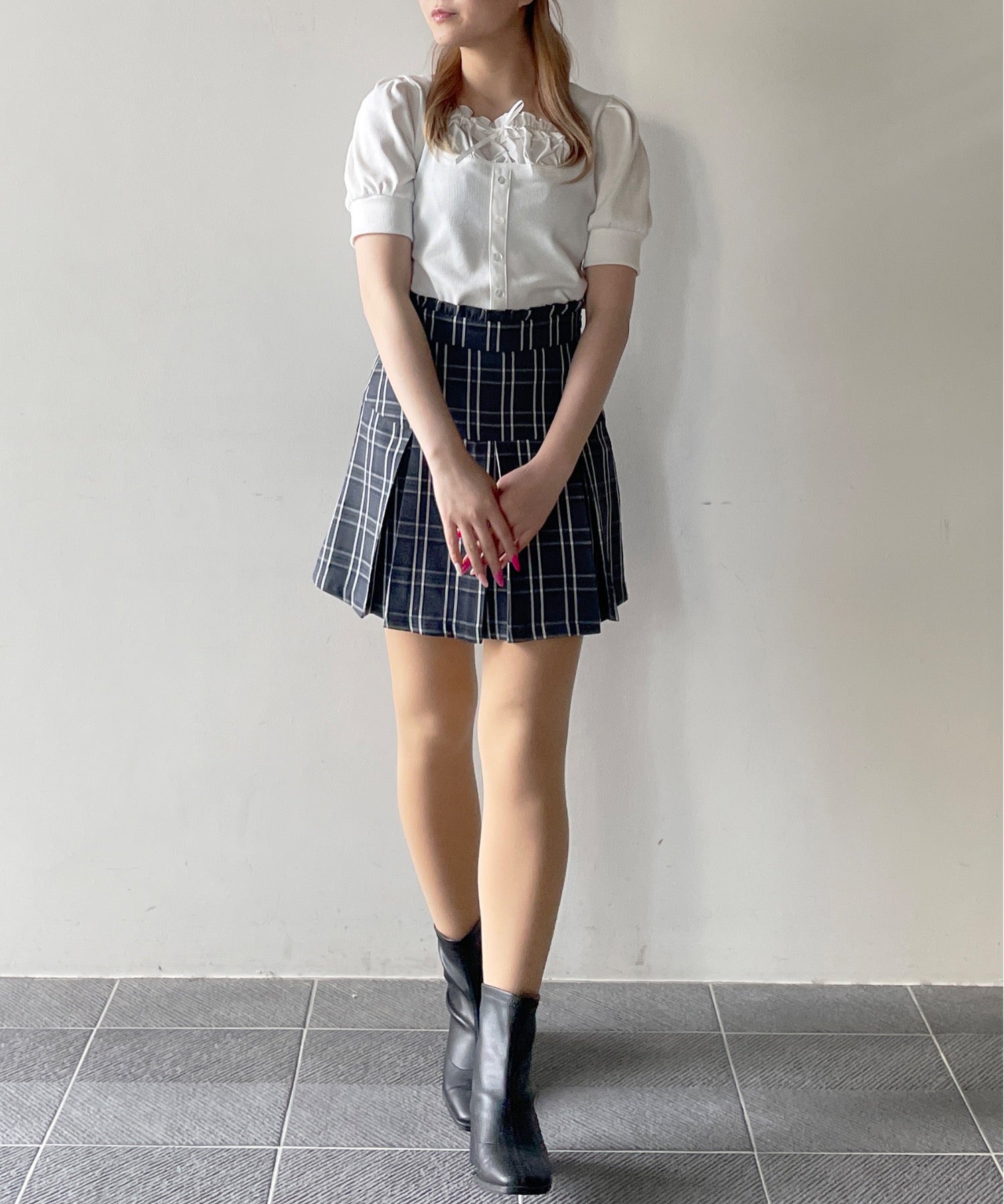 ・ミニ丈のプリーツスカートと合わせると、甘すぎない少し落ち着いたスタイリングに!