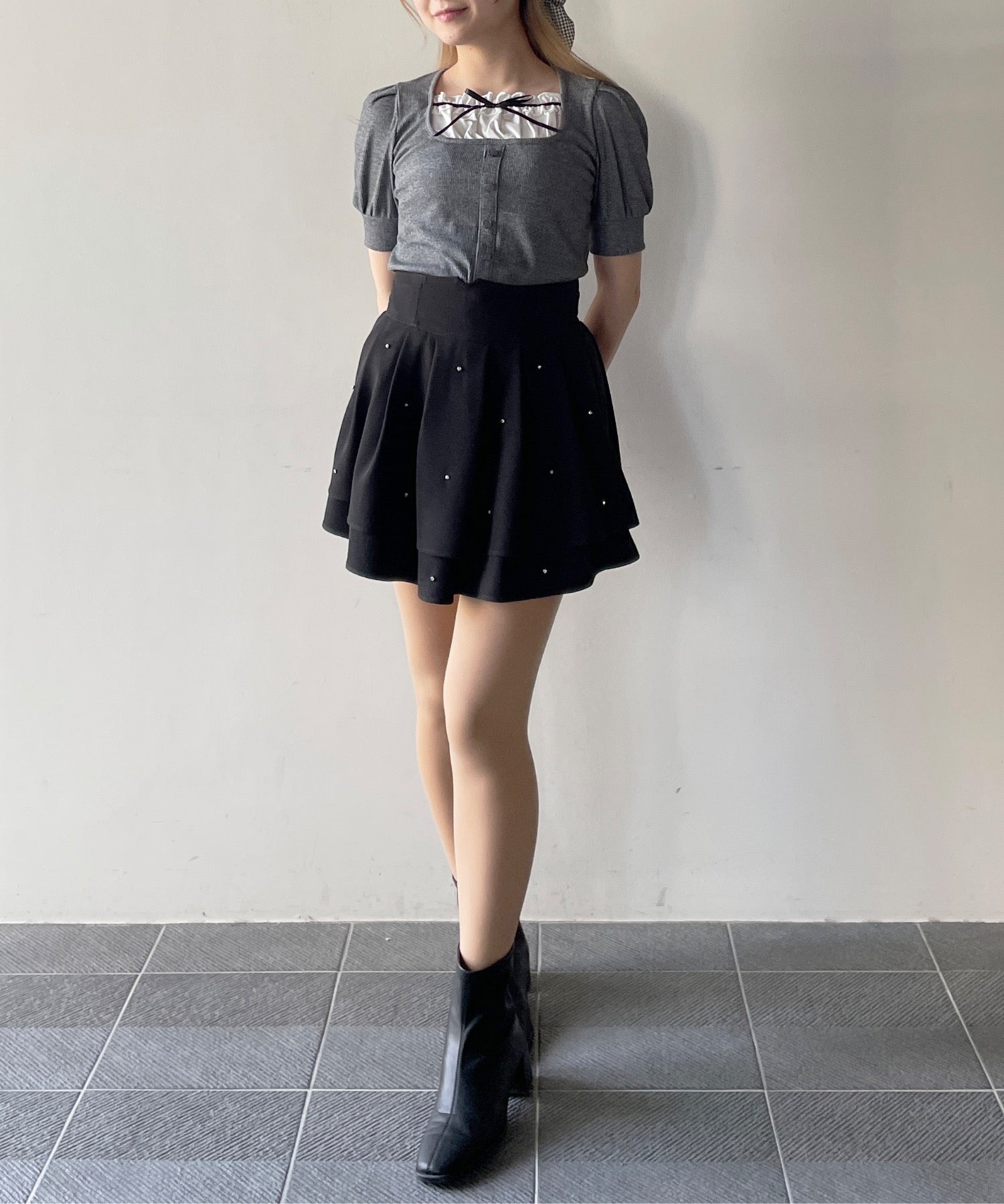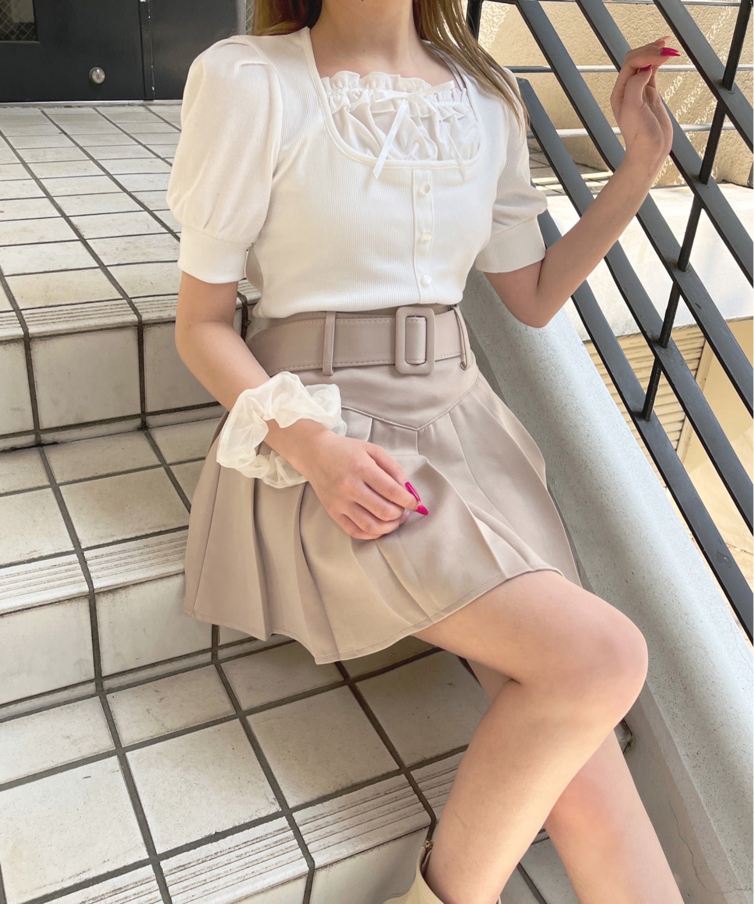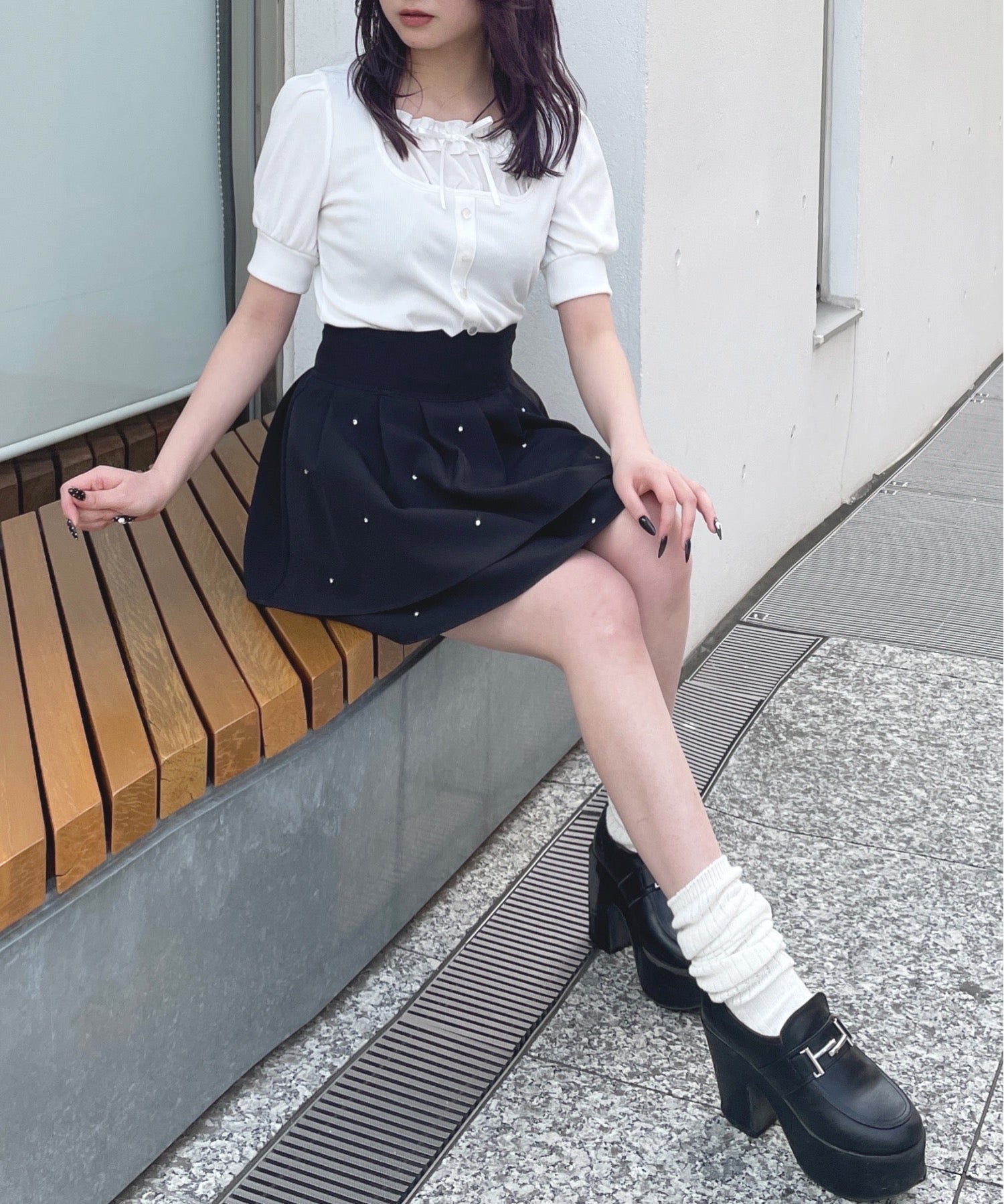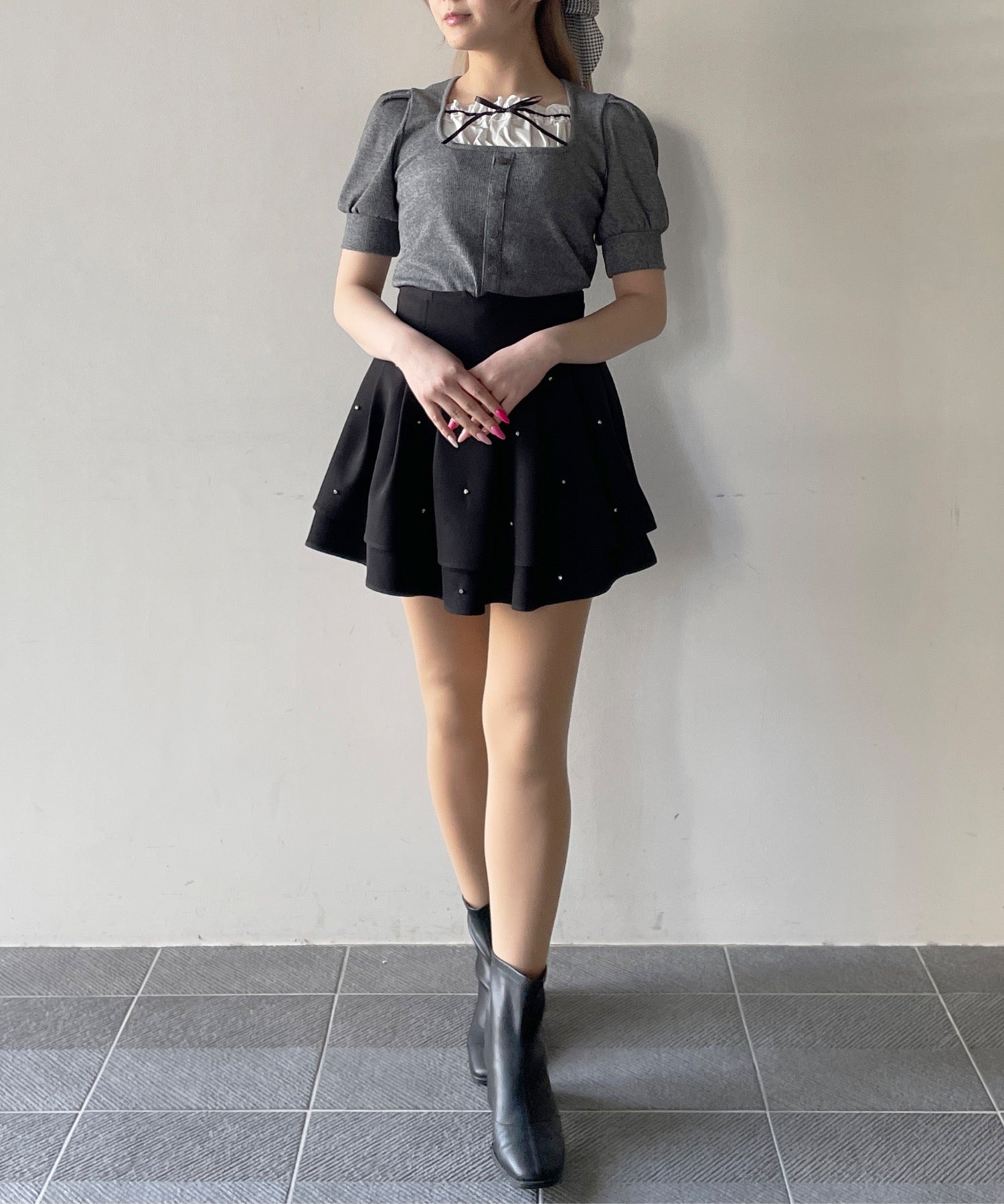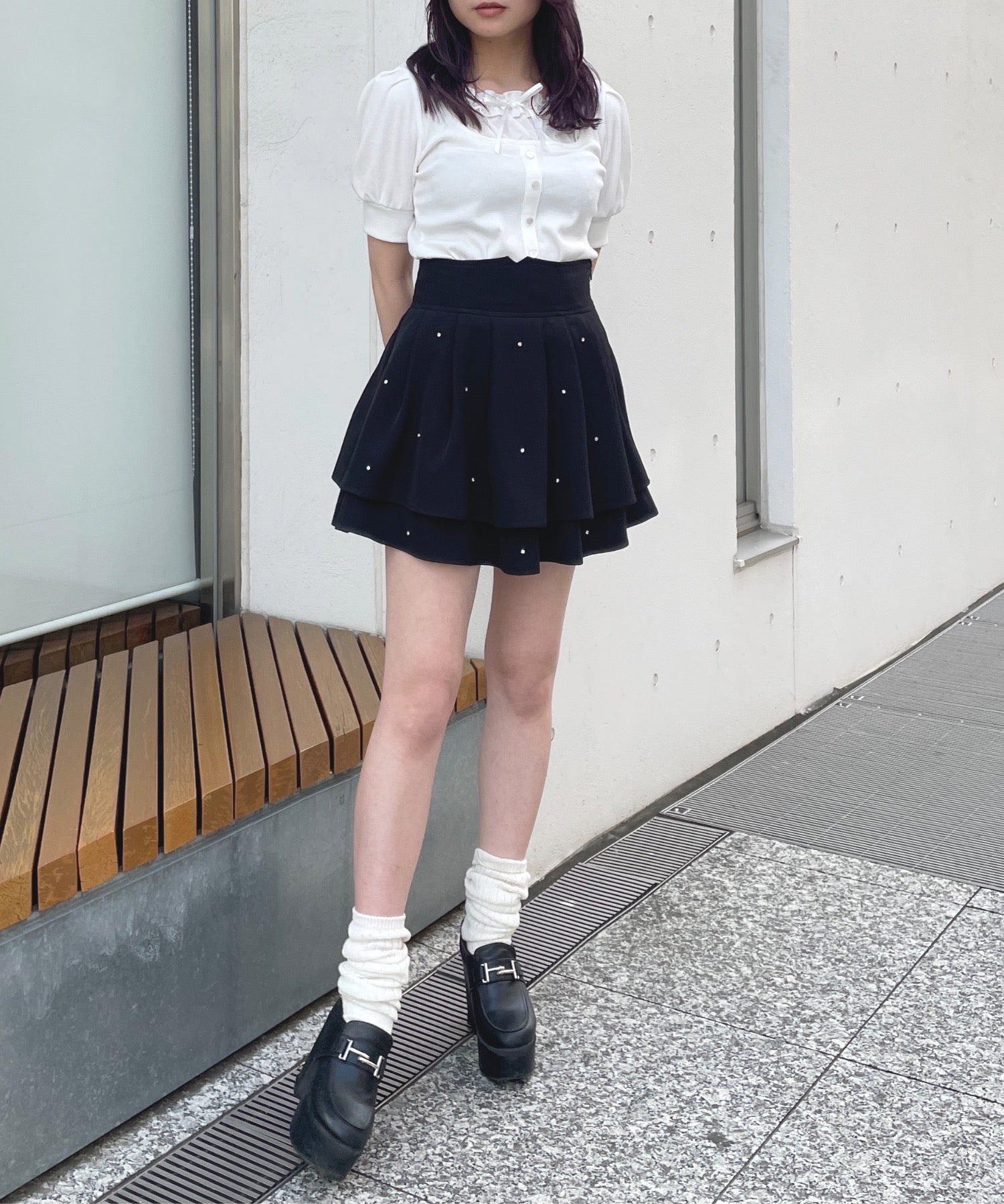 ・ミニ丈のプリーツスカートと合わせると、甘すぎない少し落ち着いたスタイリングに!