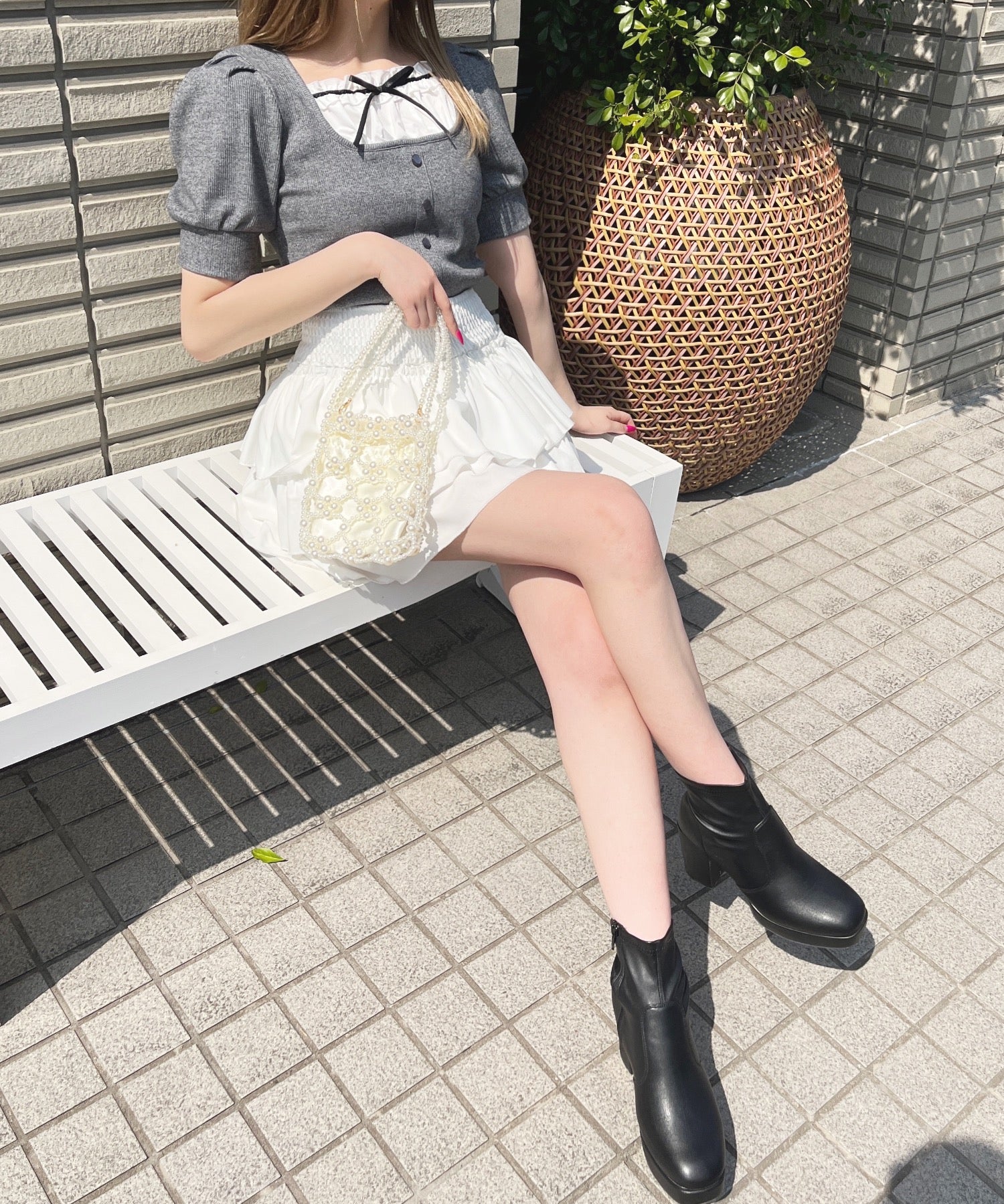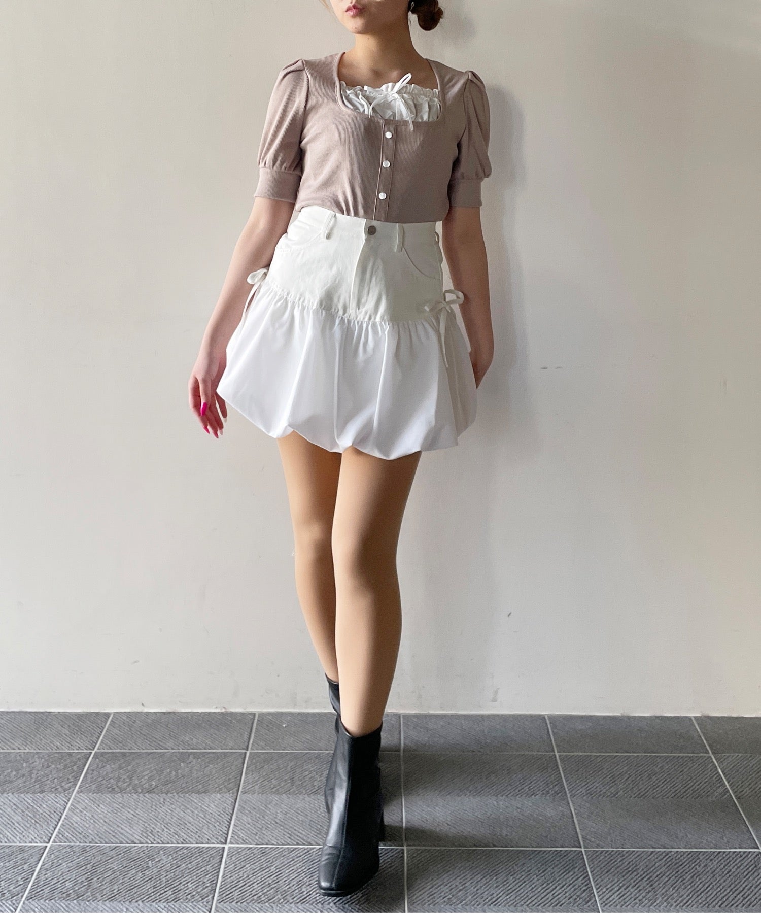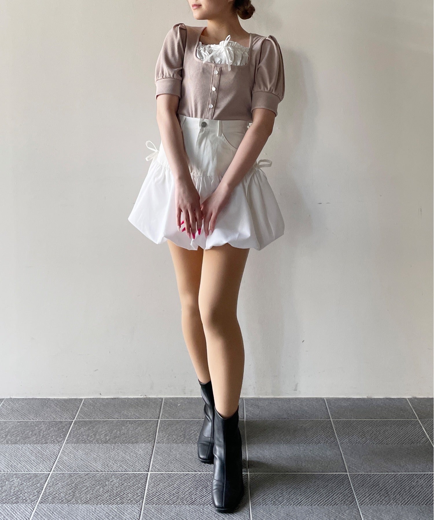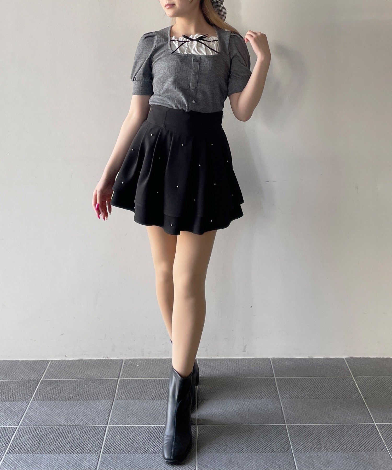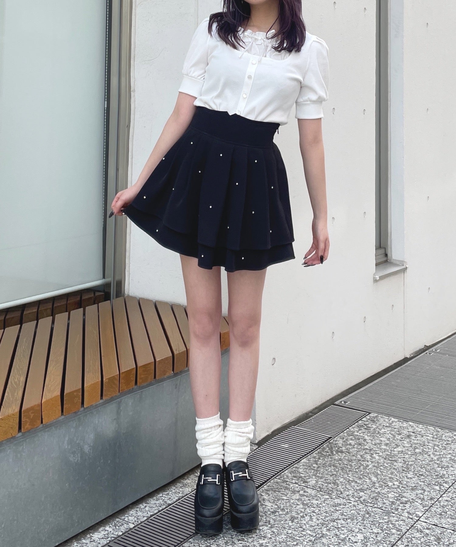 ・ミニ丈のプリーツスカートと合わせると、甘すぎない少し落ち着いたスタイリングに!