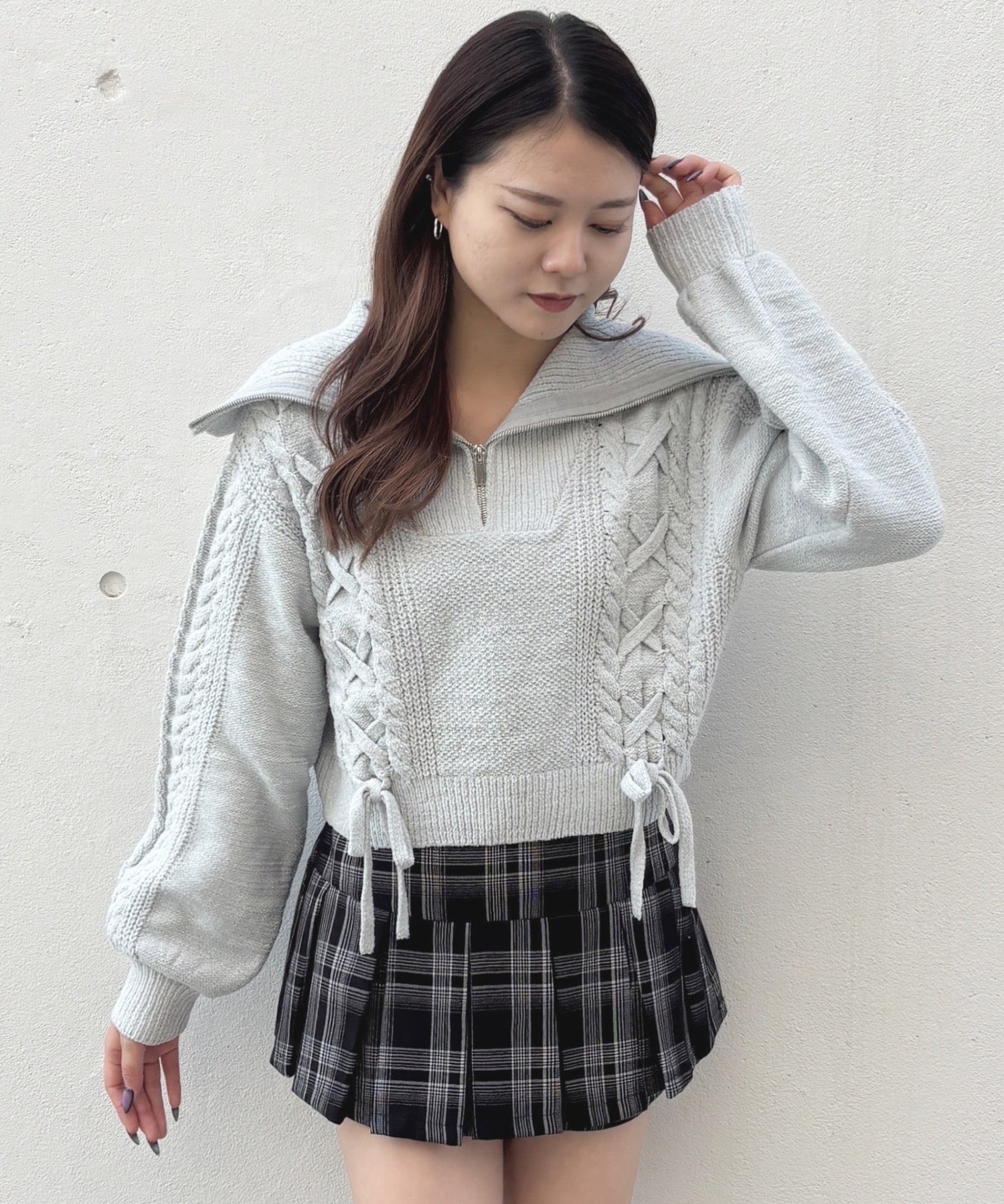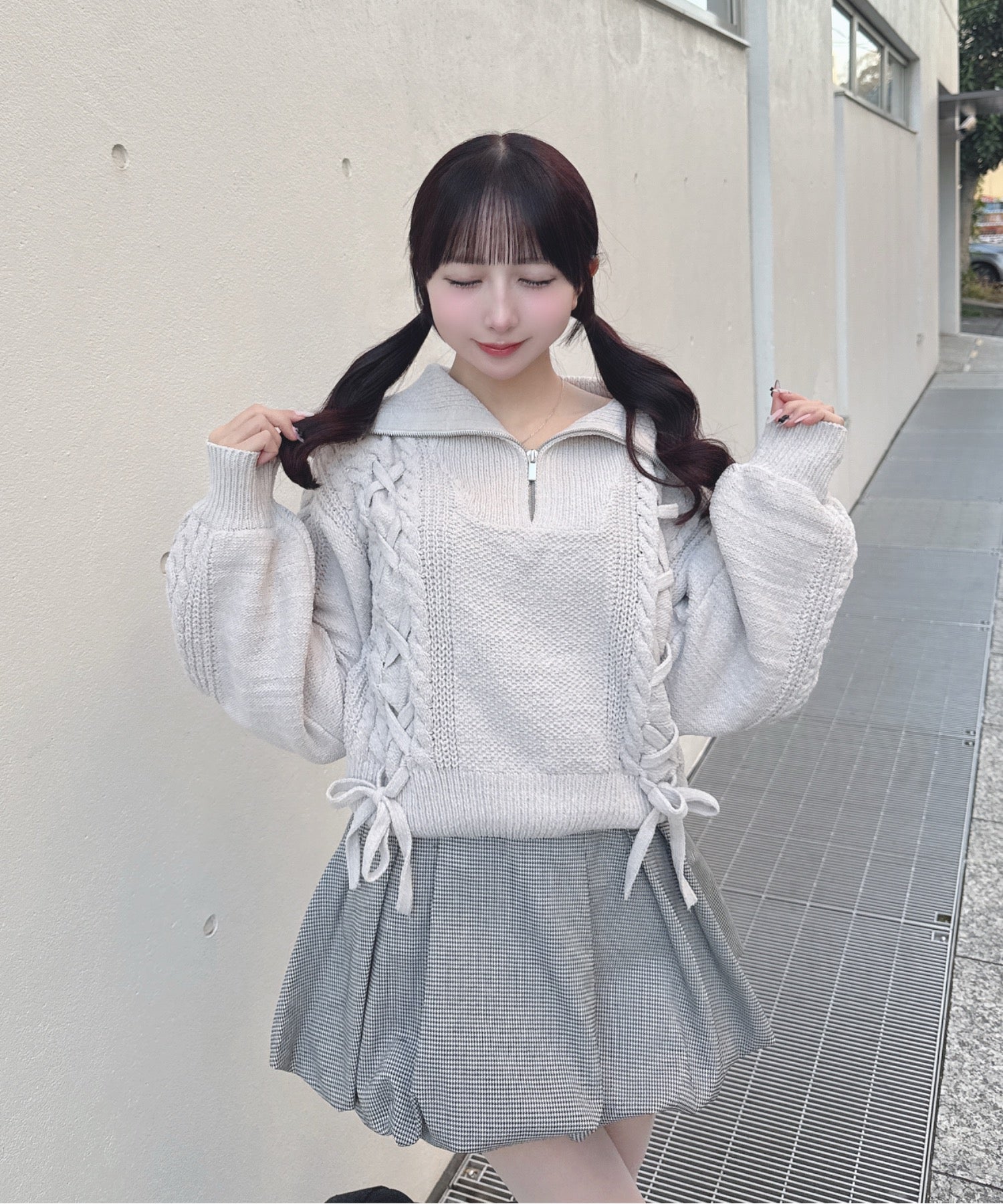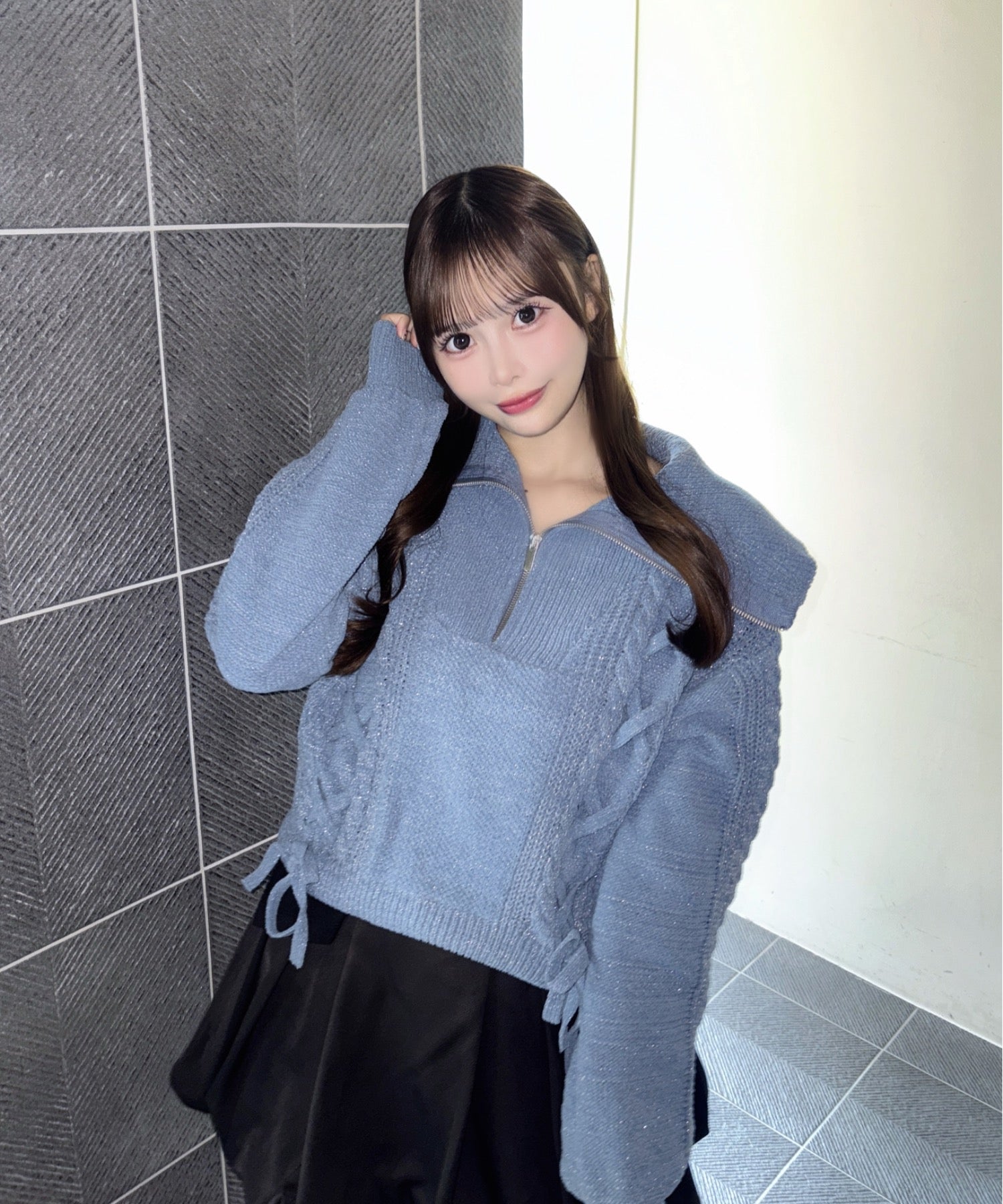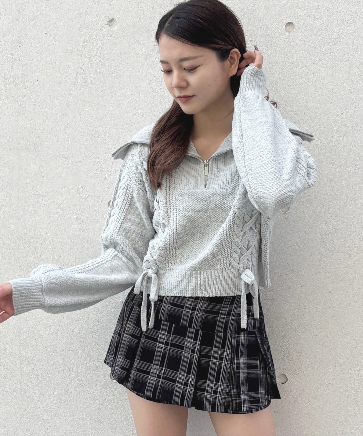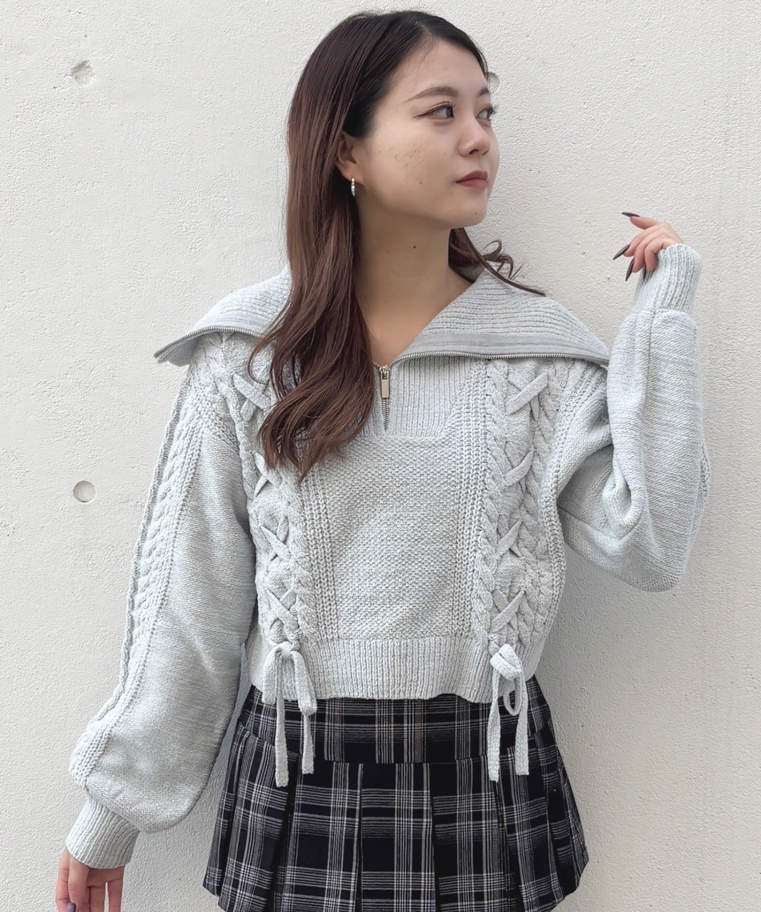 ・ガーリーなレーシングと、カジュアルな印象のハーフジップが合わさったデザインで、何にでも合わせやすい万能ニットに!