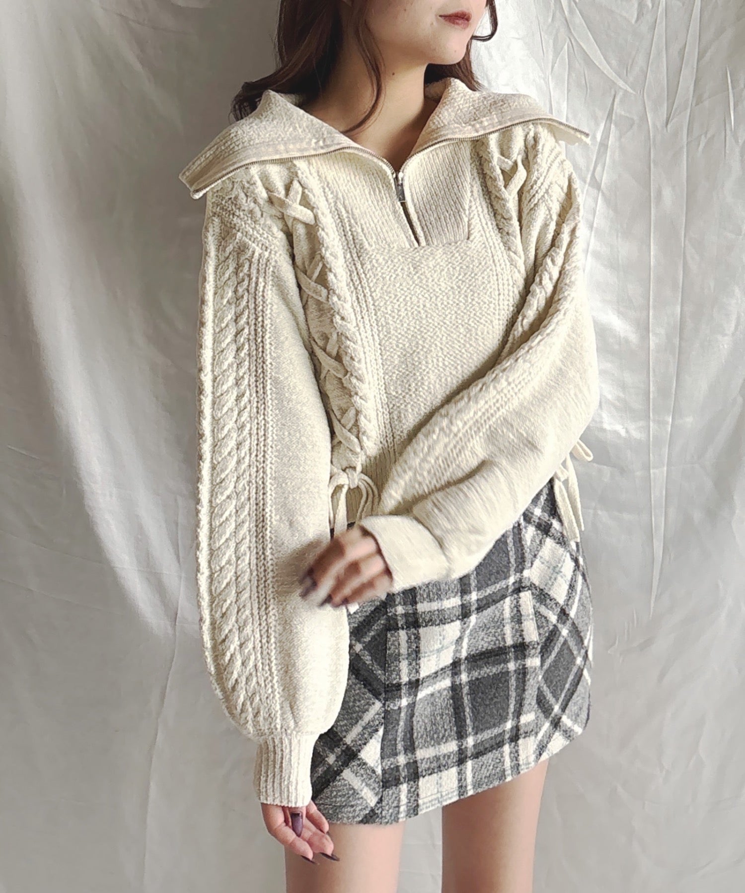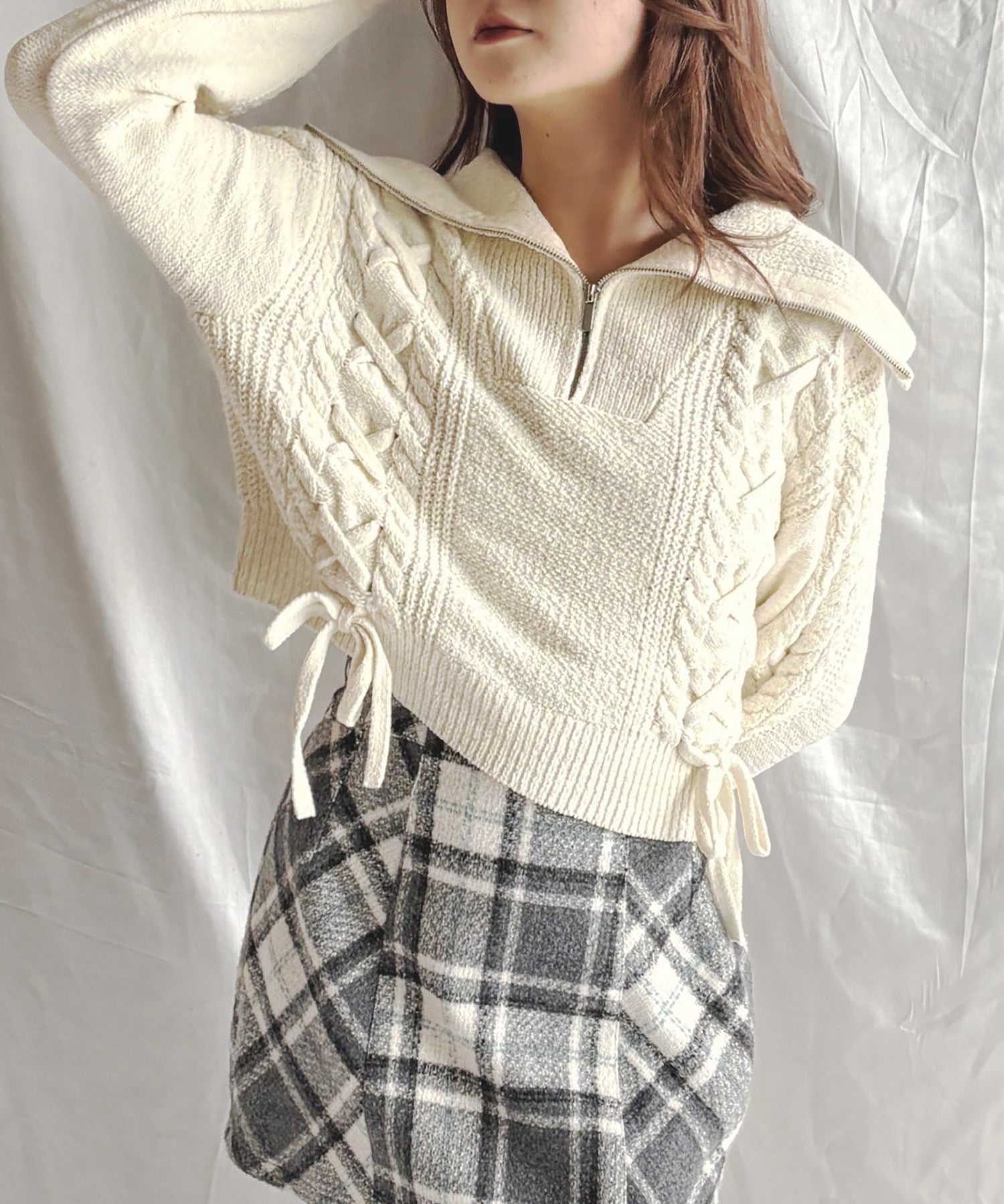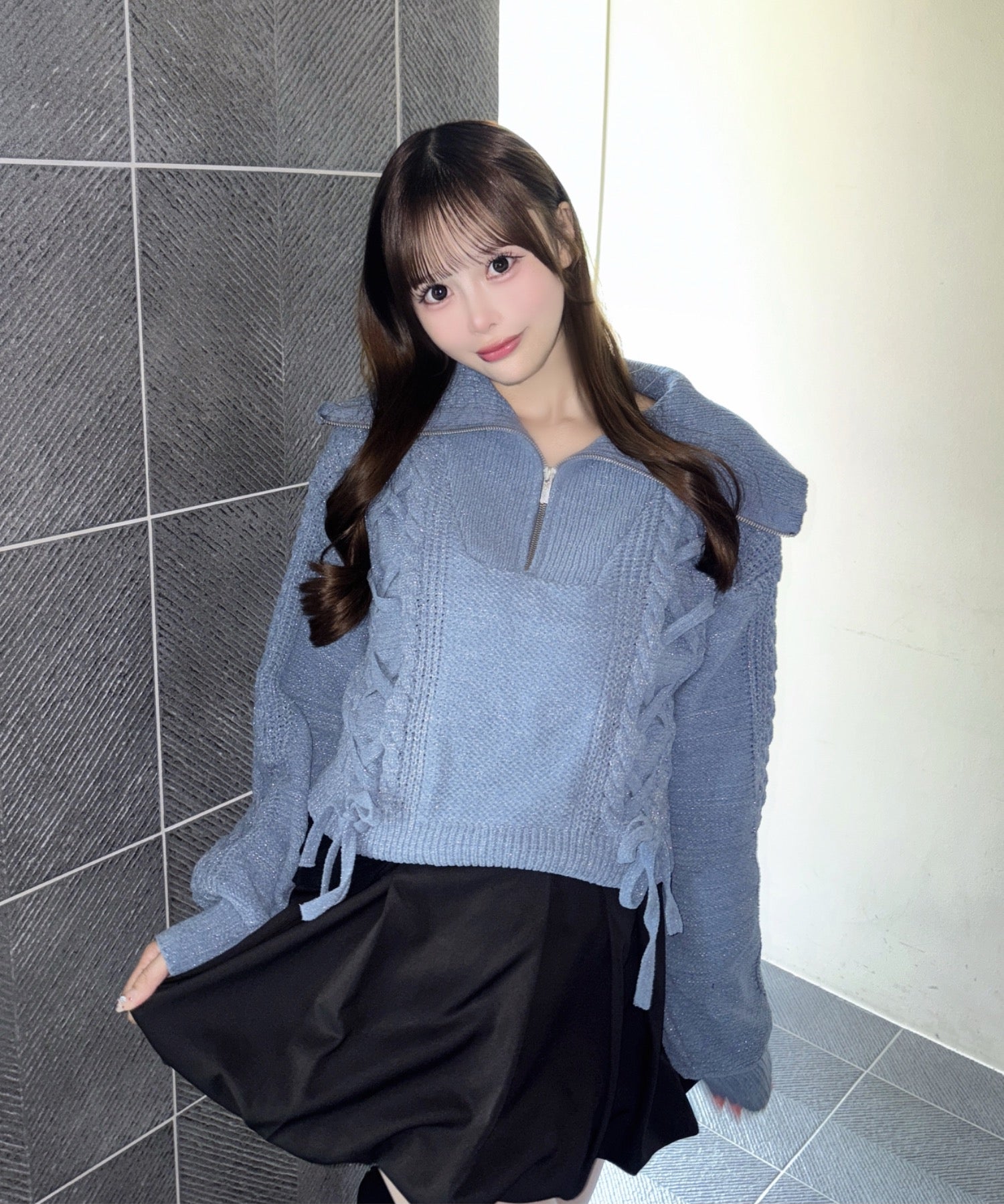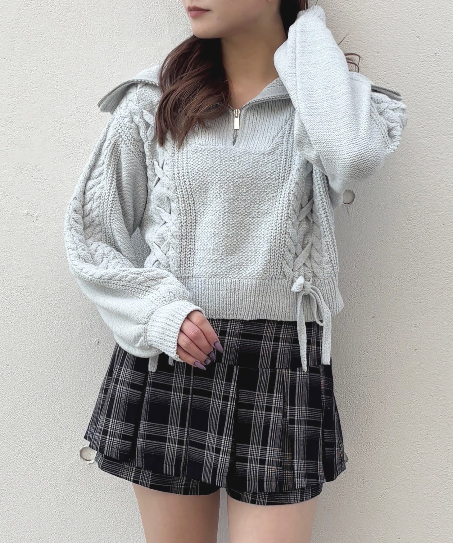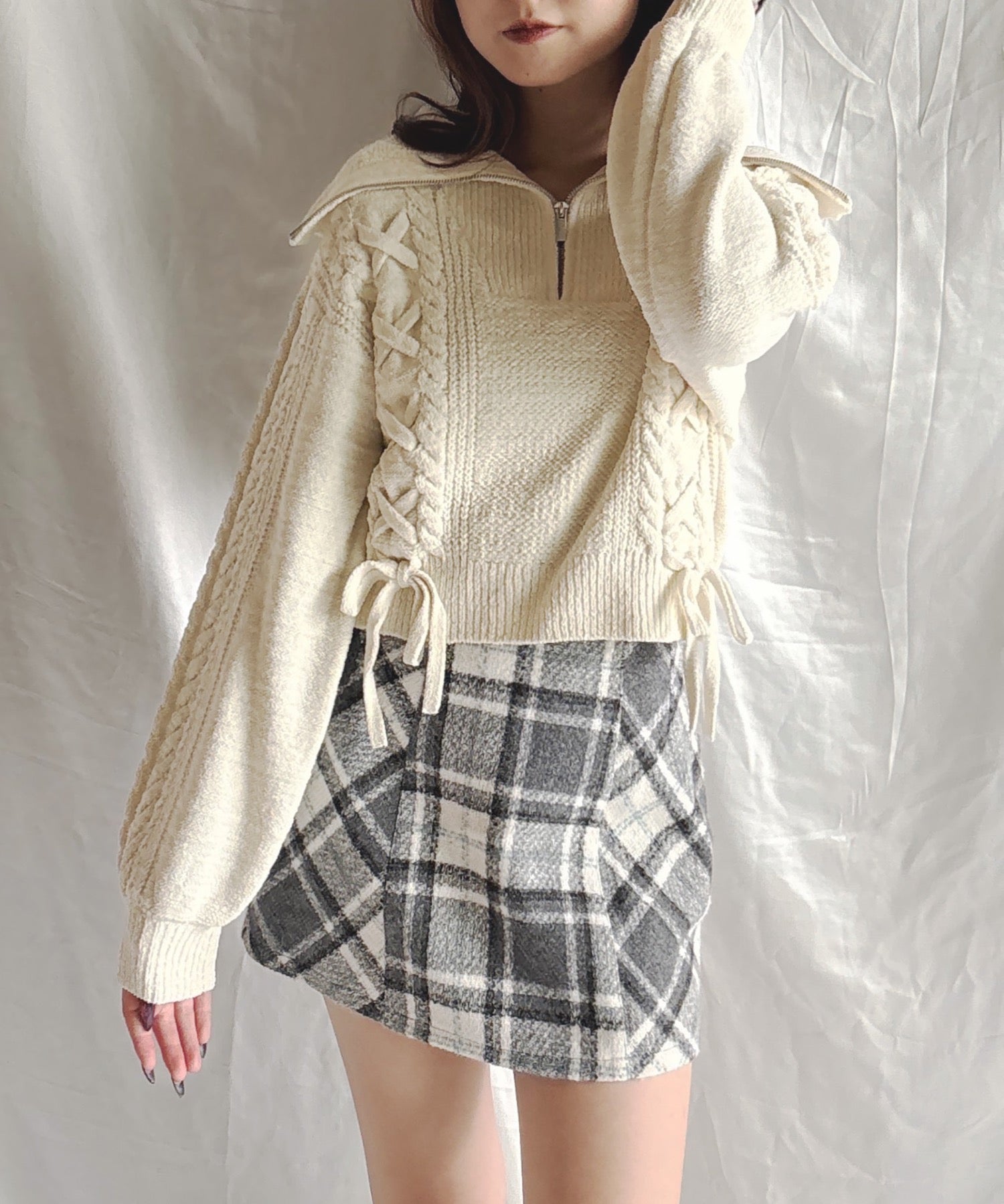 ・ガーリーなレーシングと、カジュアルな印象のハーフジップが合わさったデザインで、何にでも合わせやすい万能ニットに!