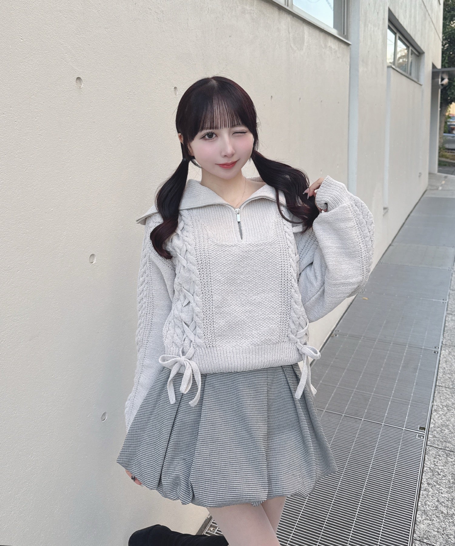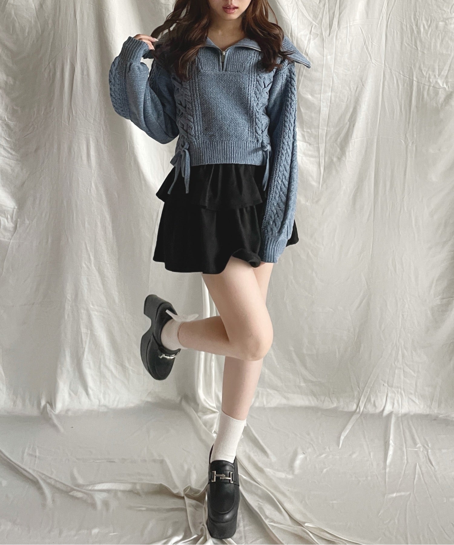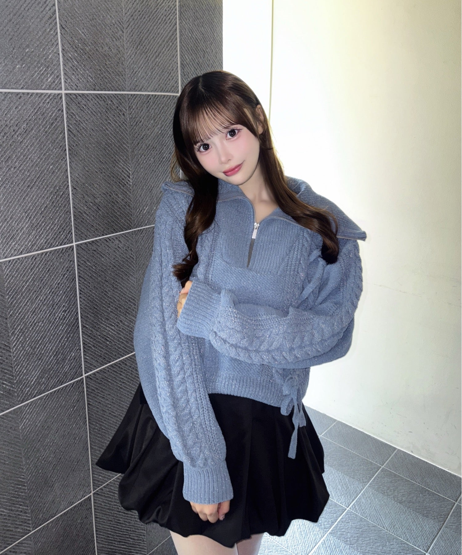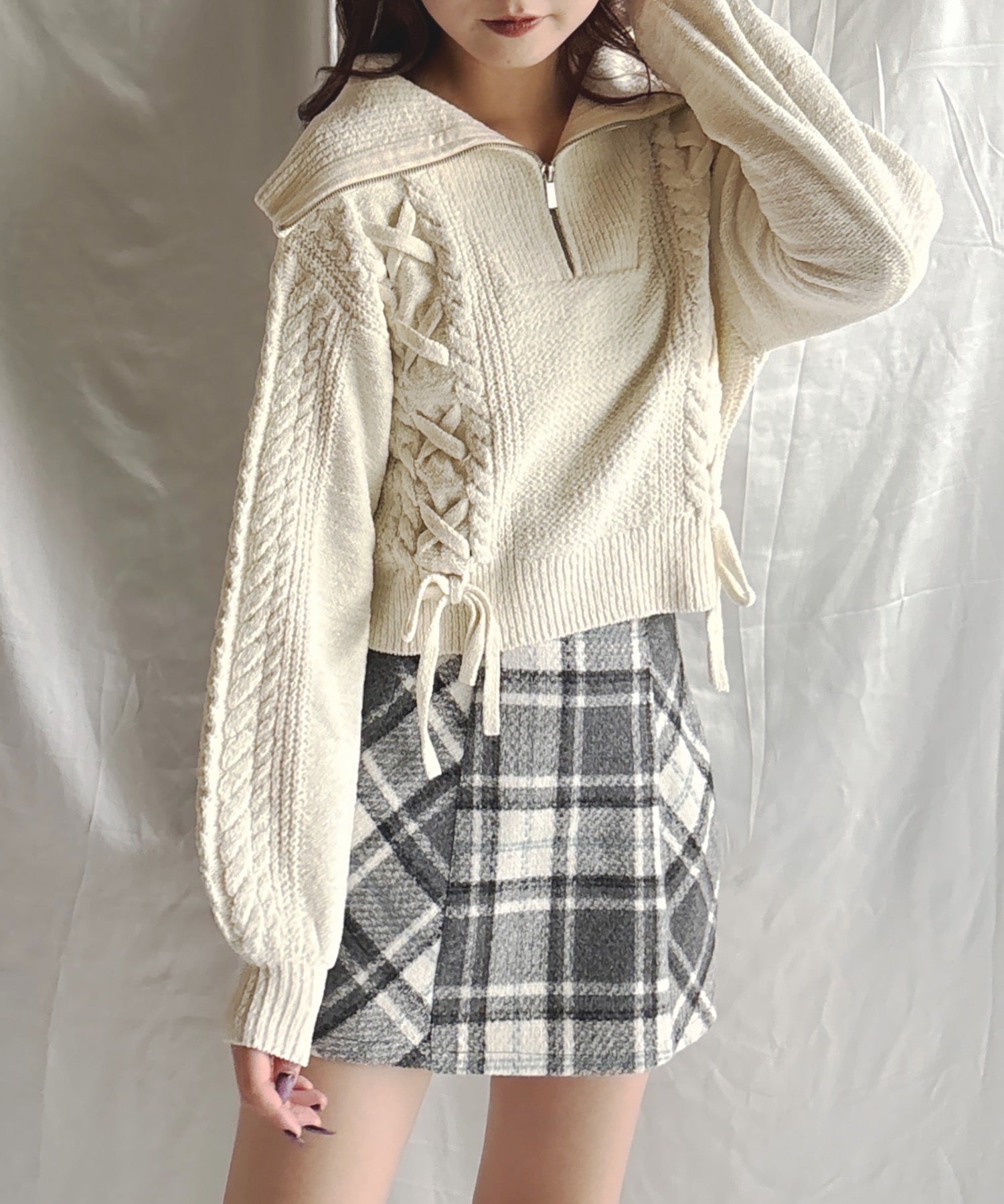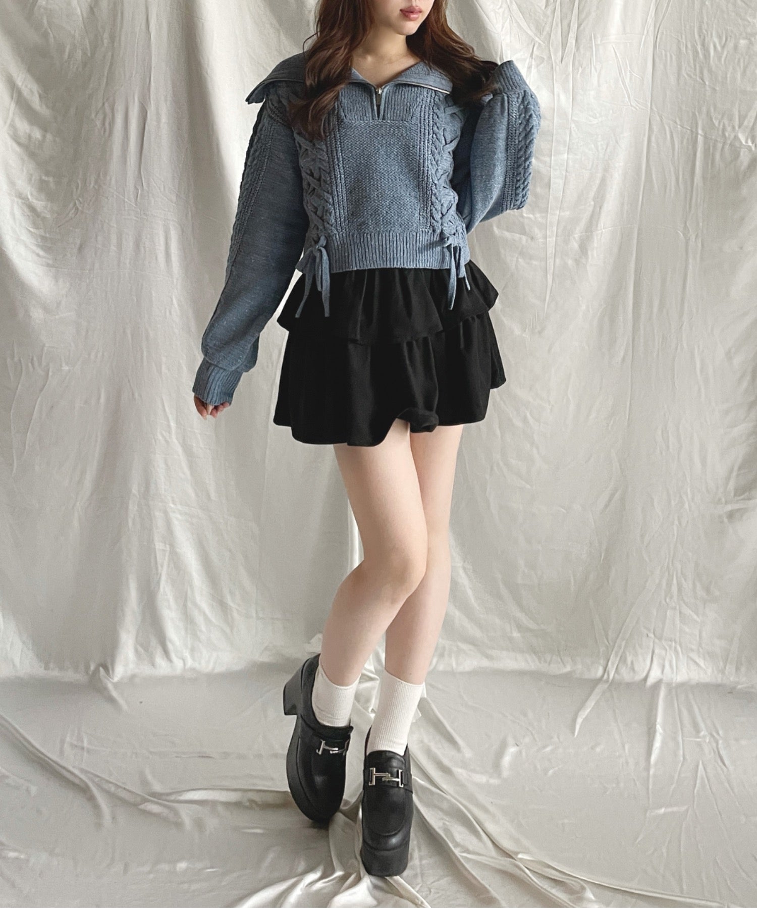 ・ガーリーなレーシングと、カジュアルな印象のハーフジップが合わさったデザインで、何にでも合わせやすい万能ニットに!