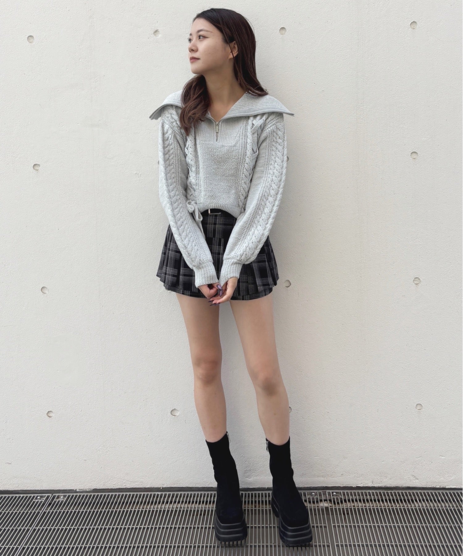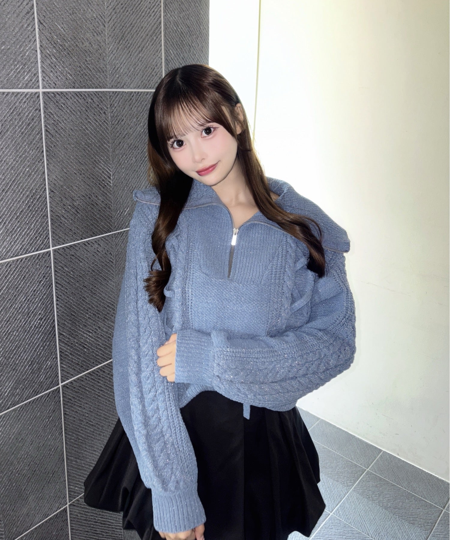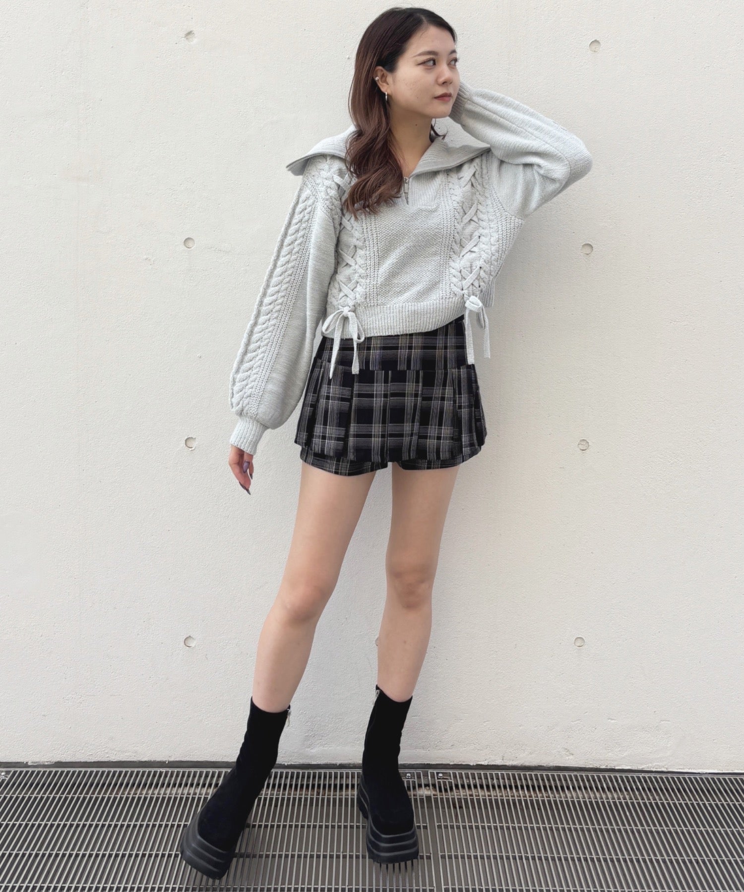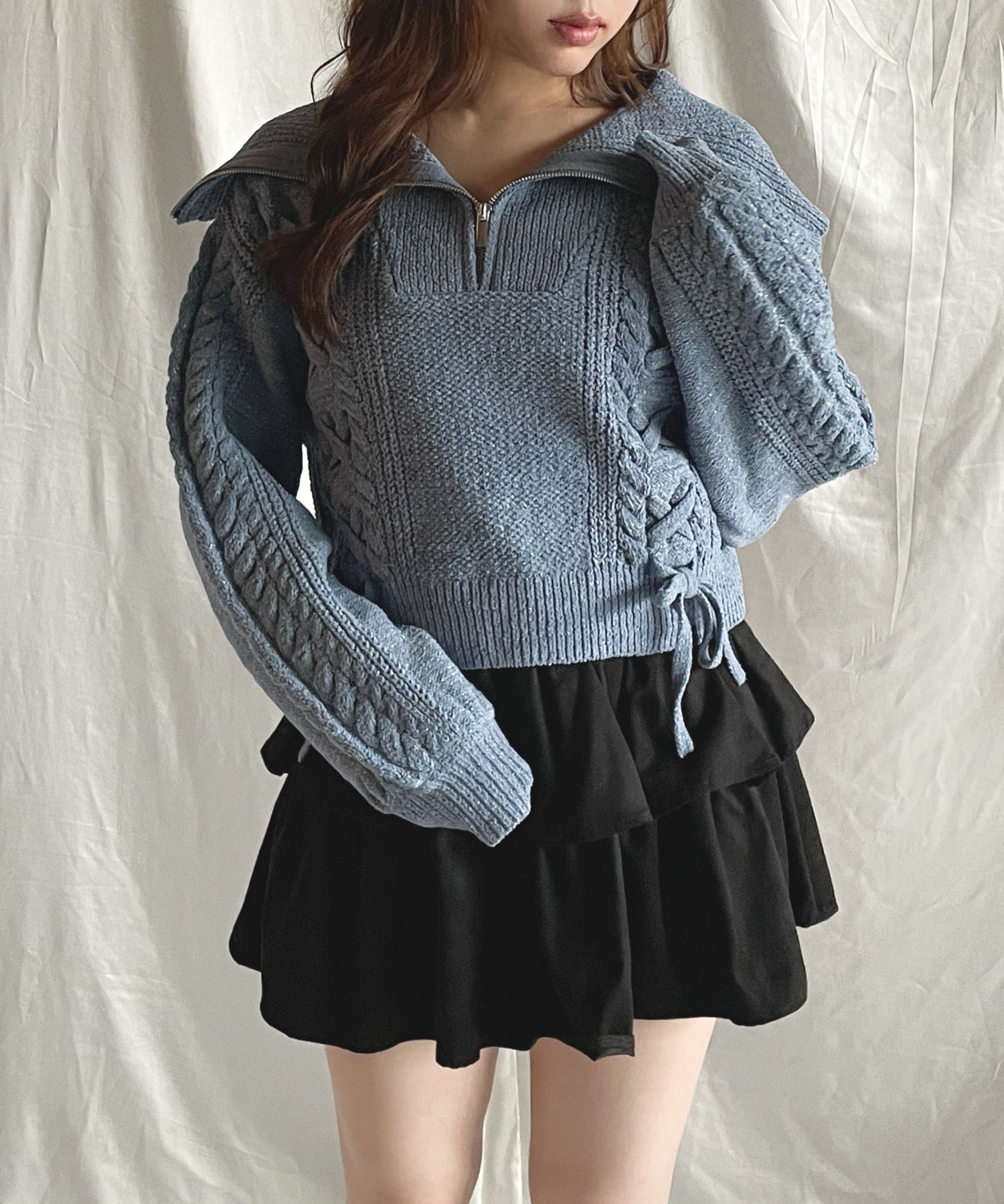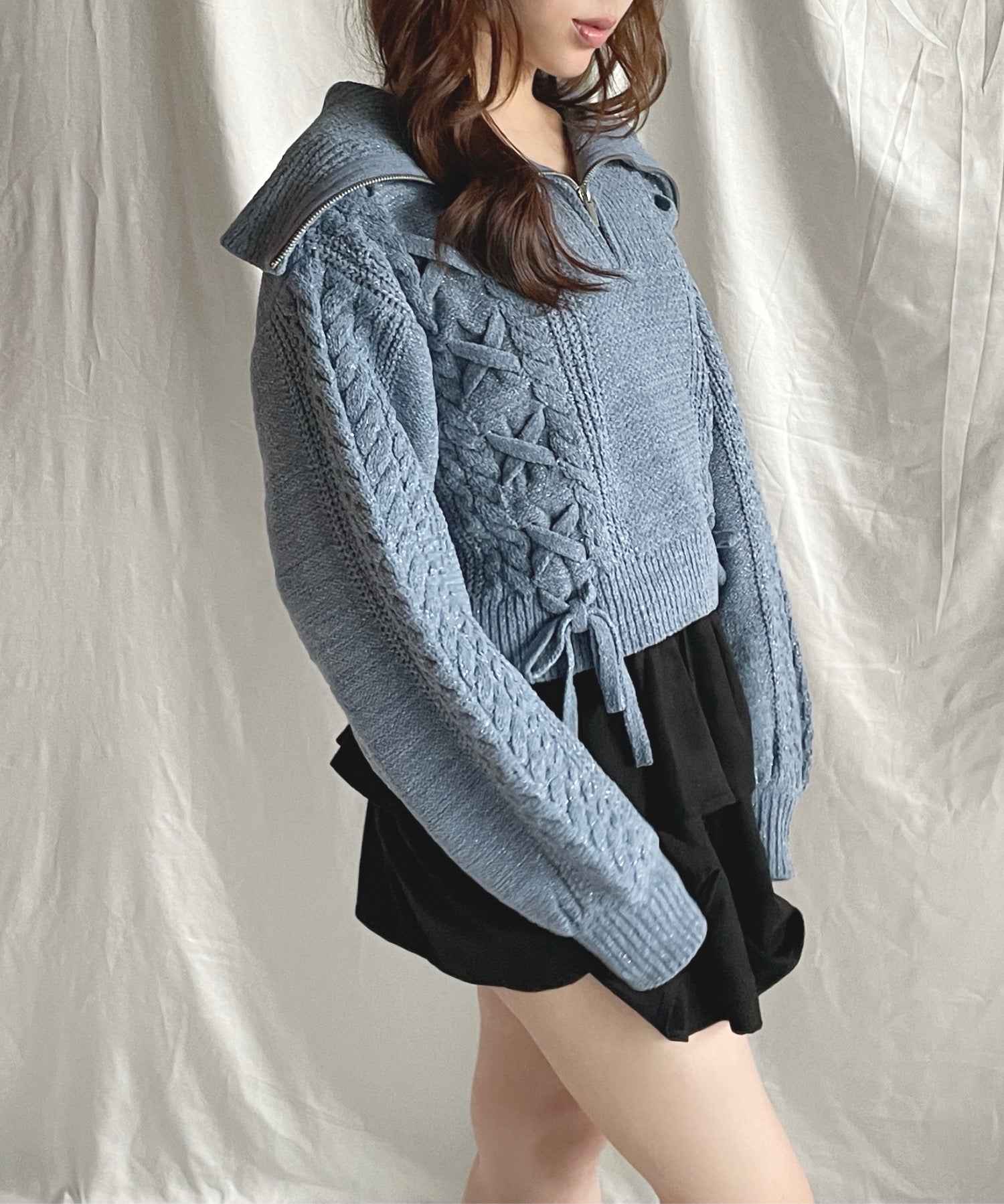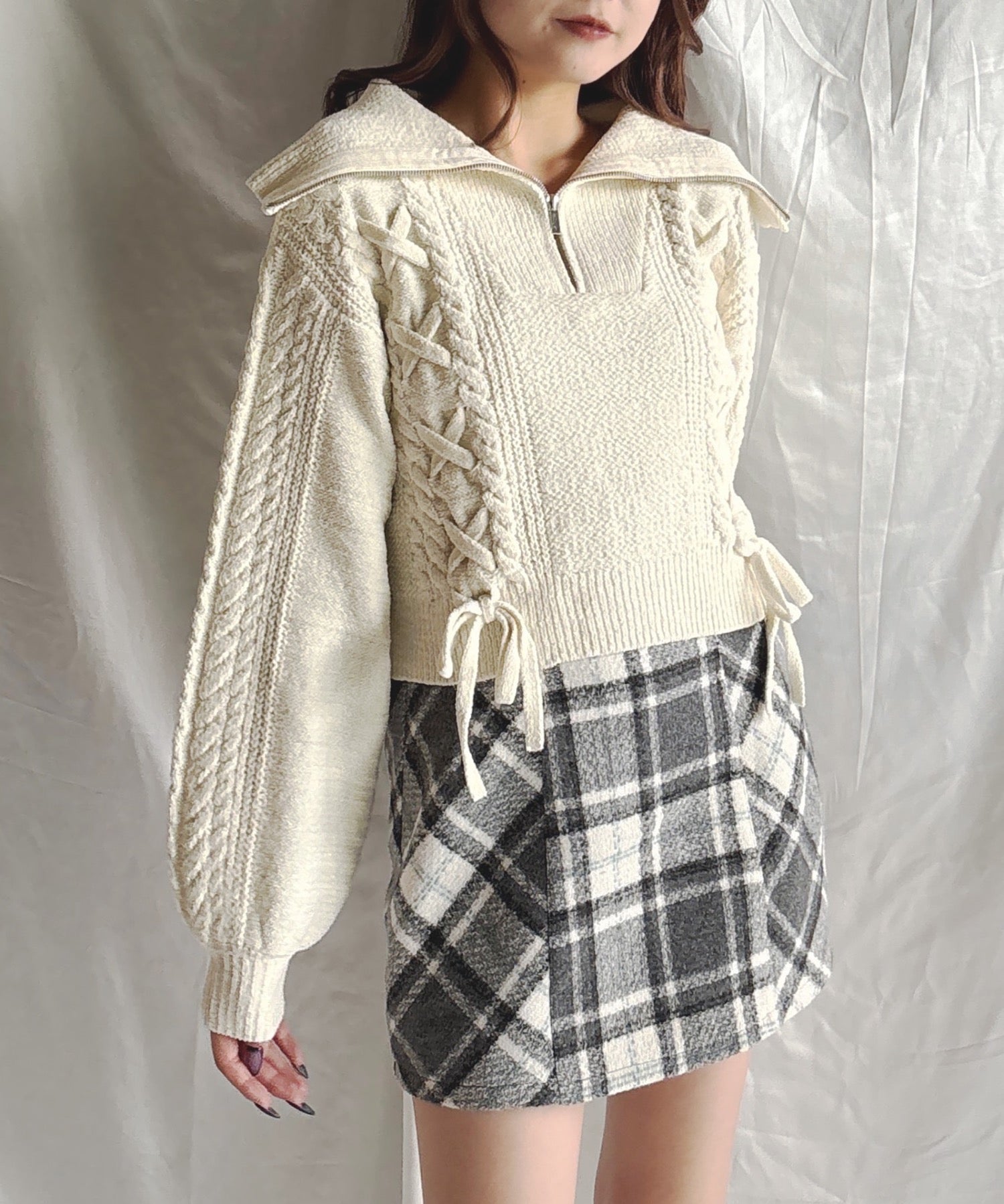 ・ガーリーなレーシングと、カジュアルな印象のハーフジップが合わさったデザインで、何にでも合わせやすい万能ニットに!