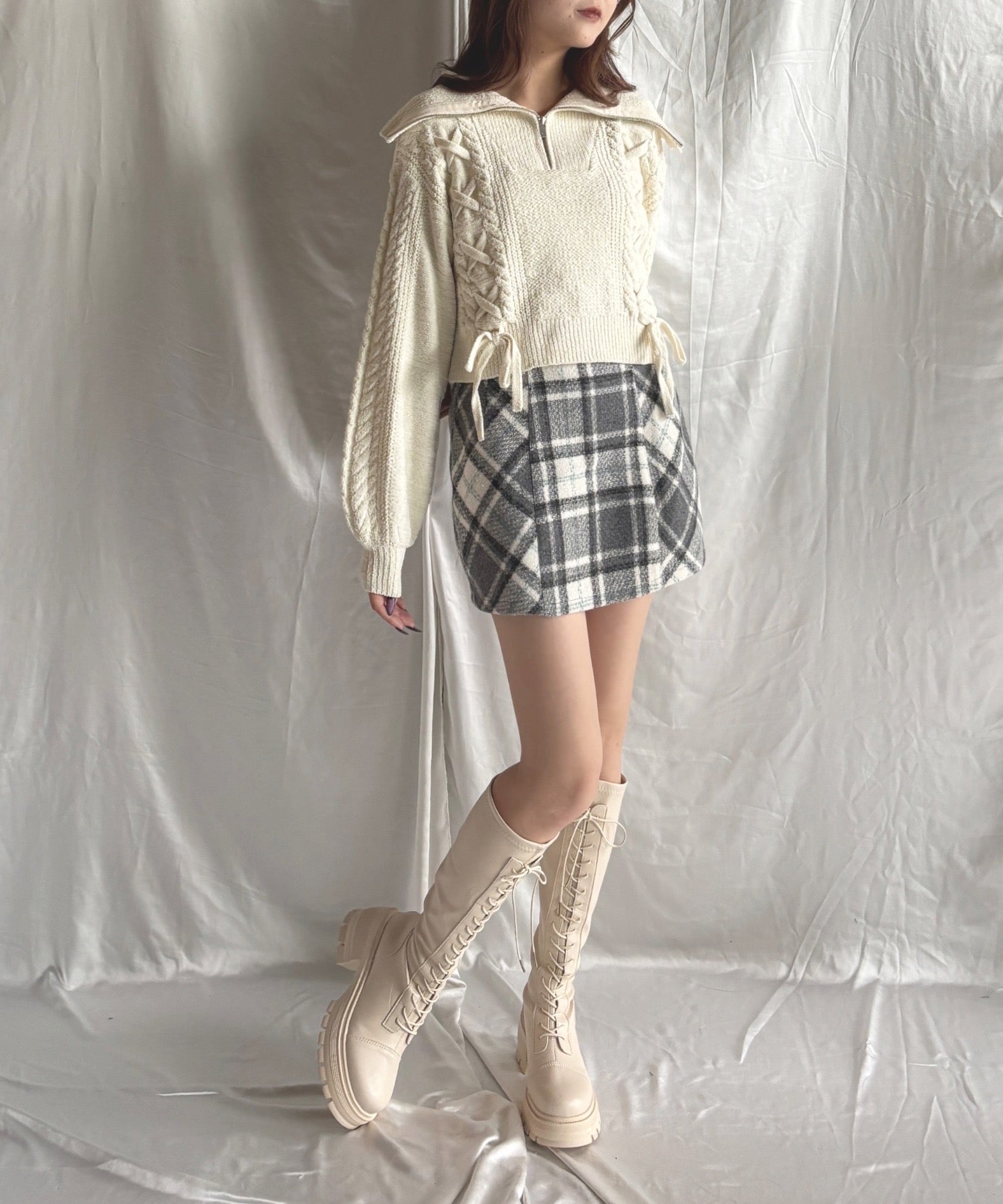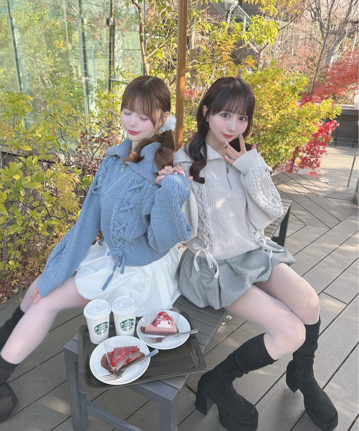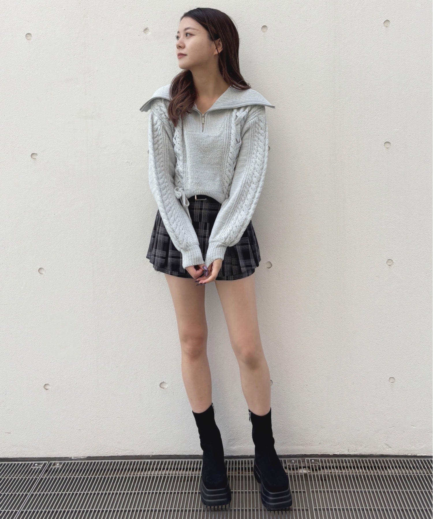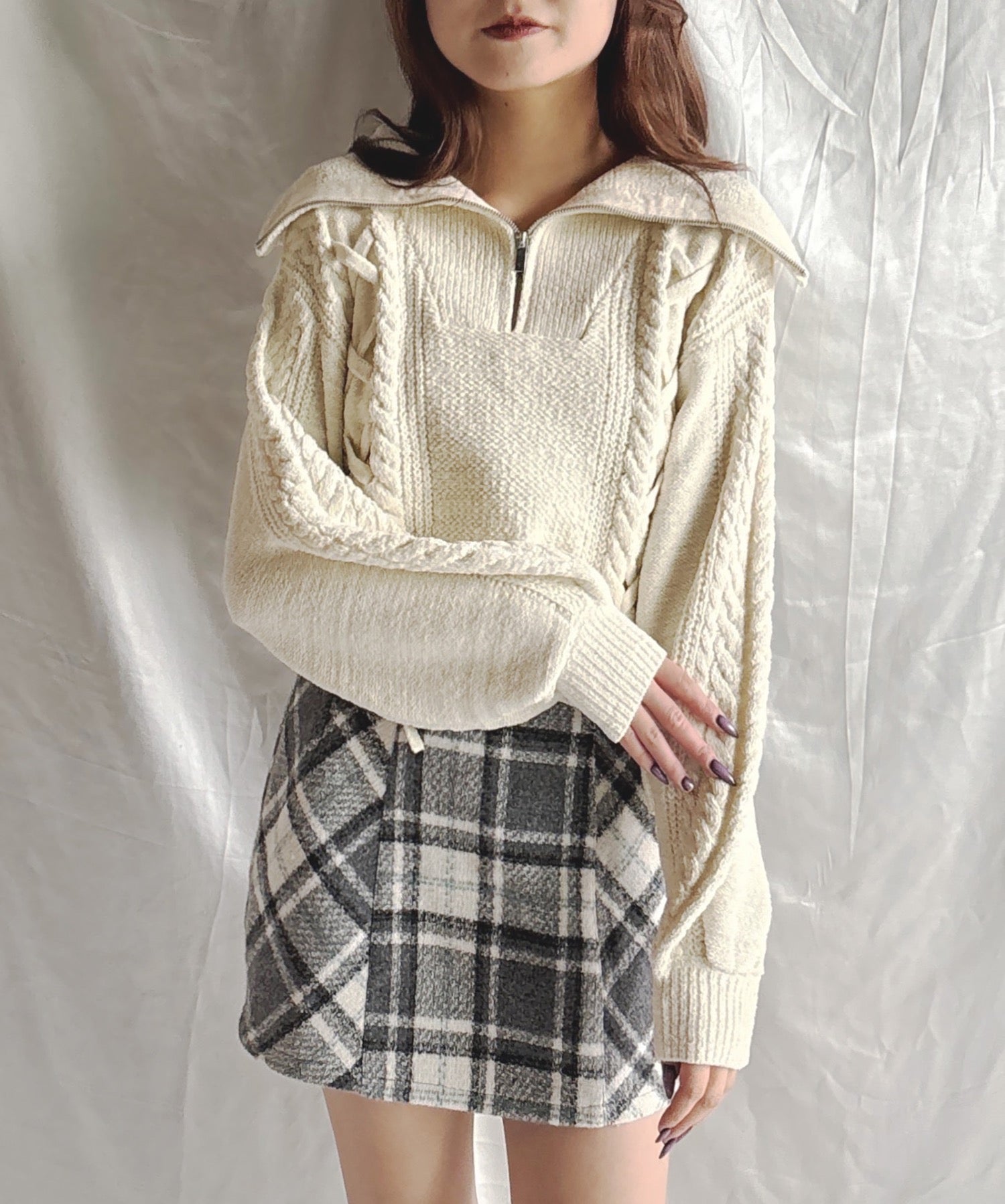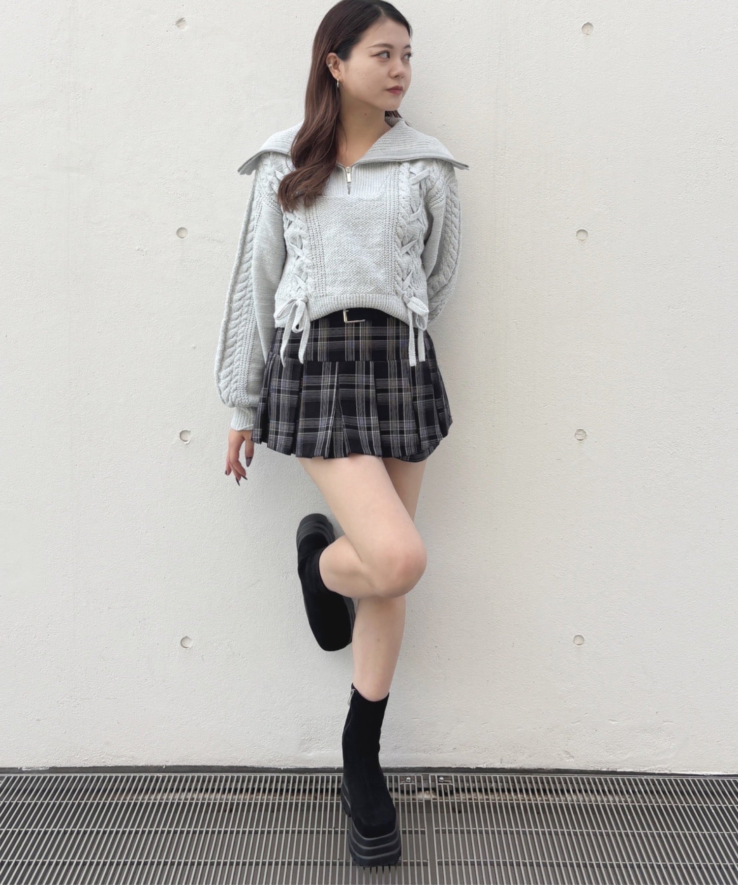 ・ガーリーなレーシングと、カジュアルな印象のハーフジップが合わさったデザインで、何にでも合わせやすい万能ニットに!