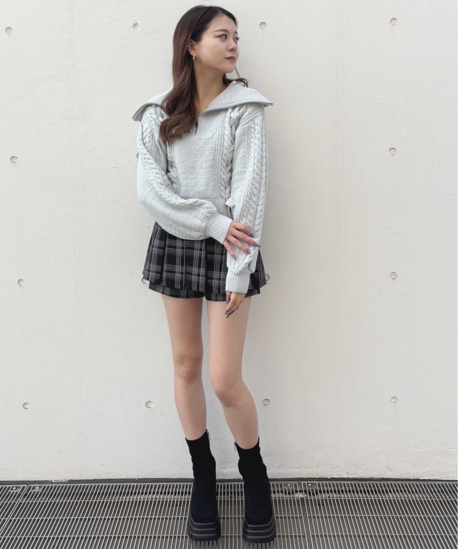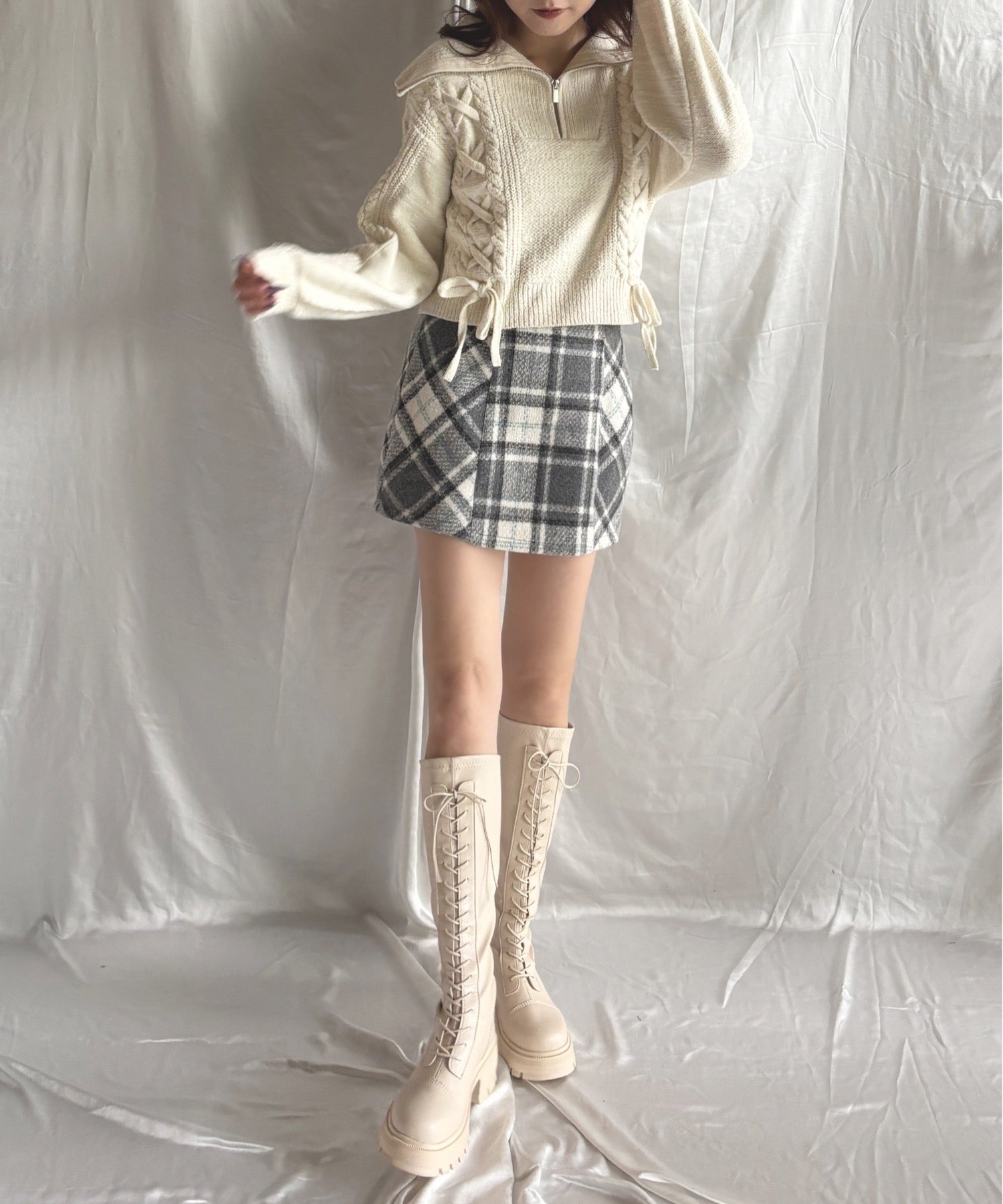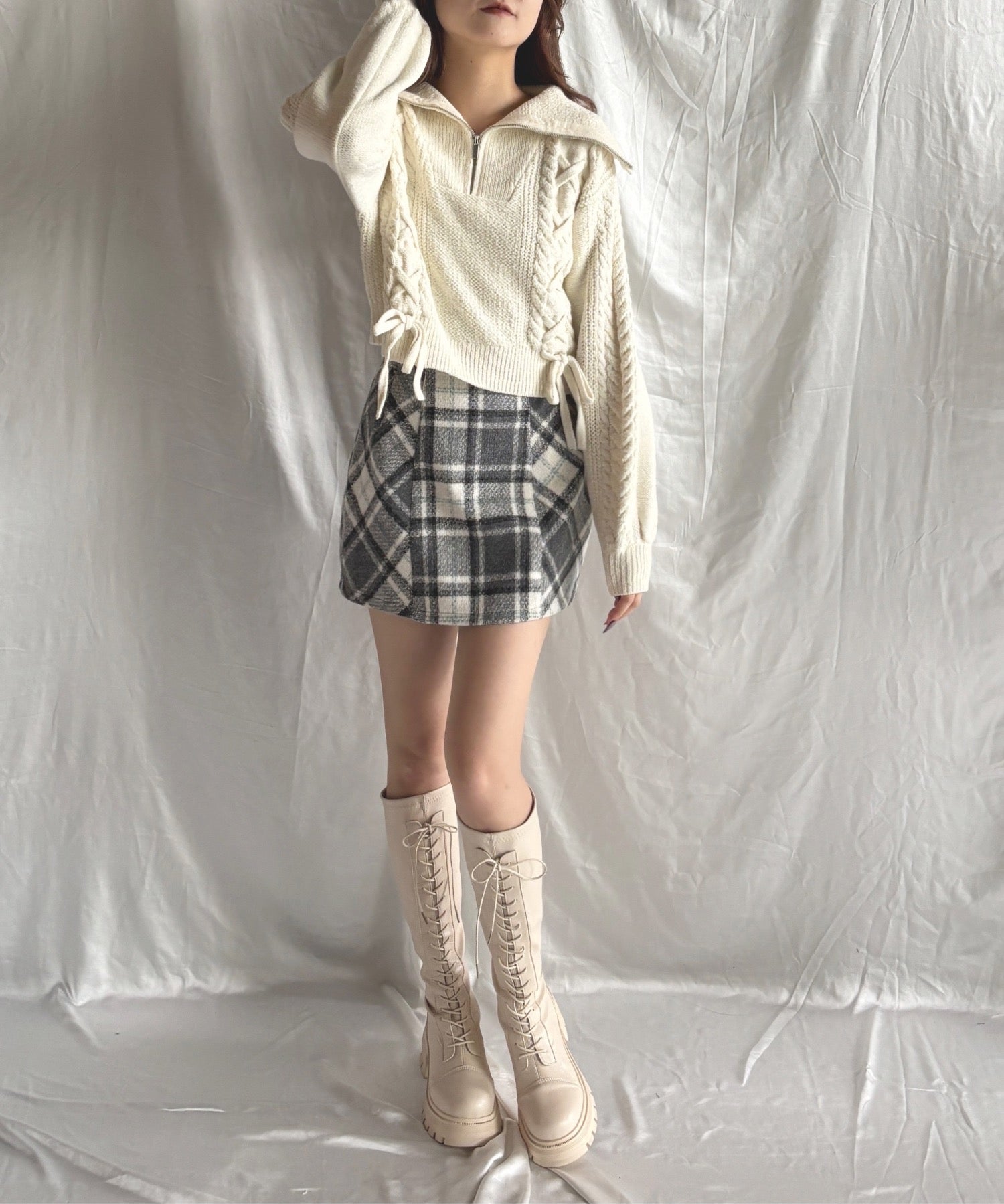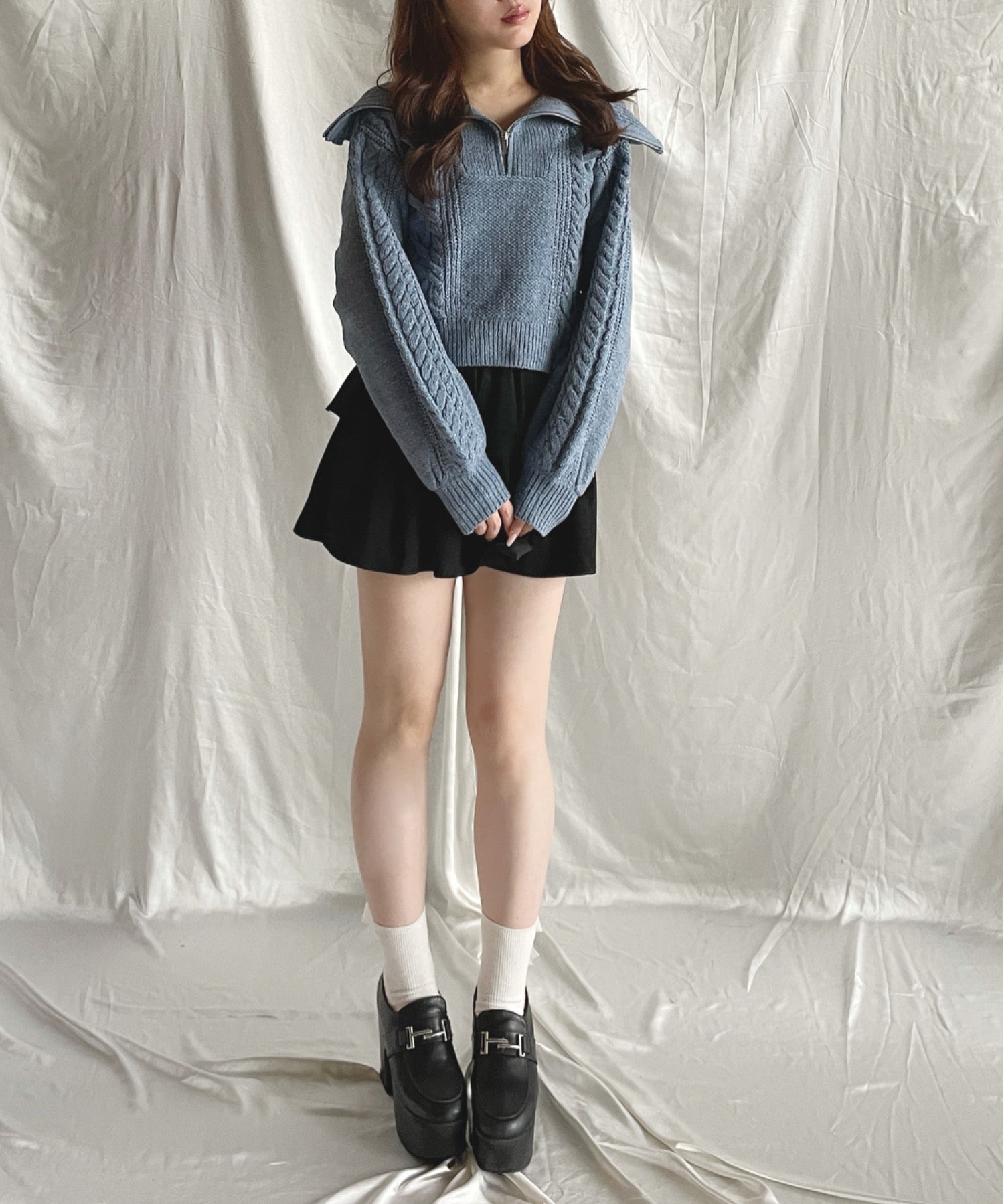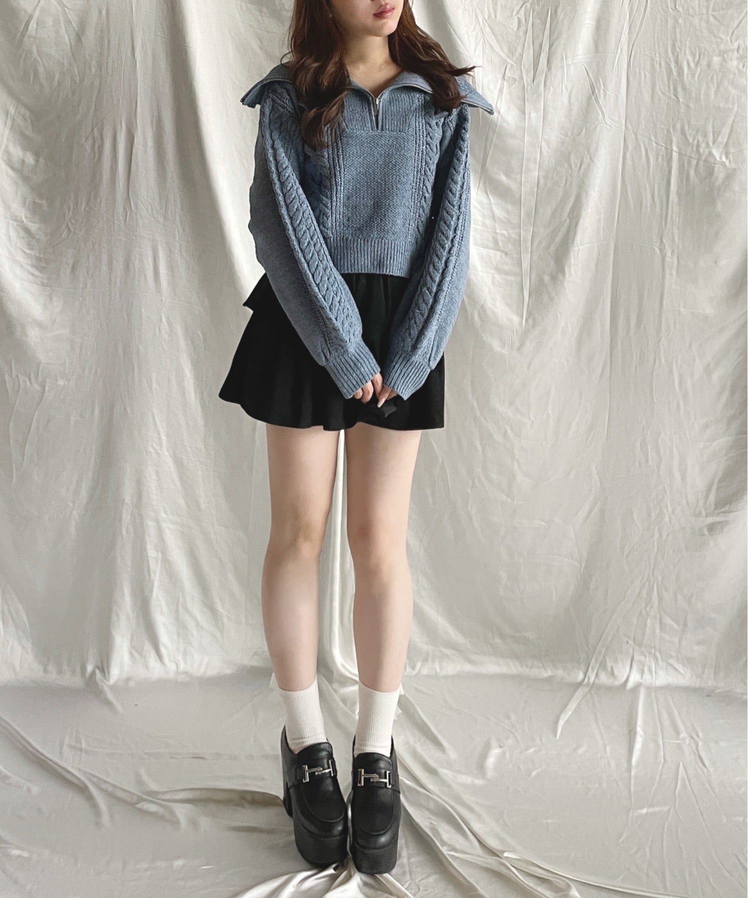 ・ガーリーなレーシングと、カジュアルな印象のハーフジップが合わさったデザインで、何にでも合わせやすい万能ニットに!