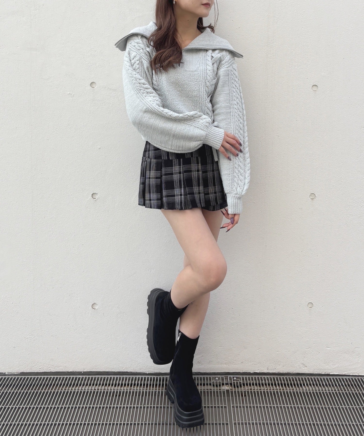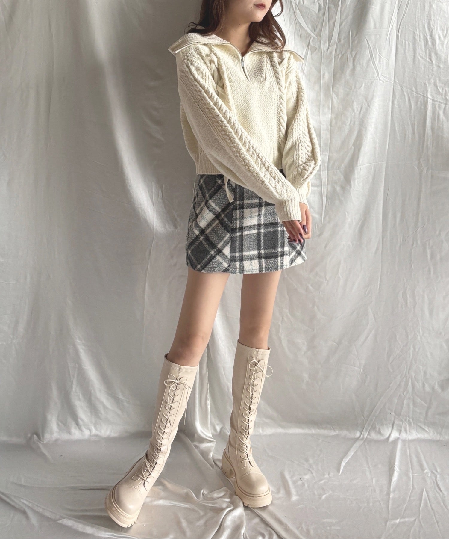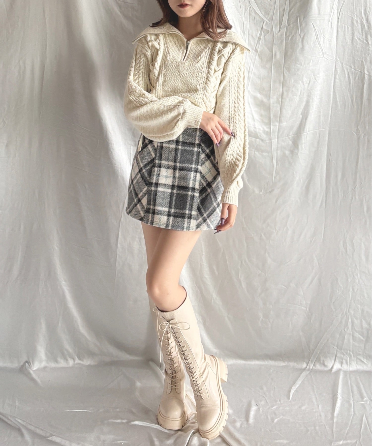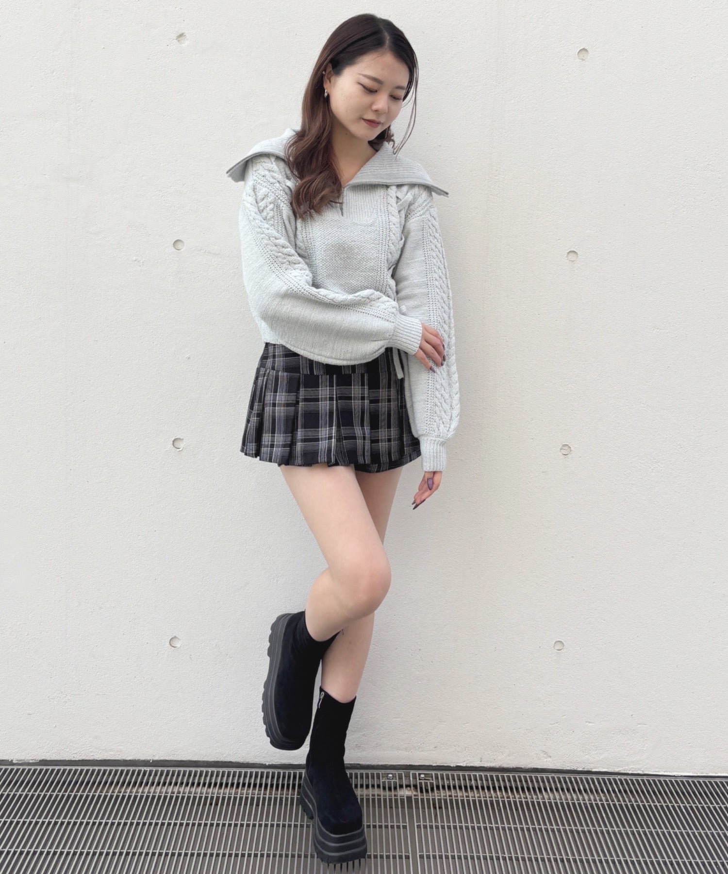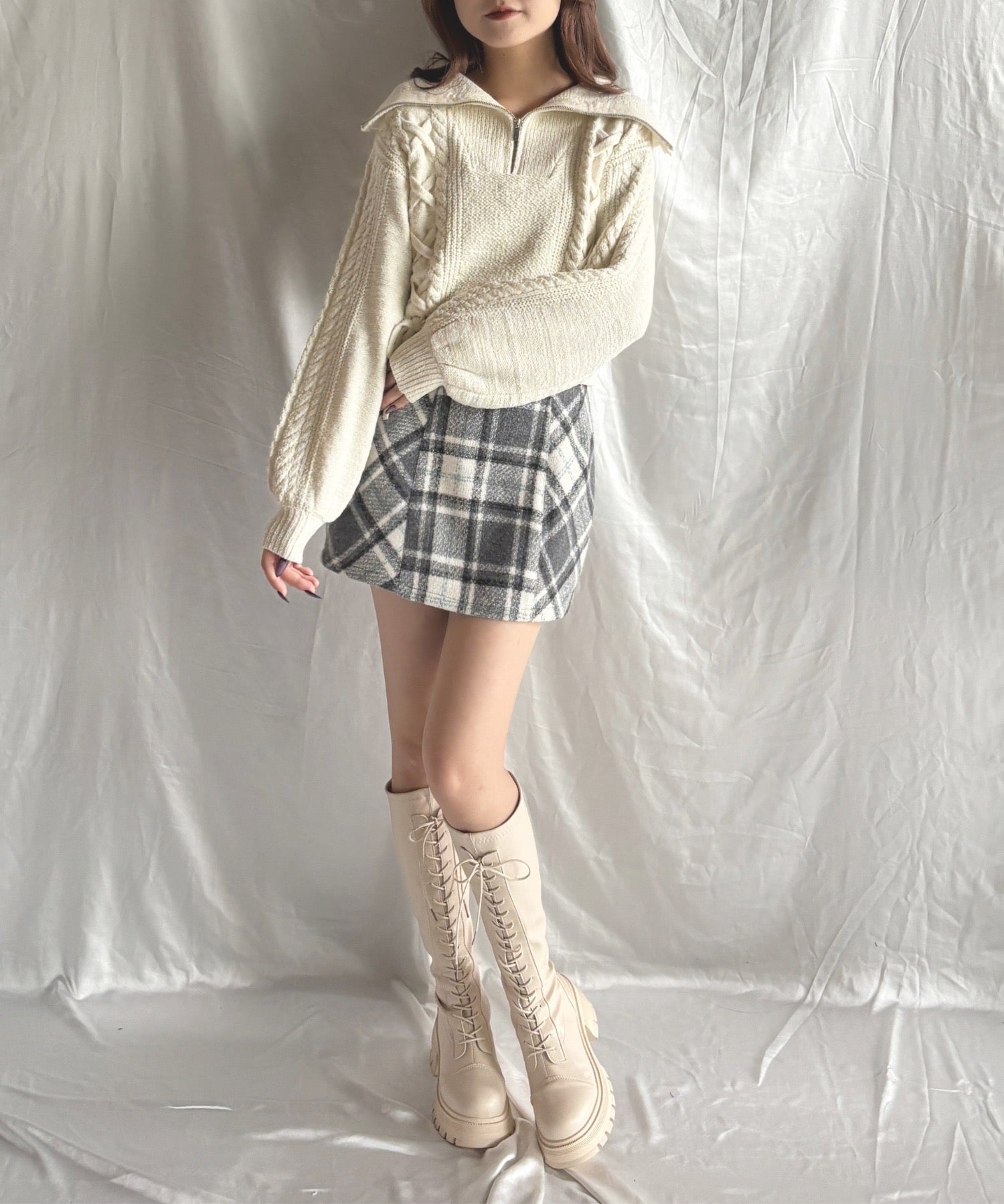 ・ガーリーなレーシングと、カジュアルな印象のハーフジップが合わさったデザインで、何にでも合わせやすい万能ニットに!