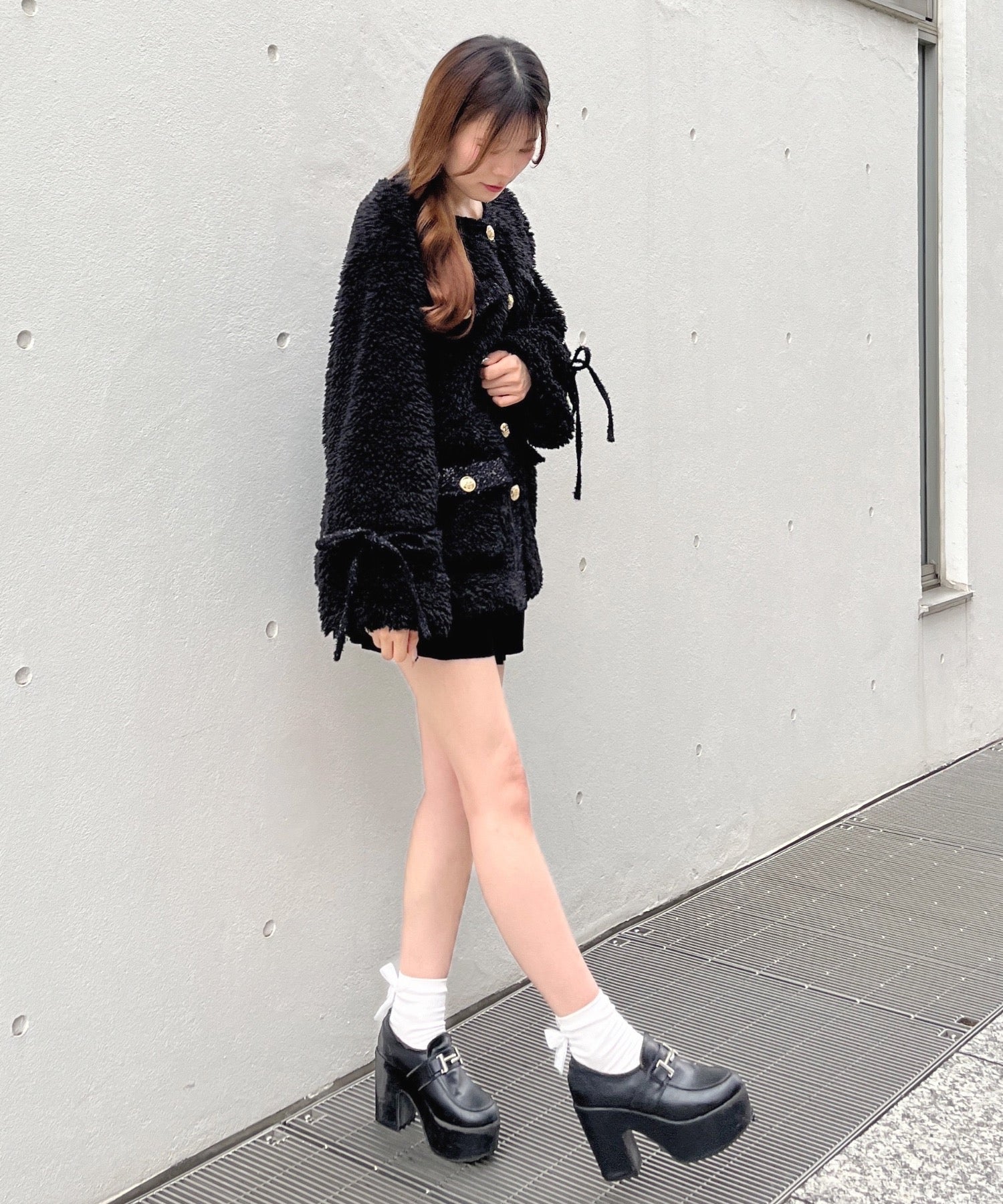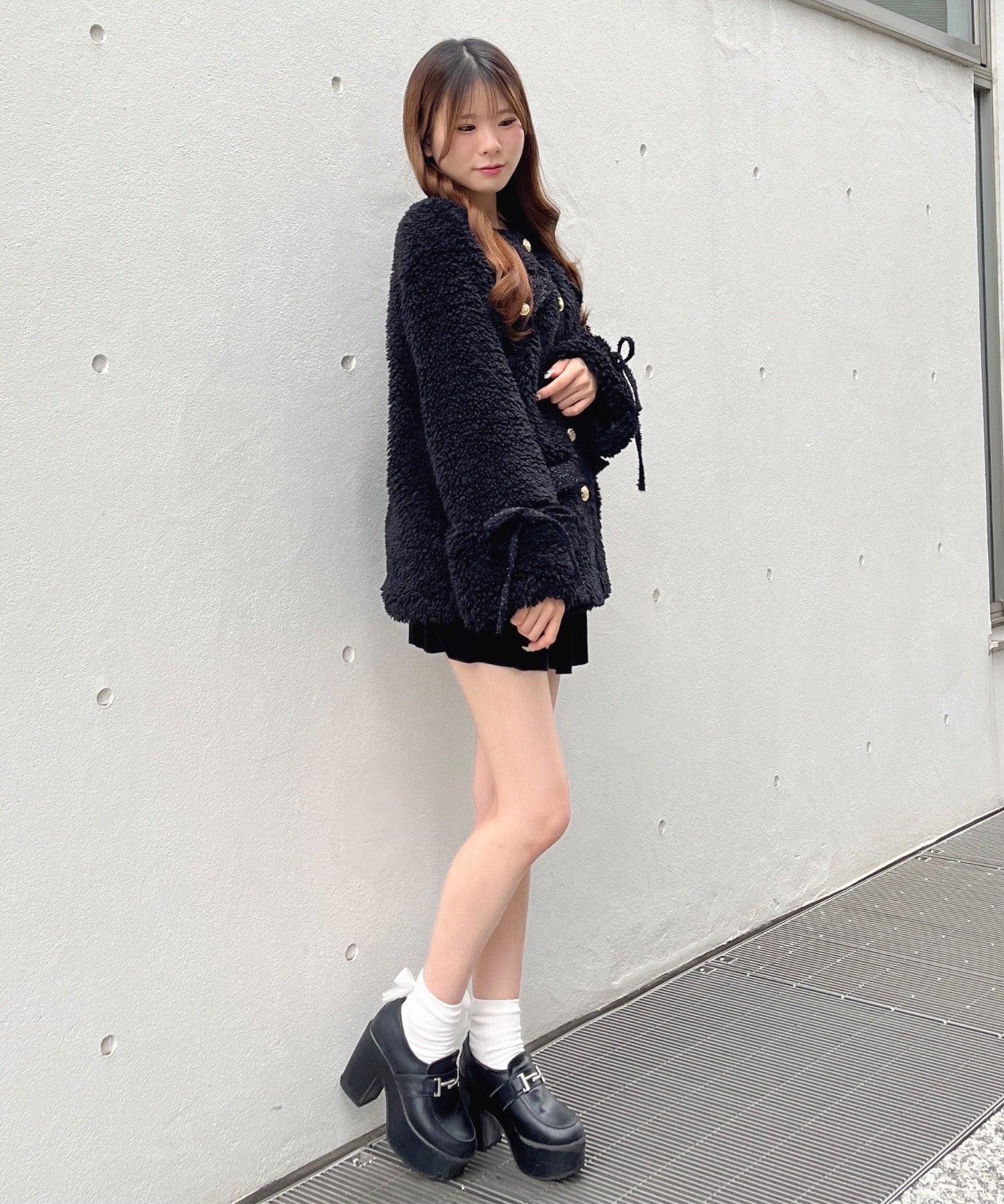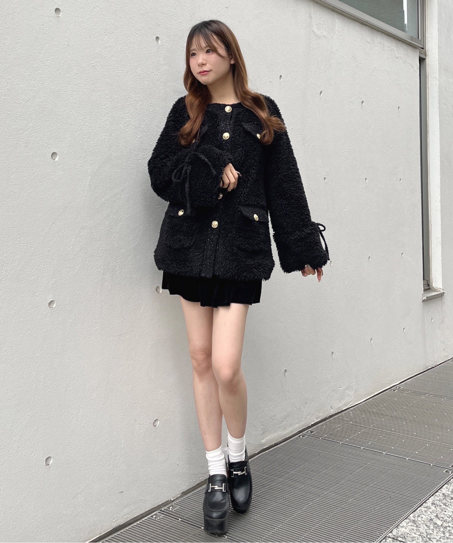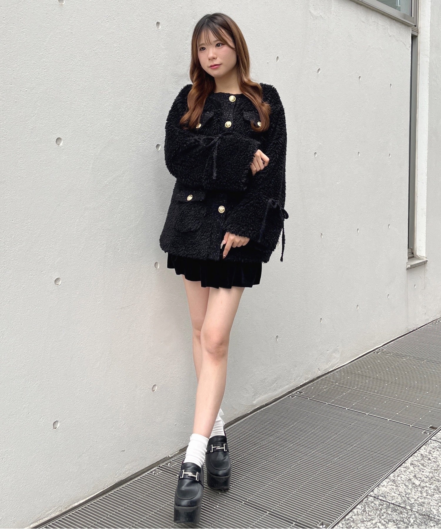 ・やや長めのアウターなので、ミニ丈のボトムスを裾からチラ見セするのが可愛い♡