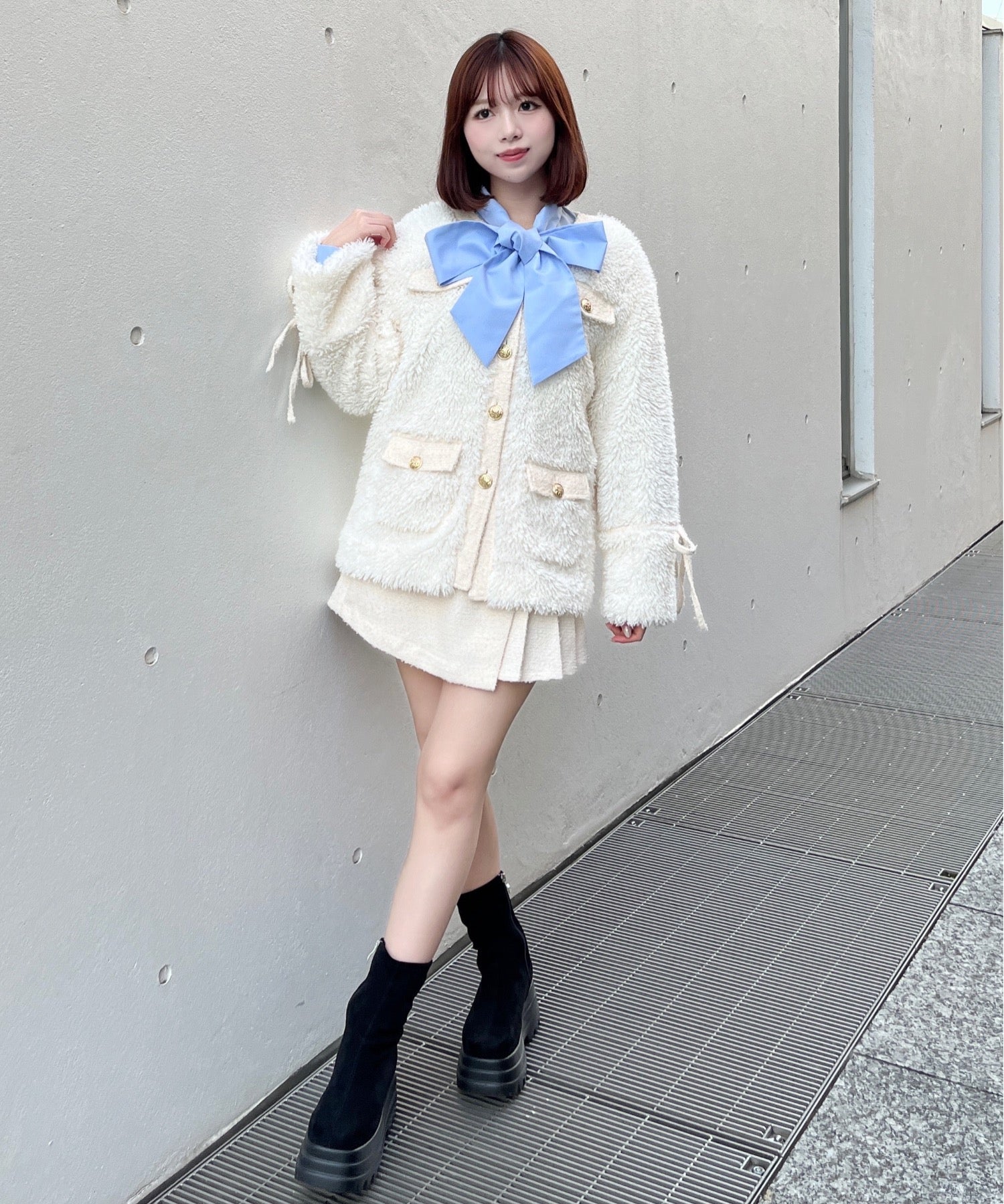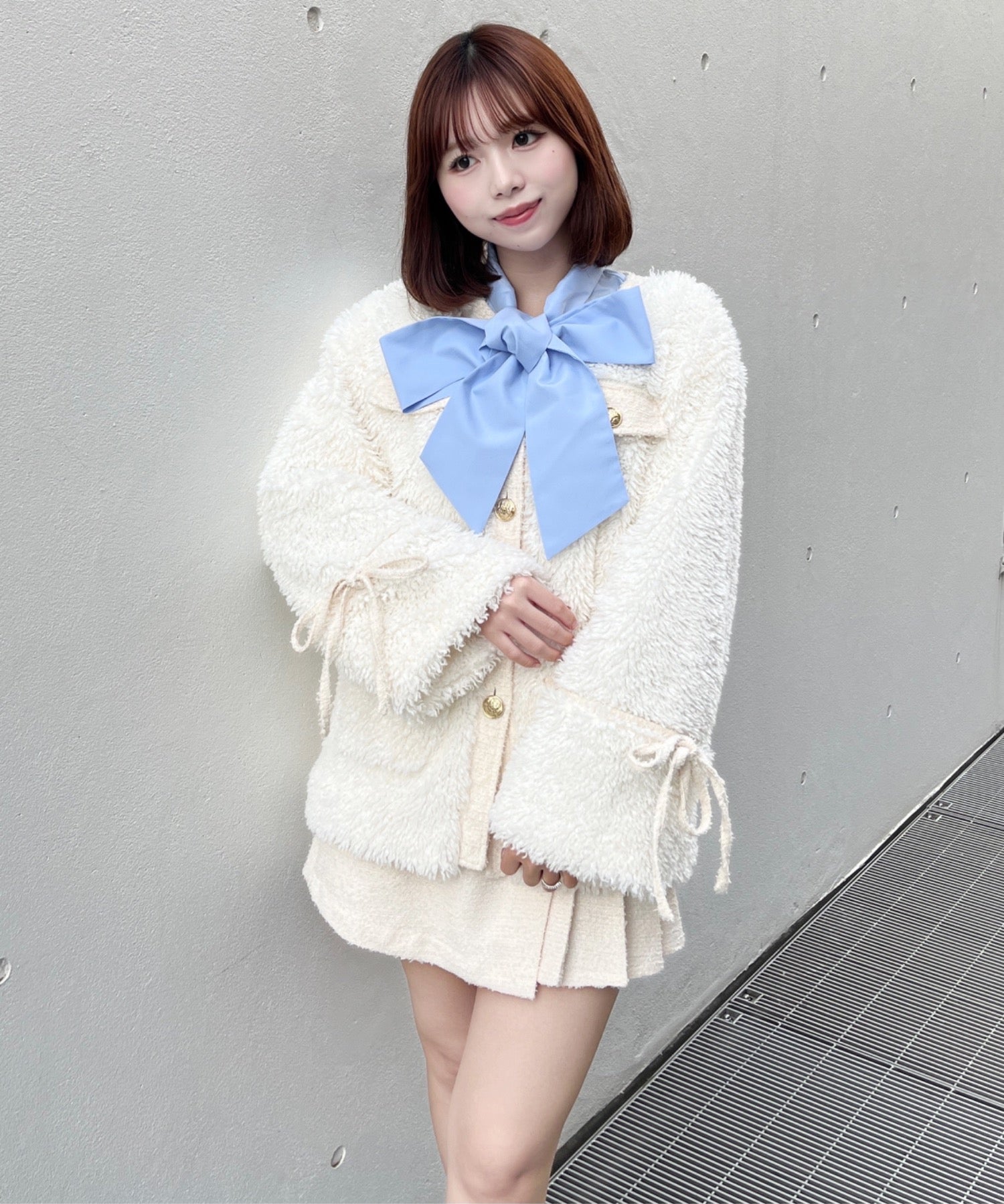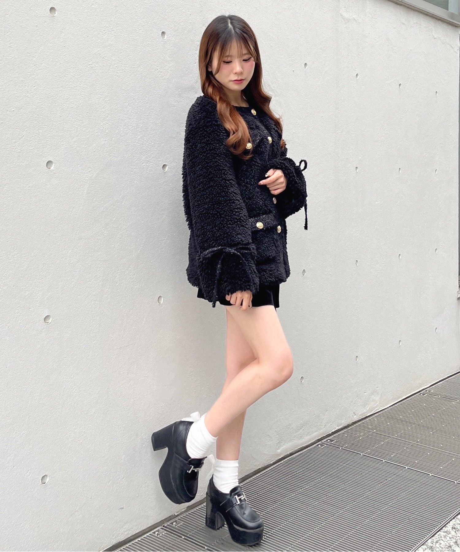 ・やや長めのアウターなので、ミニ丈のボトムスを裾からチラ見セするのが可愛い♡