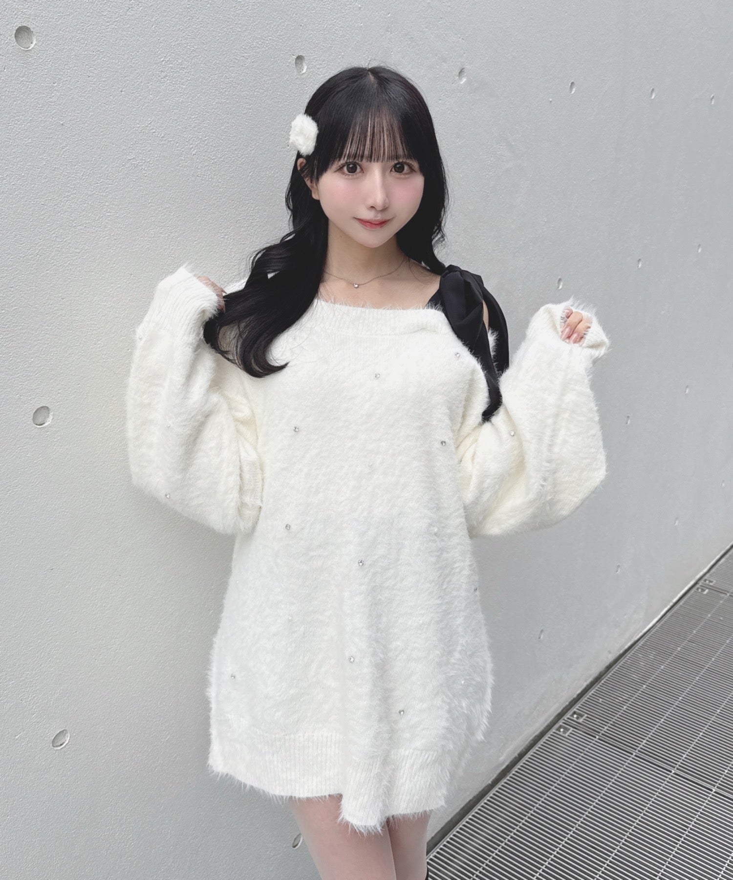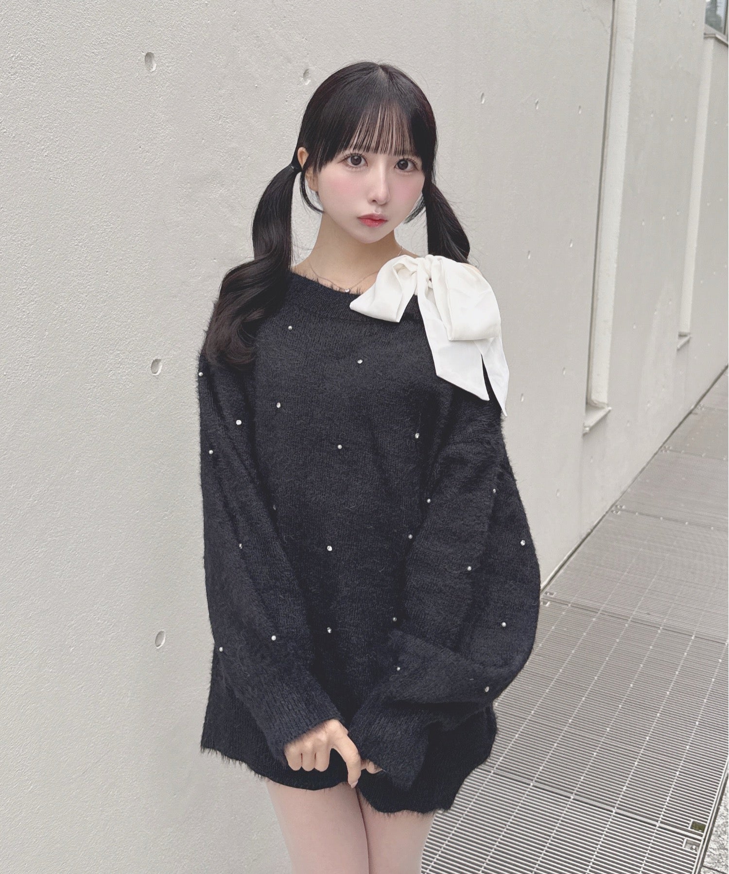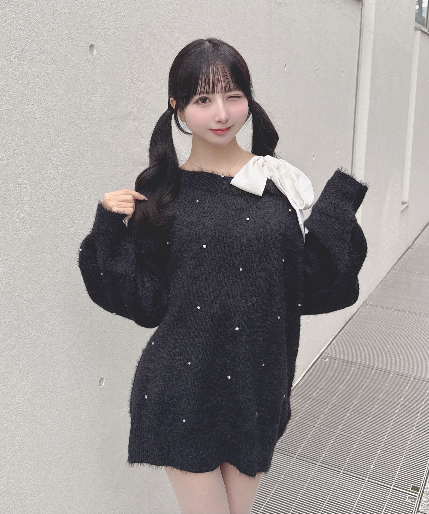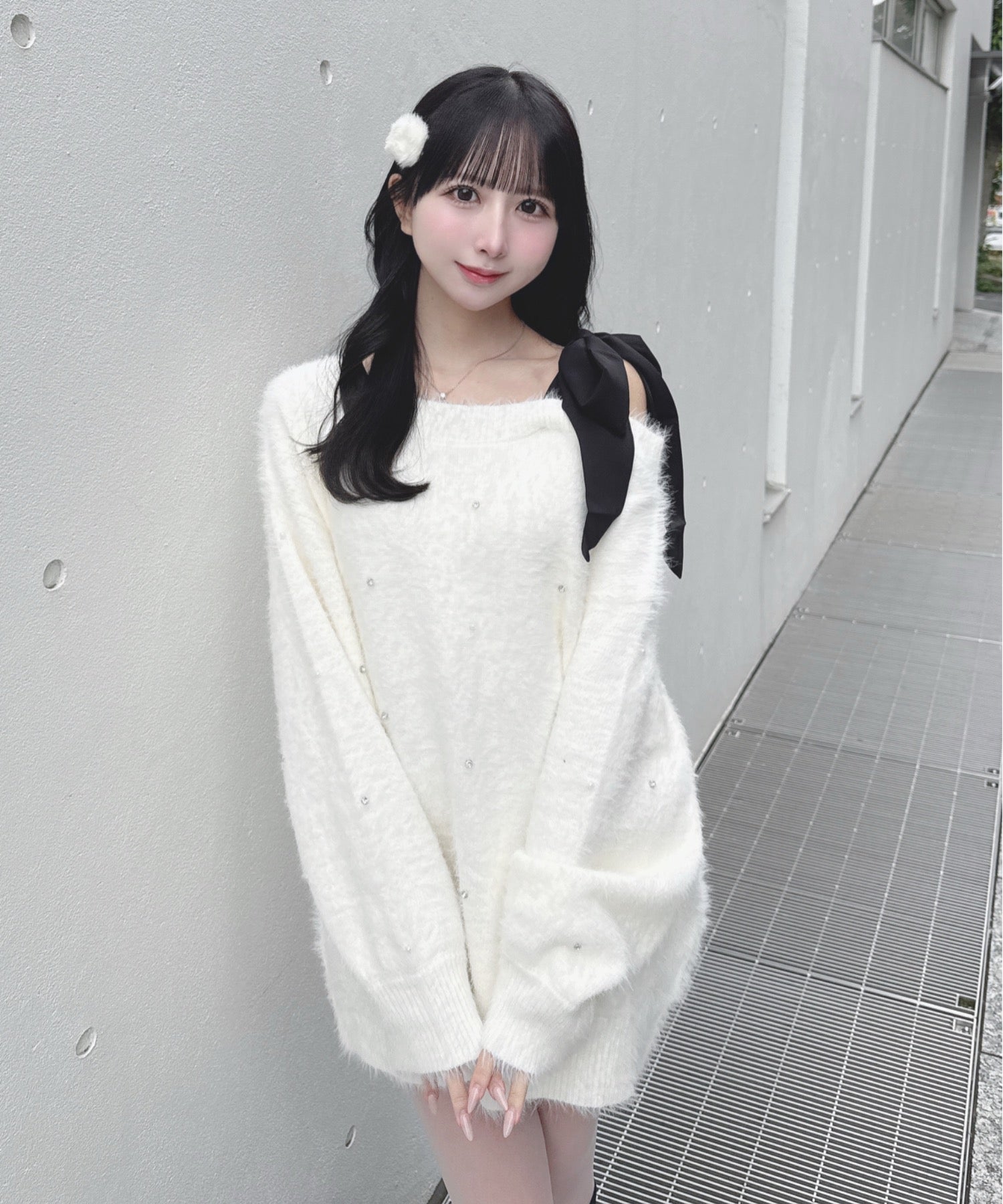 【予約商品 12月下旬発送】ビジュー肩リボンニット