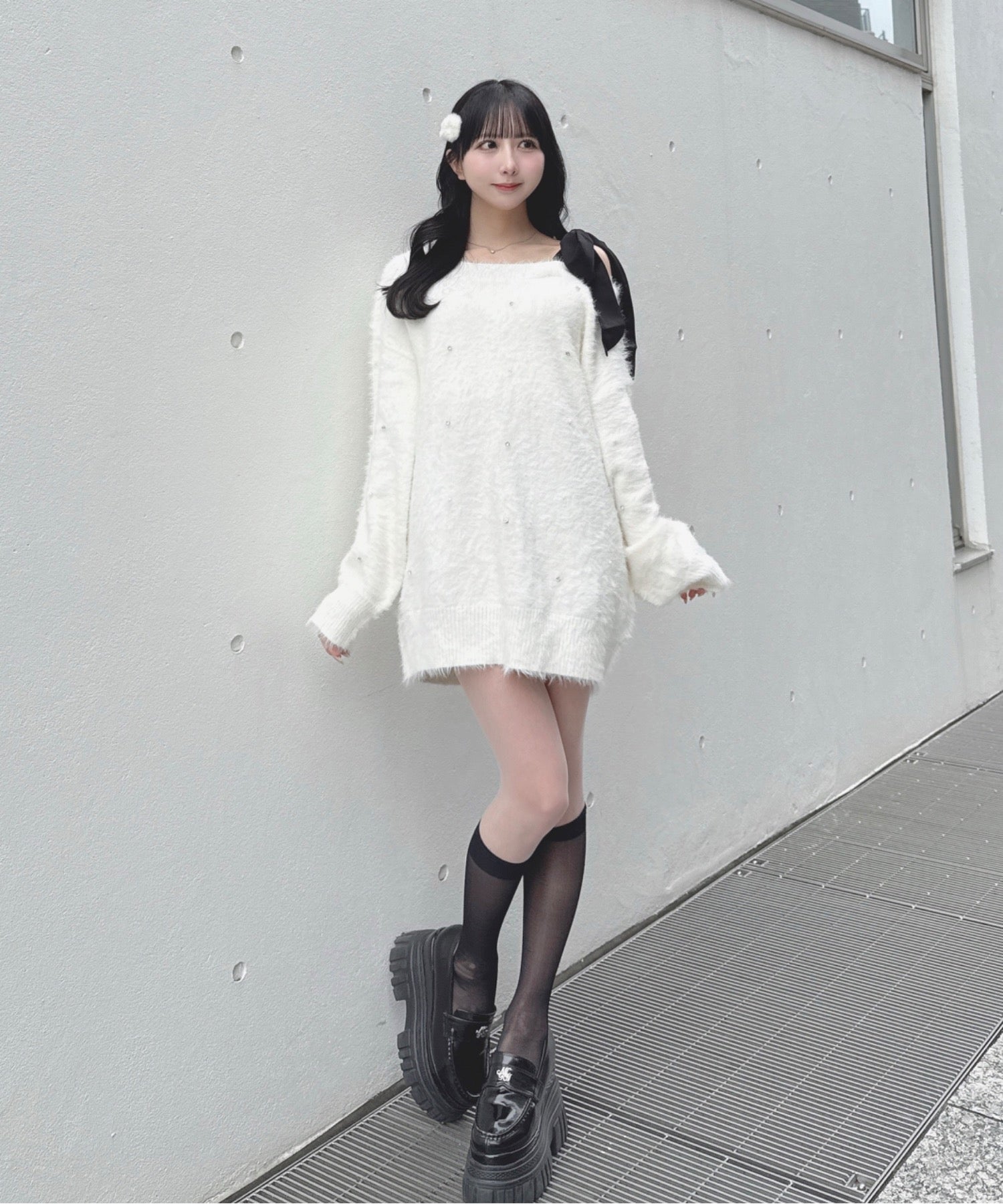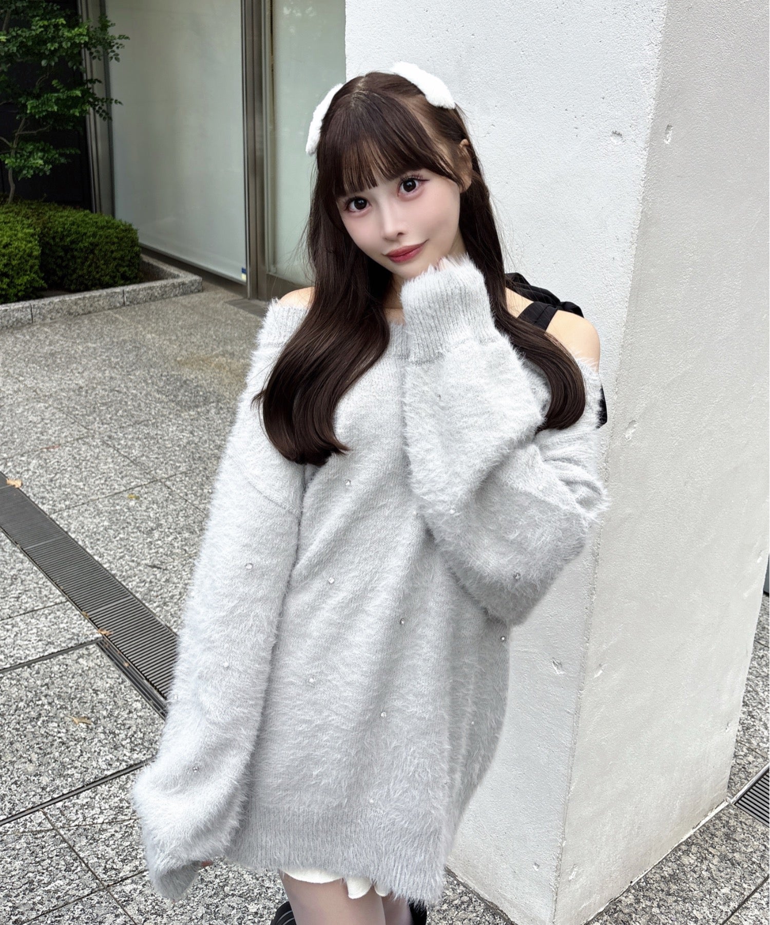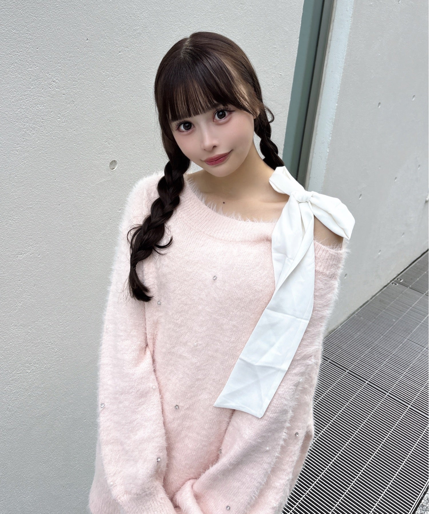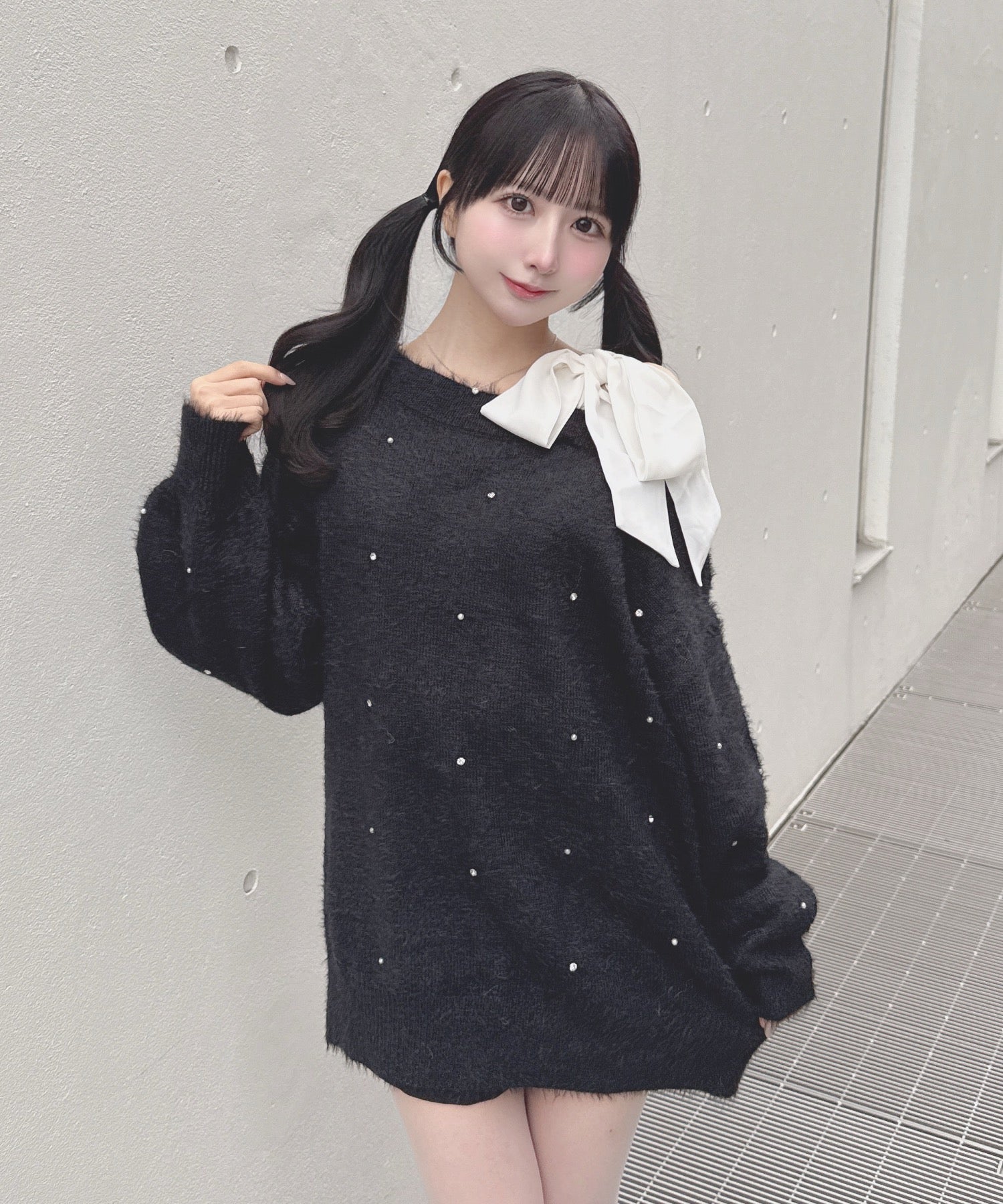 【予約商品 12月下旬発送】ビジュー肩リボンニット
