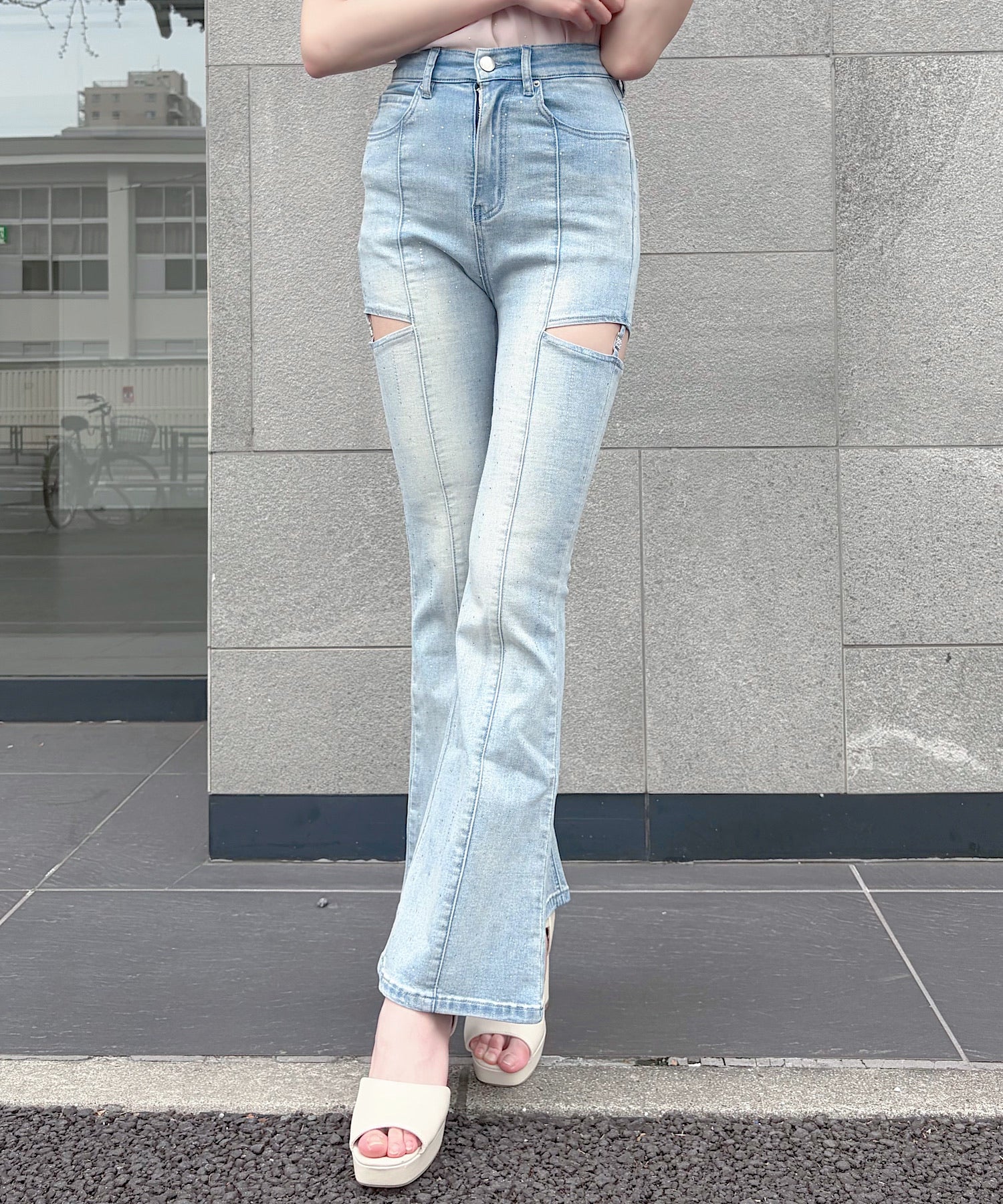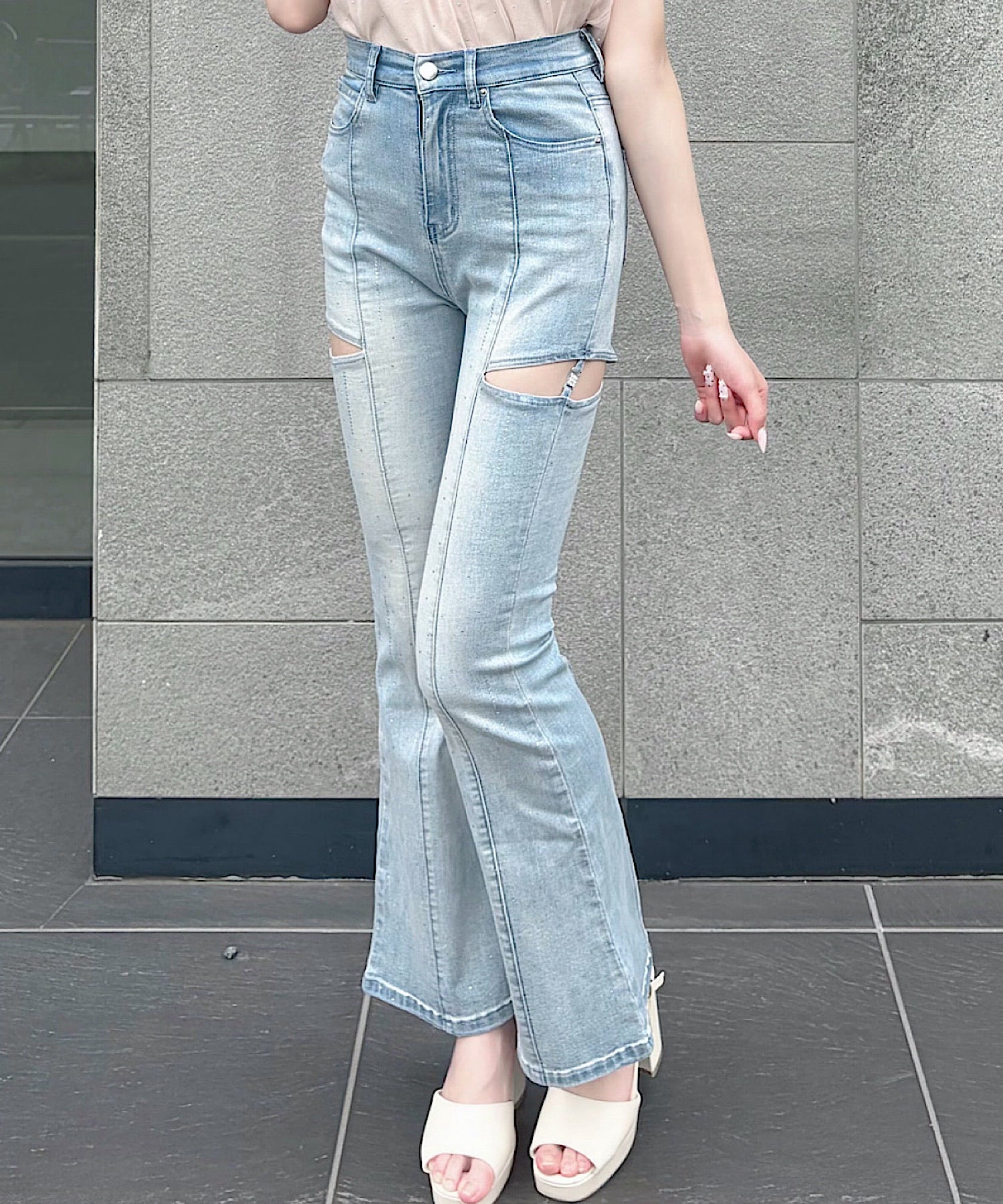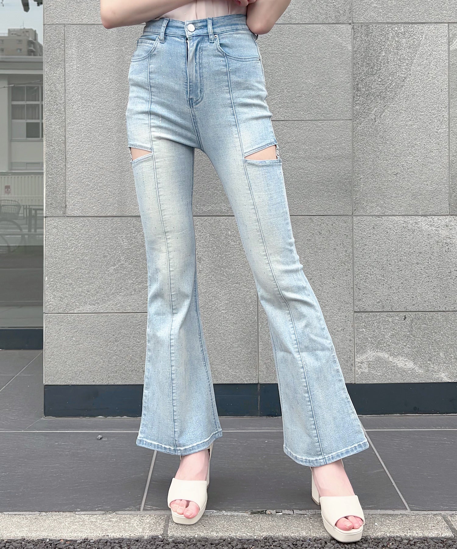 ・キラキラのラインビジューとサイドのカットアウトが大人可愛いフレアデニム♡