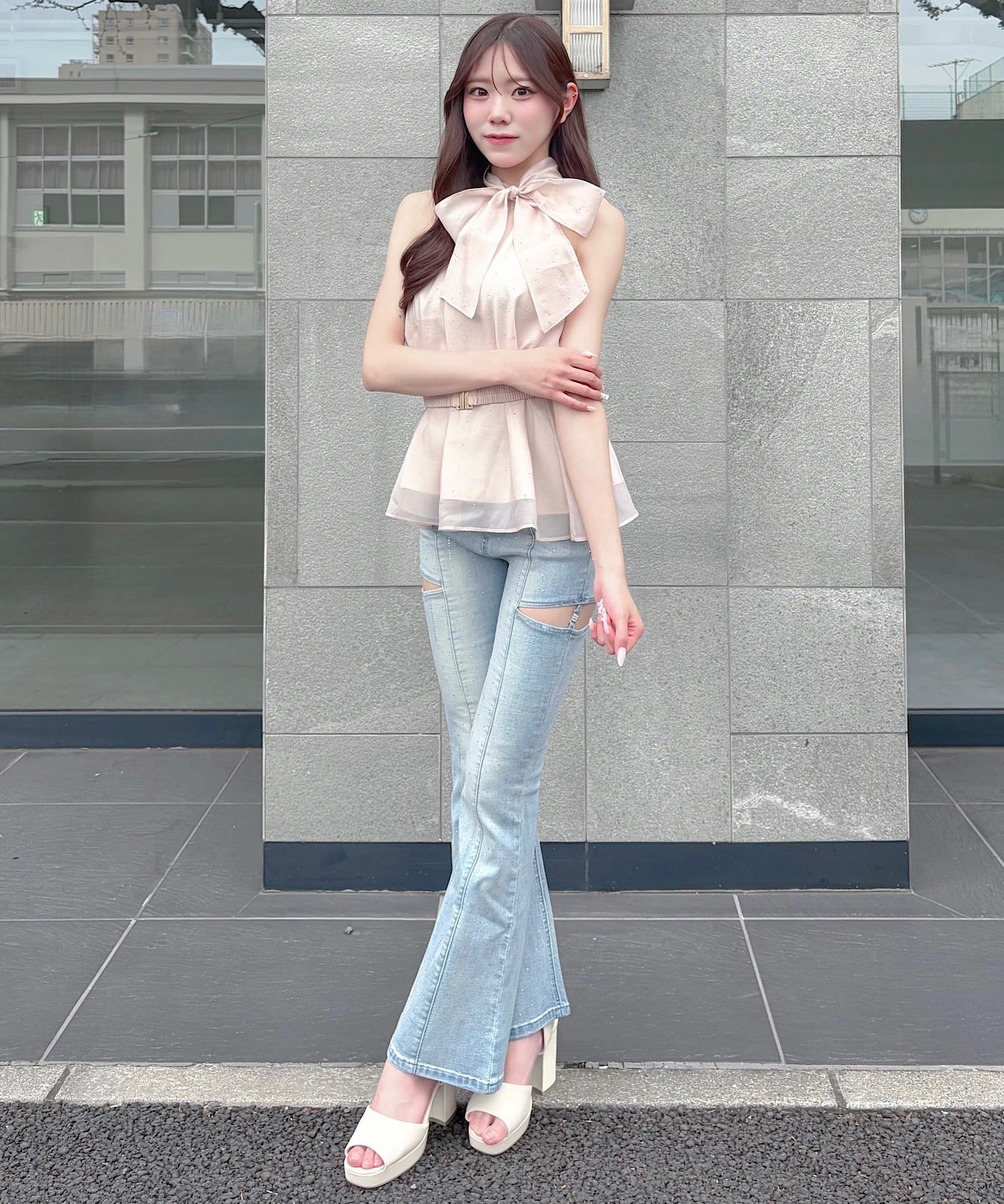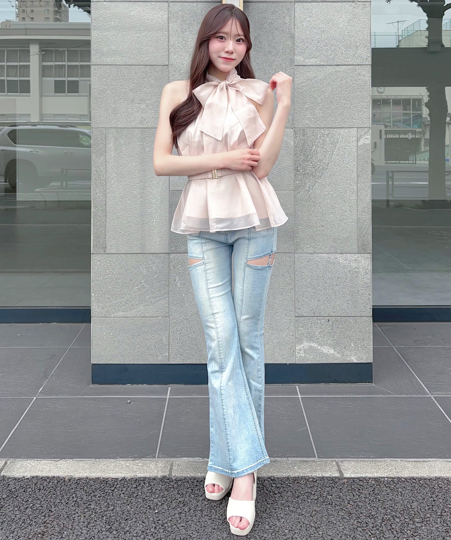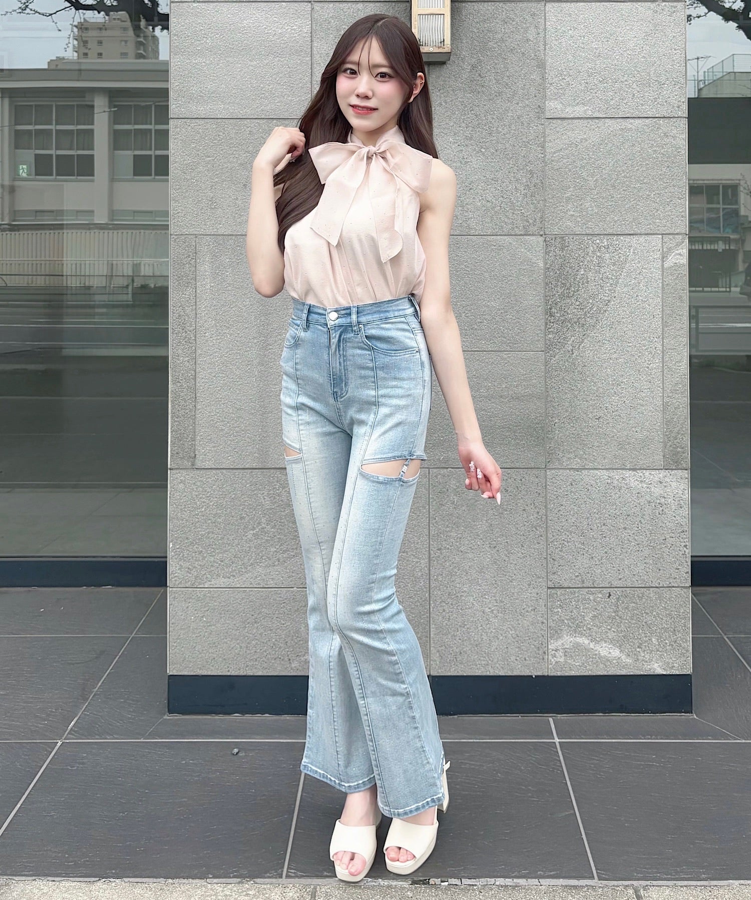 ・キラキラのラインビジューとサイドのカットアウトが大人可愛いフレアデニム♡